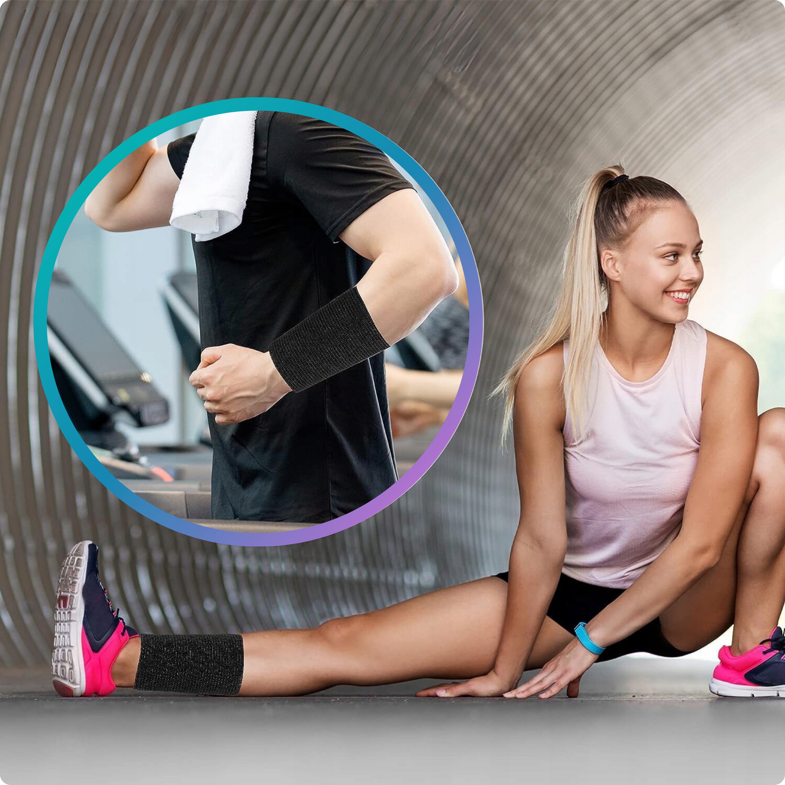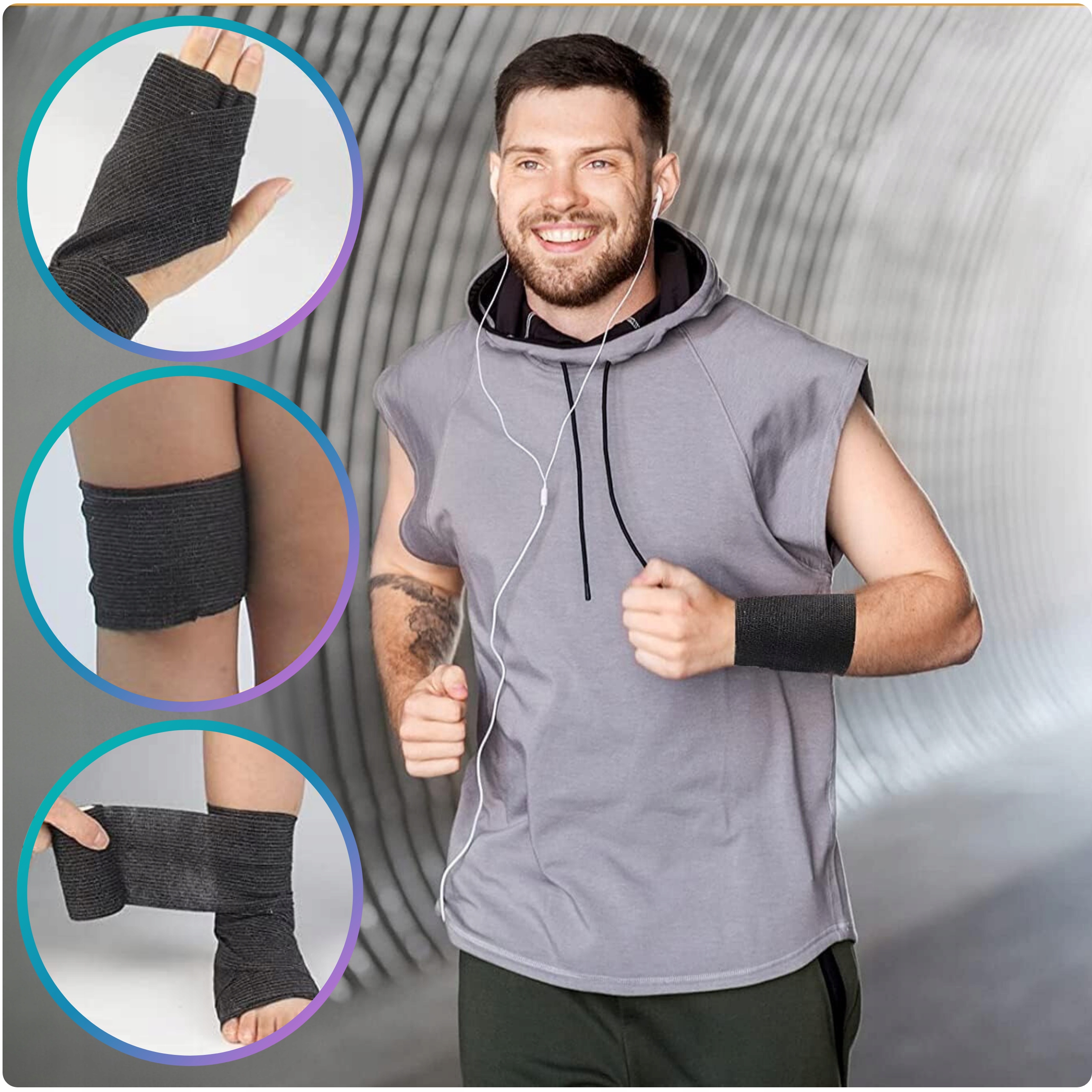 • Sport: podtrzymanie i kompresja, pomoc w stabilizacji stawów i mięśni, profilaktyka drobnych urazów.