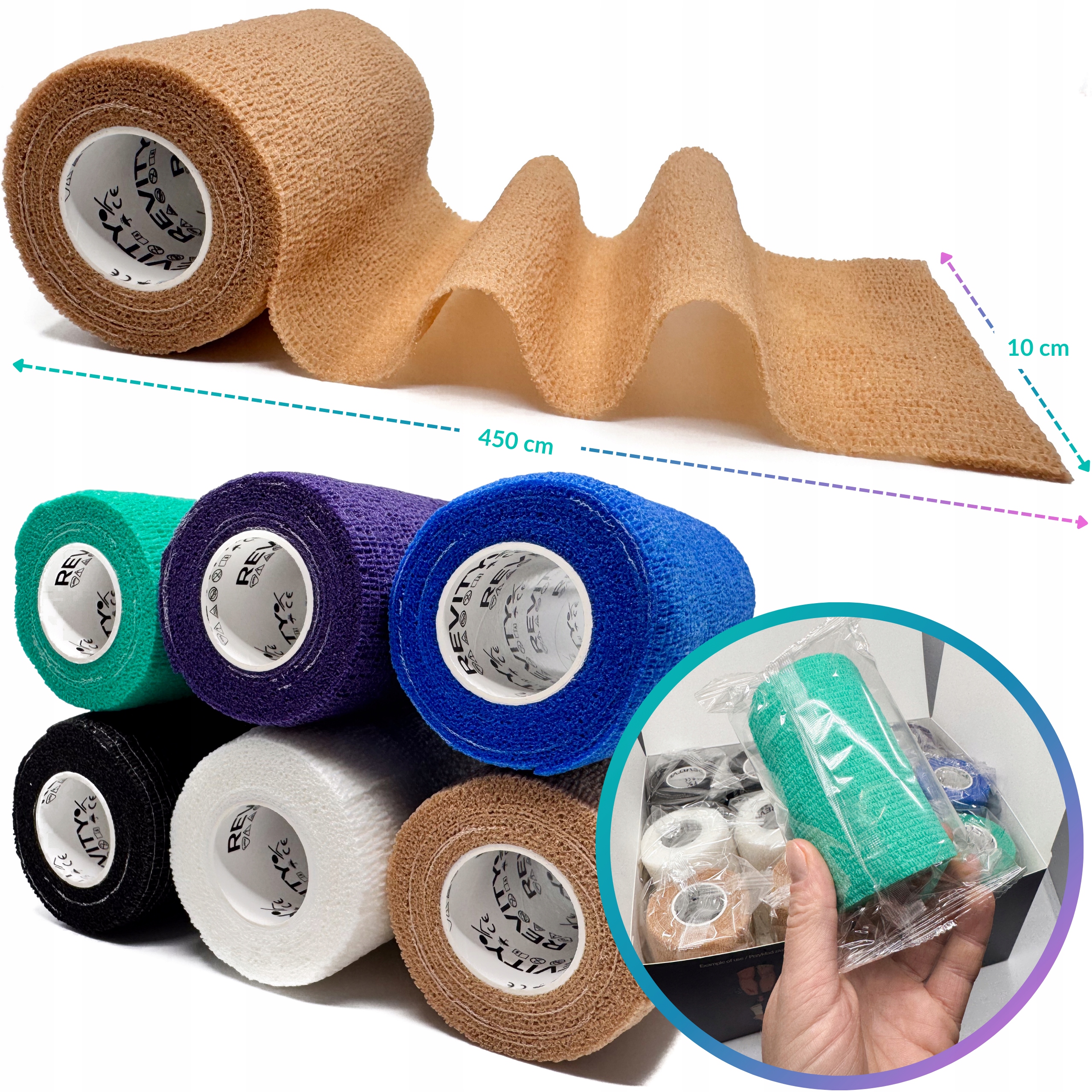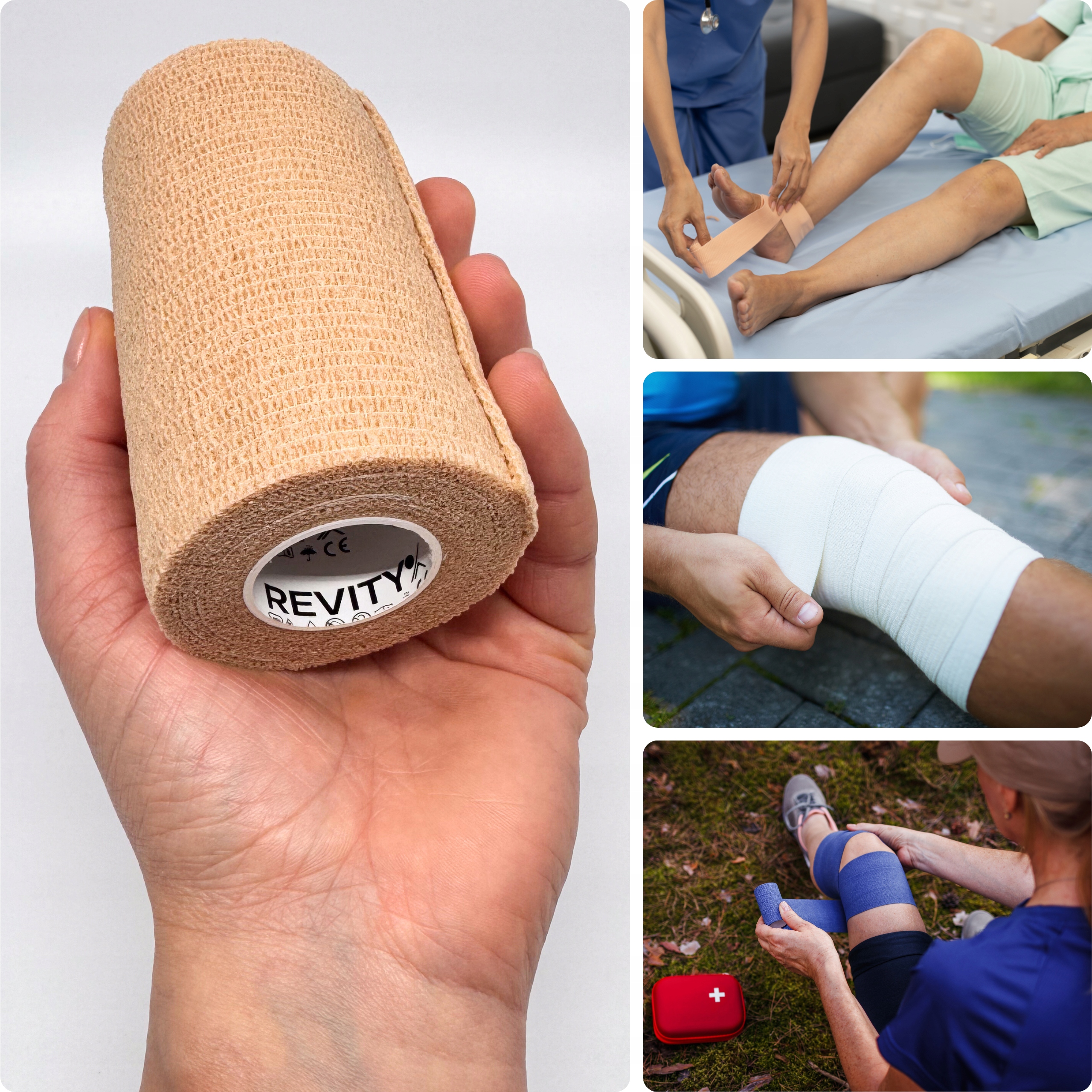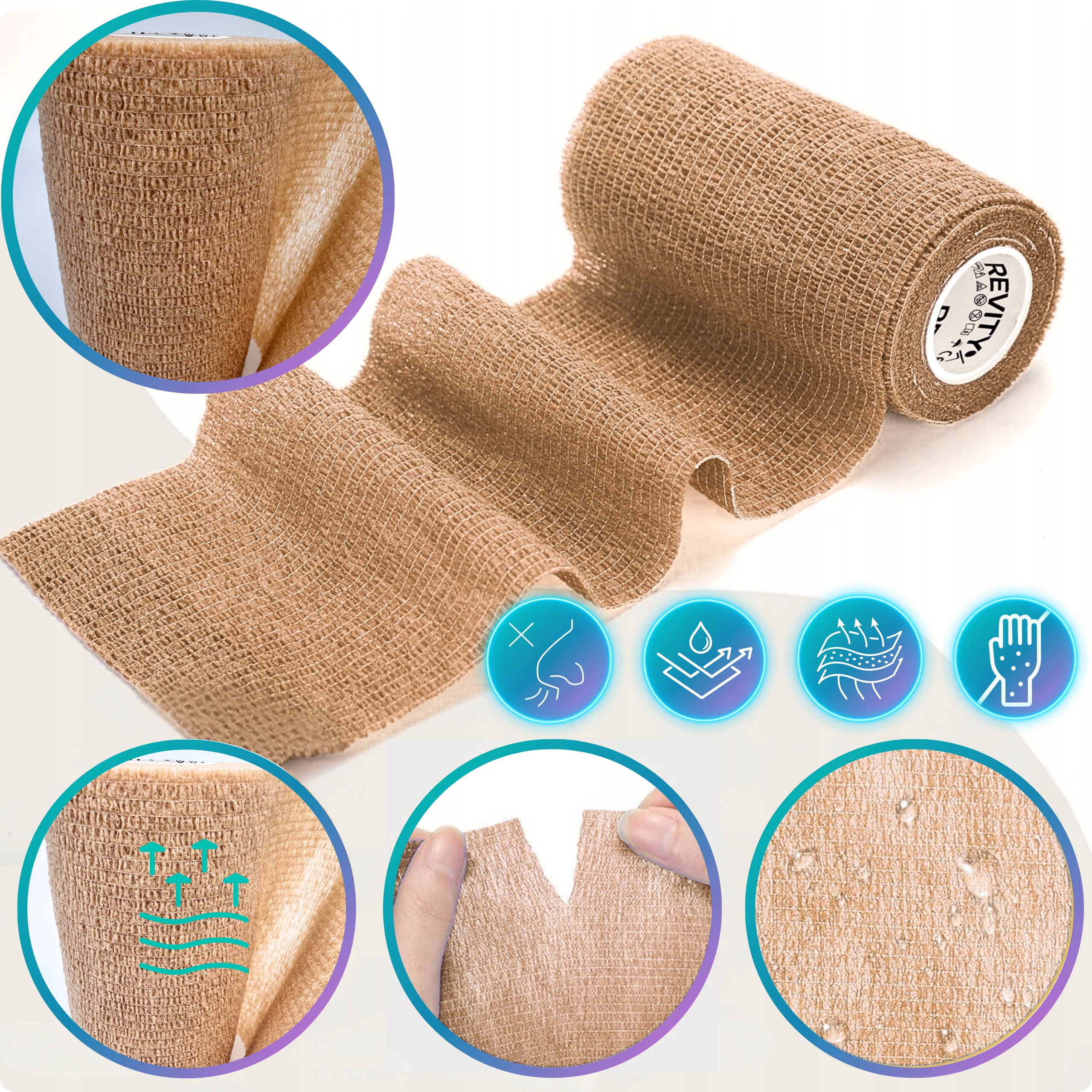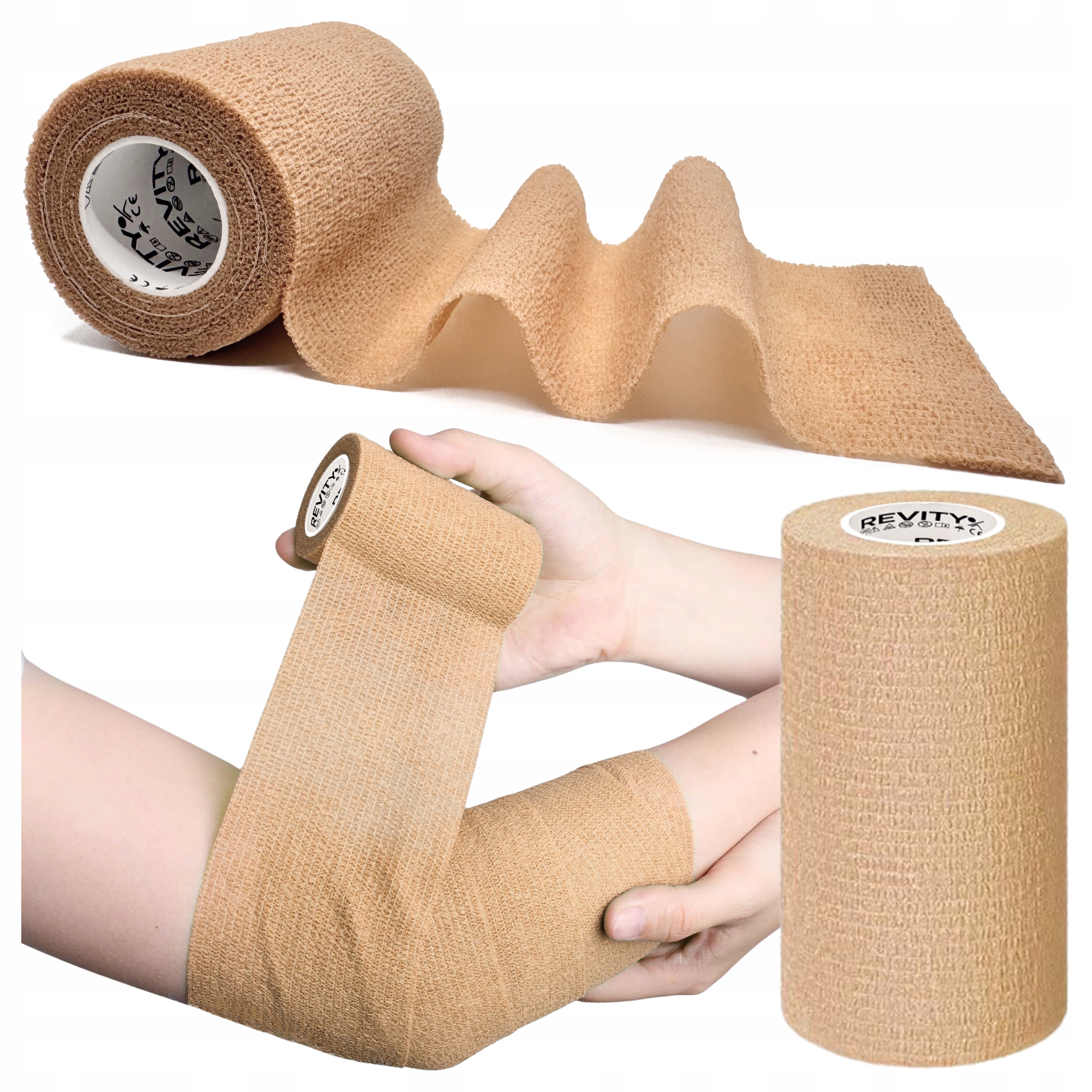 Bandaż kohezyjny (samoprzylepny) Revity to elastyczny opatrunek, który przylega wyłącznie do siebie, a nie klei się do skóry, włosów ani odzieży. Jest przepuszczalny dla powietrza, nie nasiąka wodą i po nałożeniu nie strzępi się. Można go rwać ręcznie — bez nożyczek i bez dodatkowych zapinek. Produkt przeznaczony dla ludzi i zwierząt; sprawdza się w sporcie, medycynie i weterynarii. Oznaczony jako wyrób medyczny klasy I z certyfikatem CE.