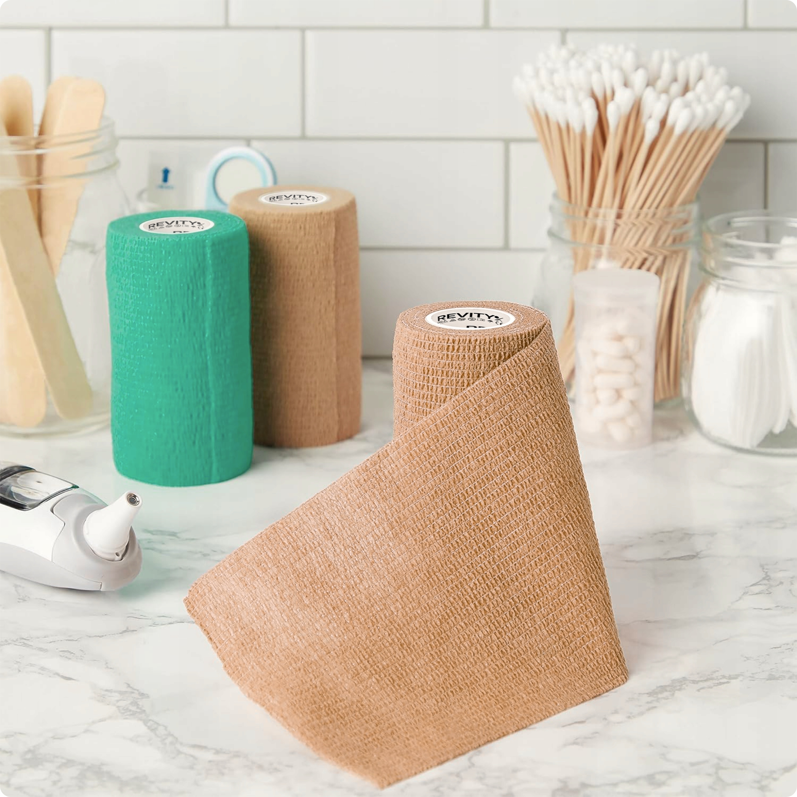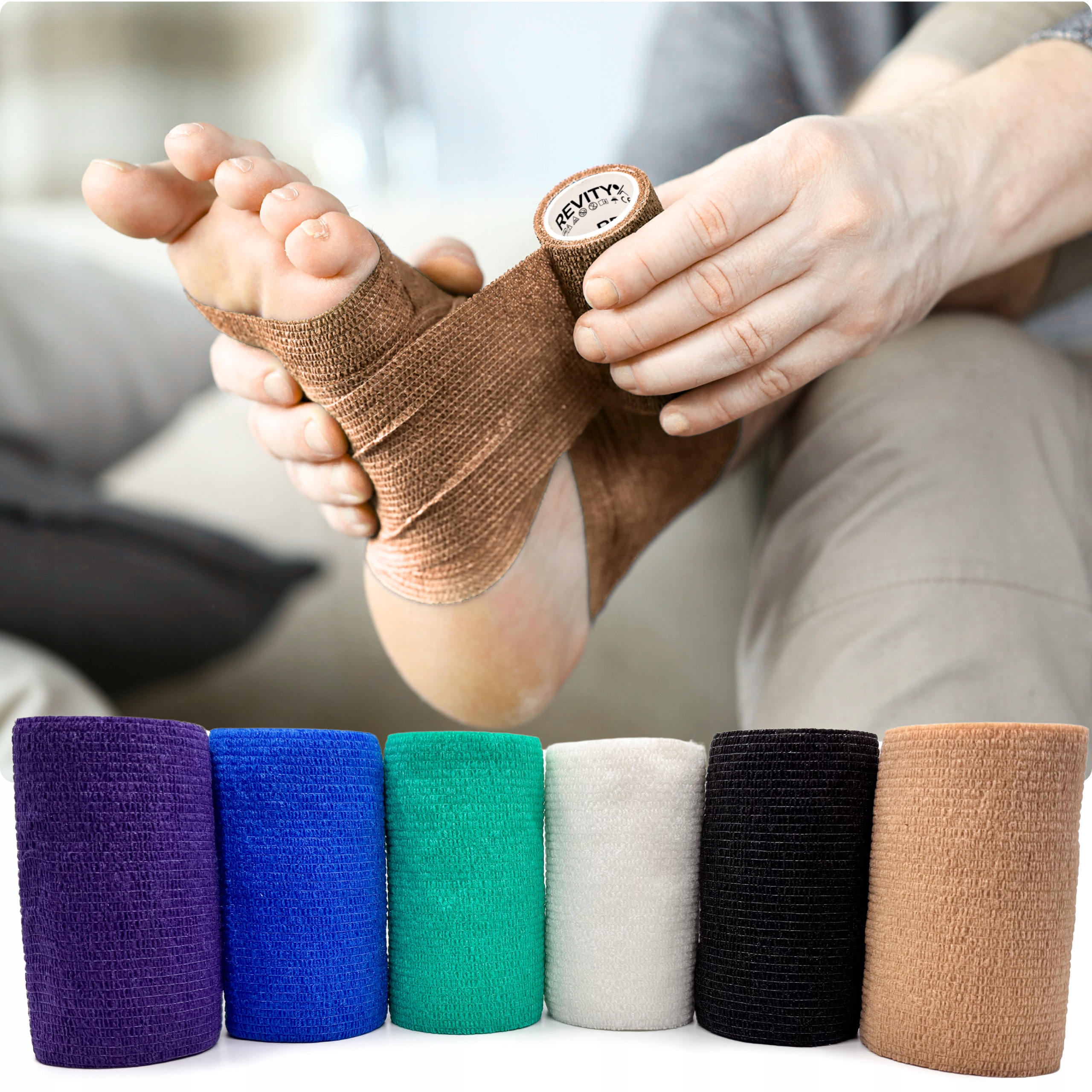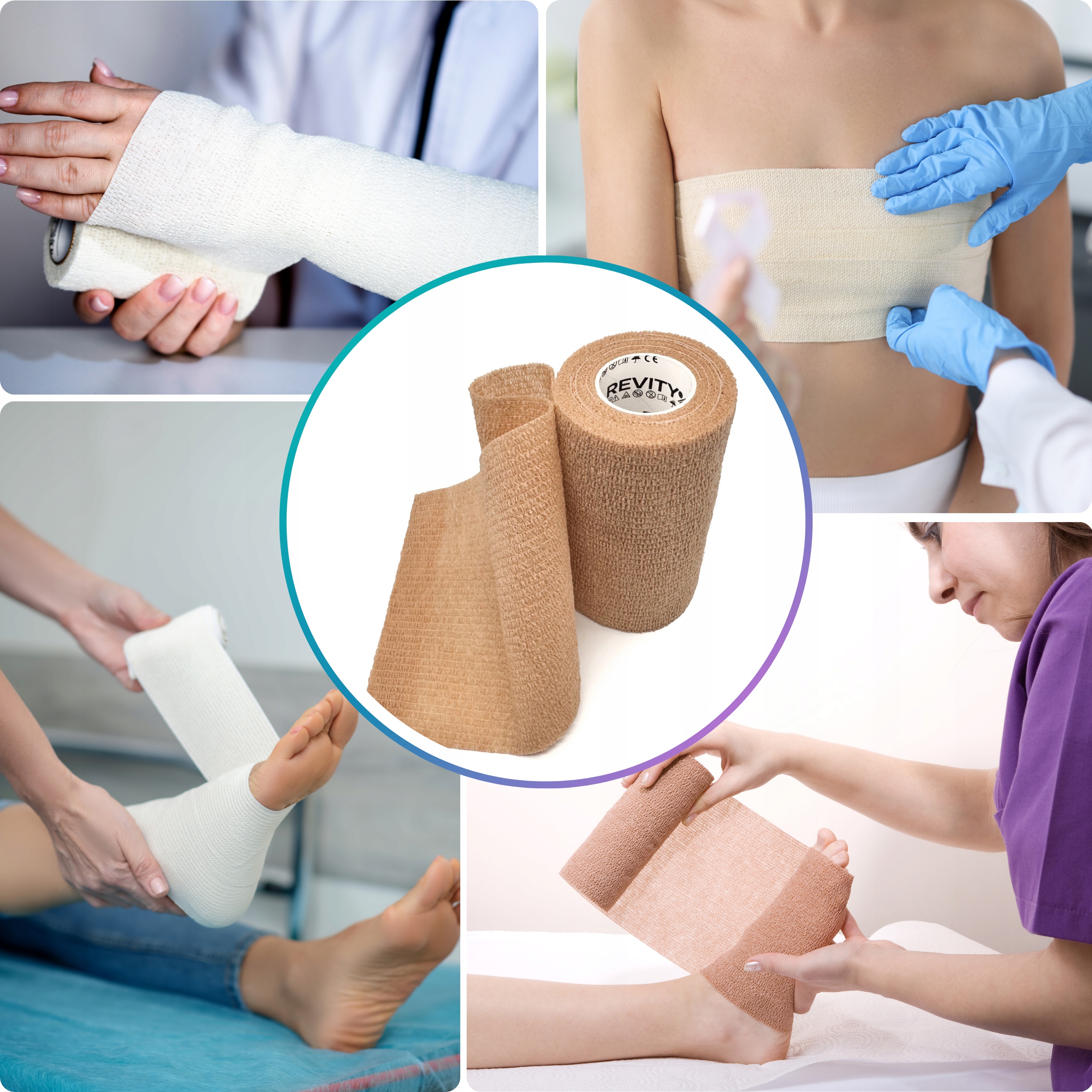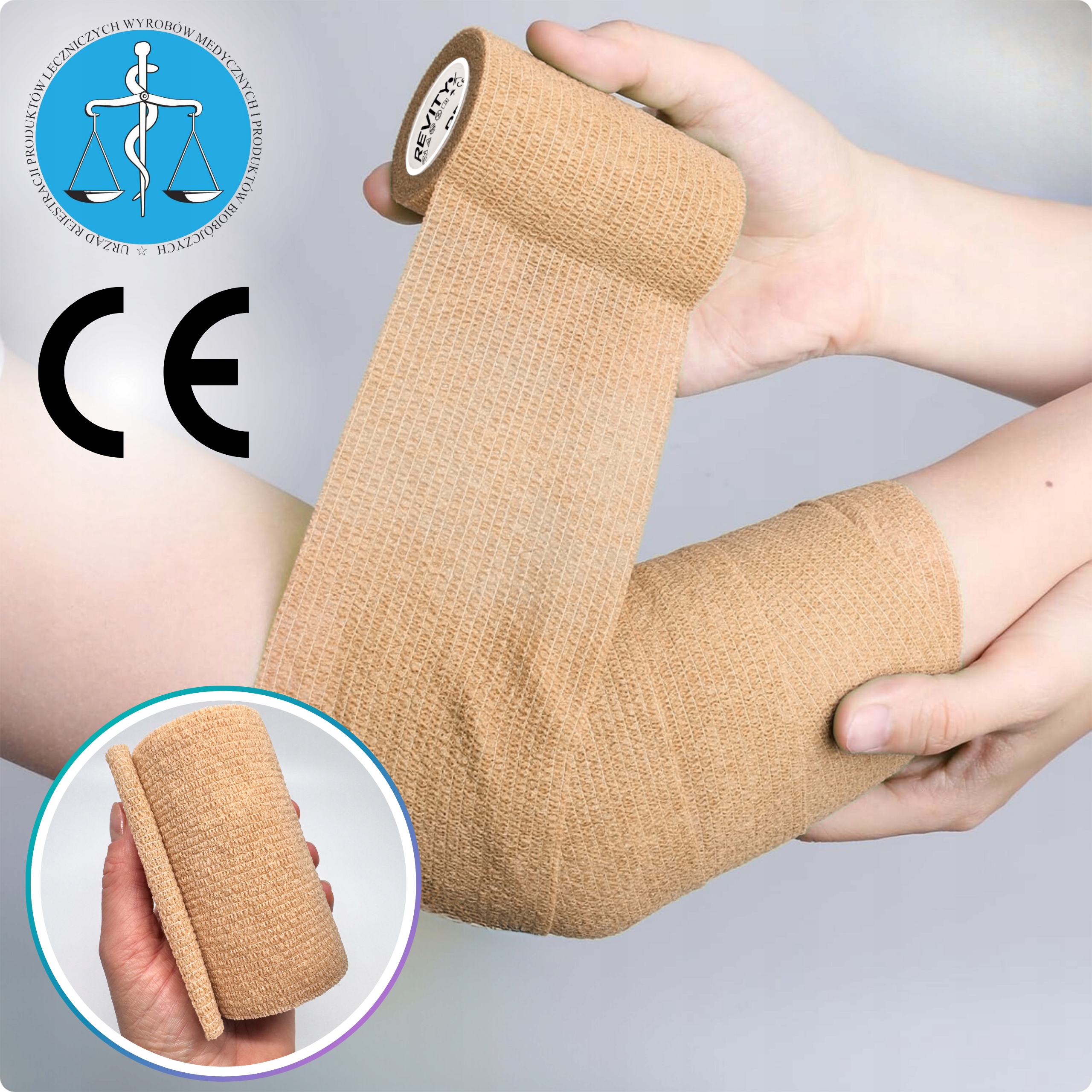 Bandaż kohezyjny (samoprzylepny) Revity to elastyczny opatrunek, który przylega wyłącznie do siebie, a nie klei się do skóry, włosów ani odzieży. Jest przepuszczalny dla powietrza, nie nasiąka wodą i po nałożeniu nie strzępi się. Można go rwać ręcznie — bez nożyczek i bez dodatkowych zapinek. Produkt przeznaczony dla ludzi i zwierząt; sprawdza się w sporcie, medycynie i weterynarii. Oznaczony jako wyrób medyczny klasy I z certyfikatem CE.