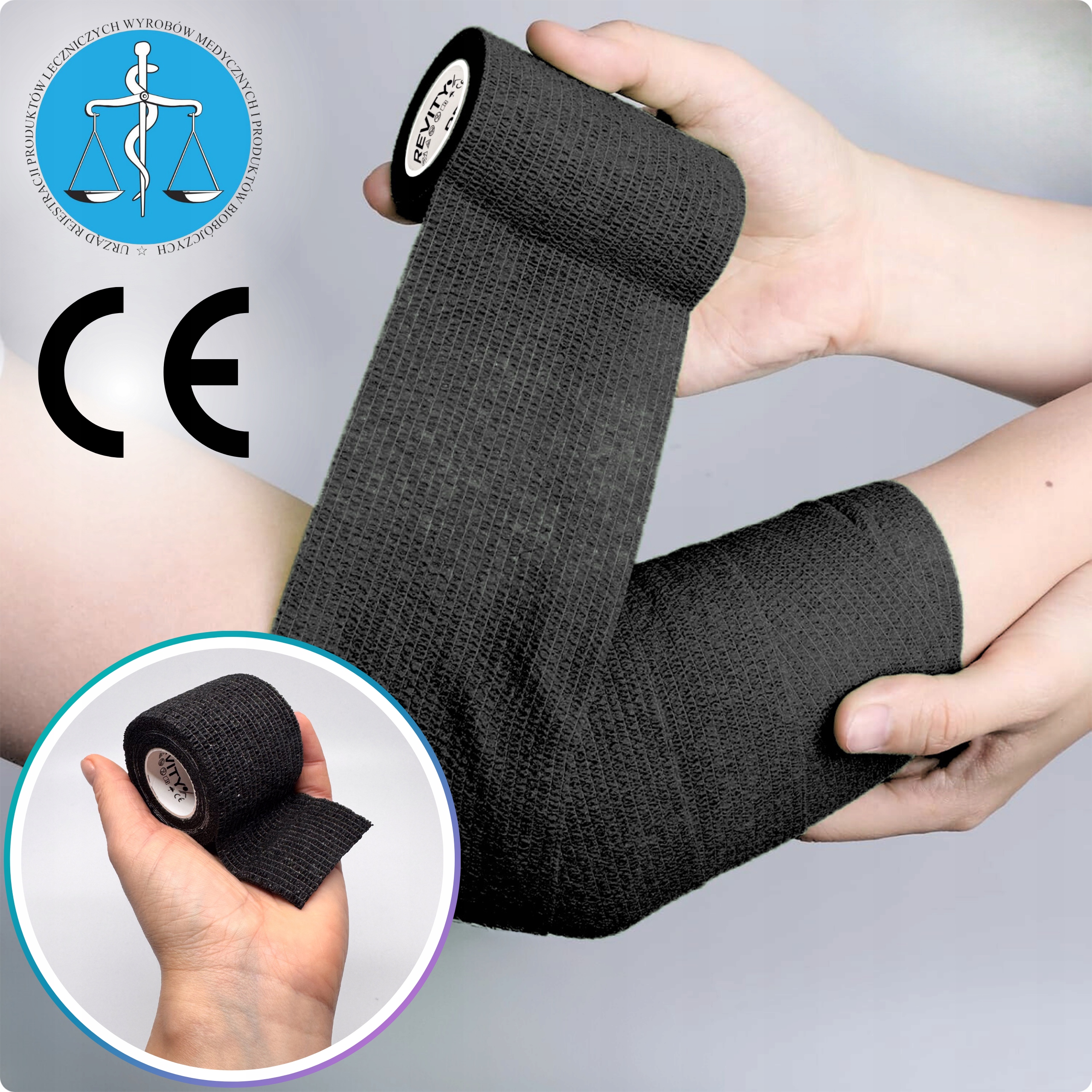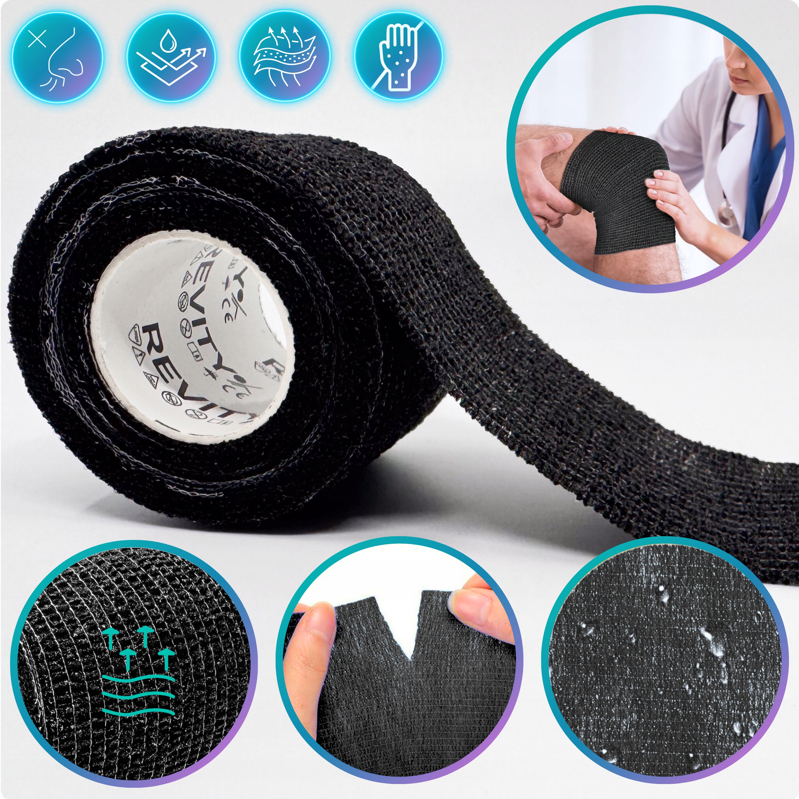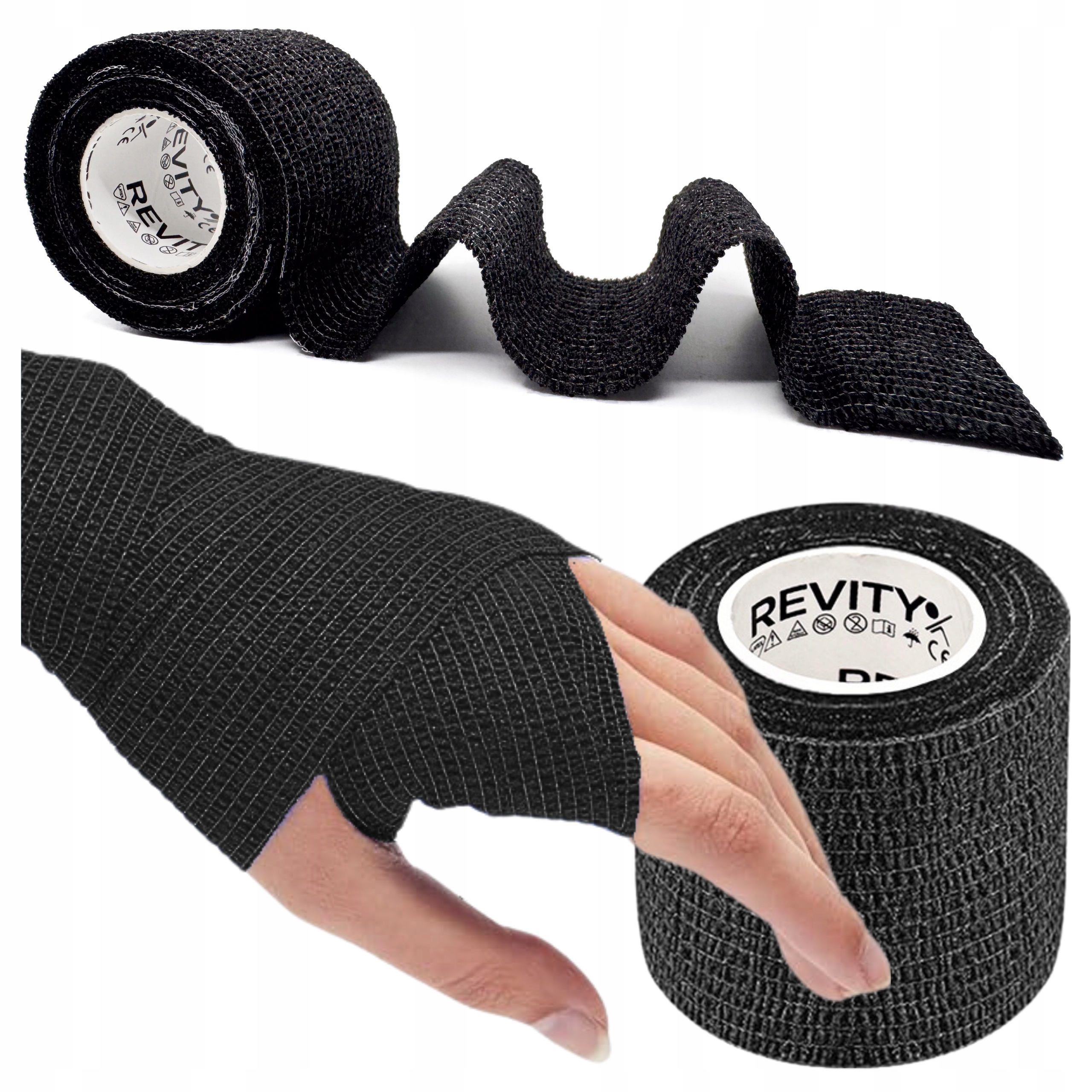 Bandaż kohezyjny (samoprzylepny) Revity to elastyczny opatrunek, który przylega wyłącznie do siebie, a nie klei się do skóry, włosów ani odzieży. Jest przepuszczalny dla powietrzanie nasiąka wodą i po nałożeniu nie strzępi się. Można go rwać ręcznie — bez nożyczek i bez dodatkowych zapinek. Produkt przeznaczony dla ludzi i zwierząt; sprawdza się w sporcie, medycynie i weterynarii. Oznaczony jako wyrób medyczny klasy I z certyfikatem CE.