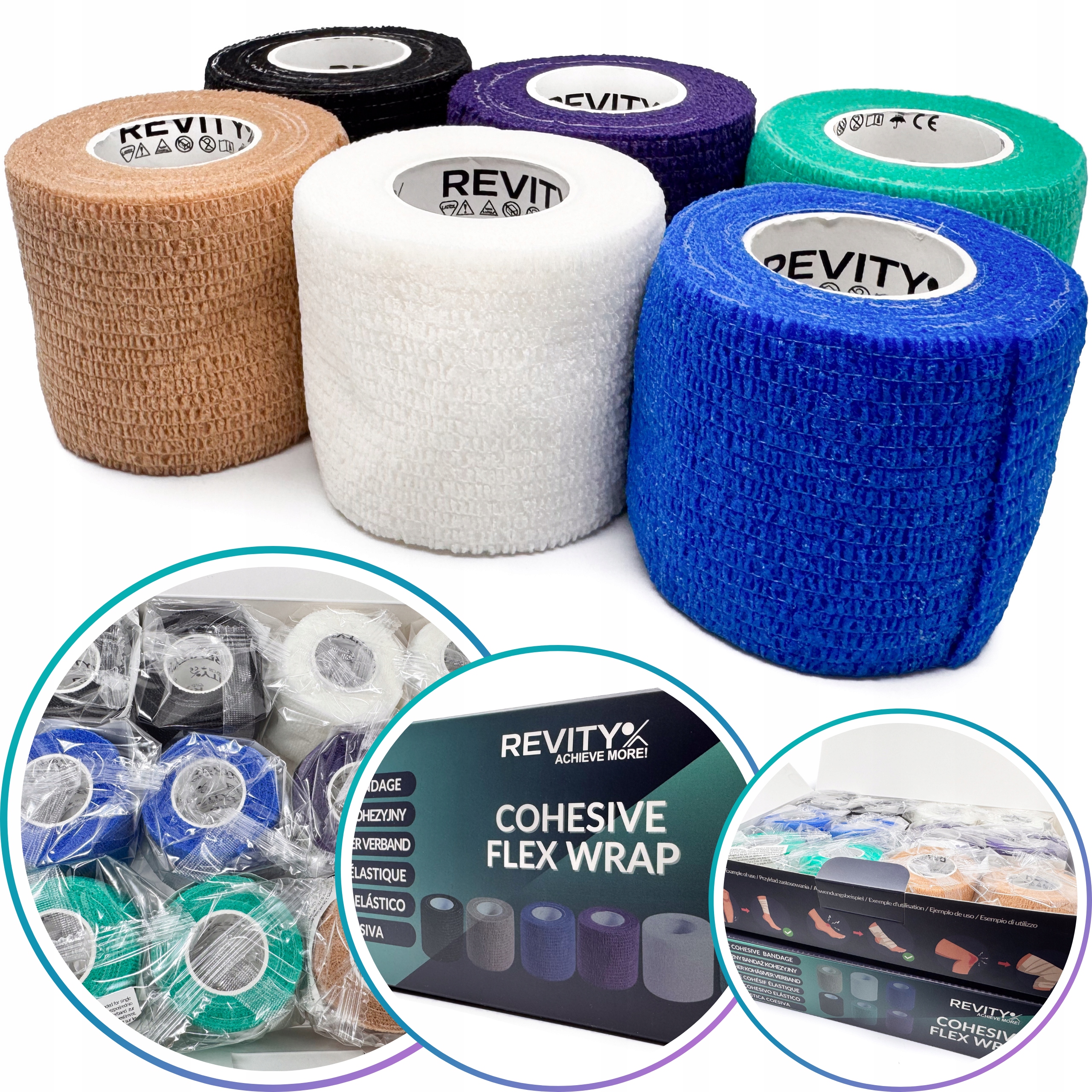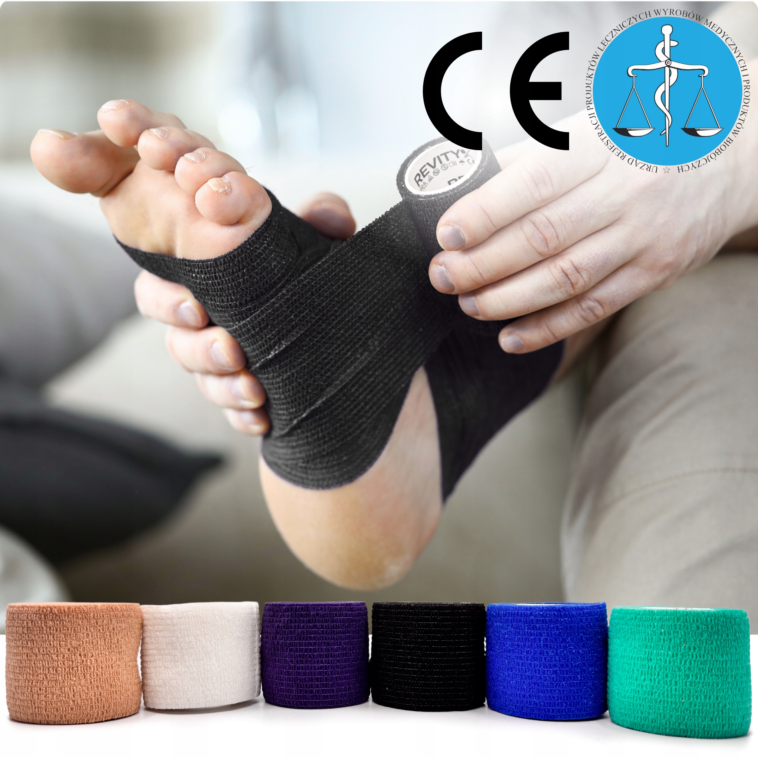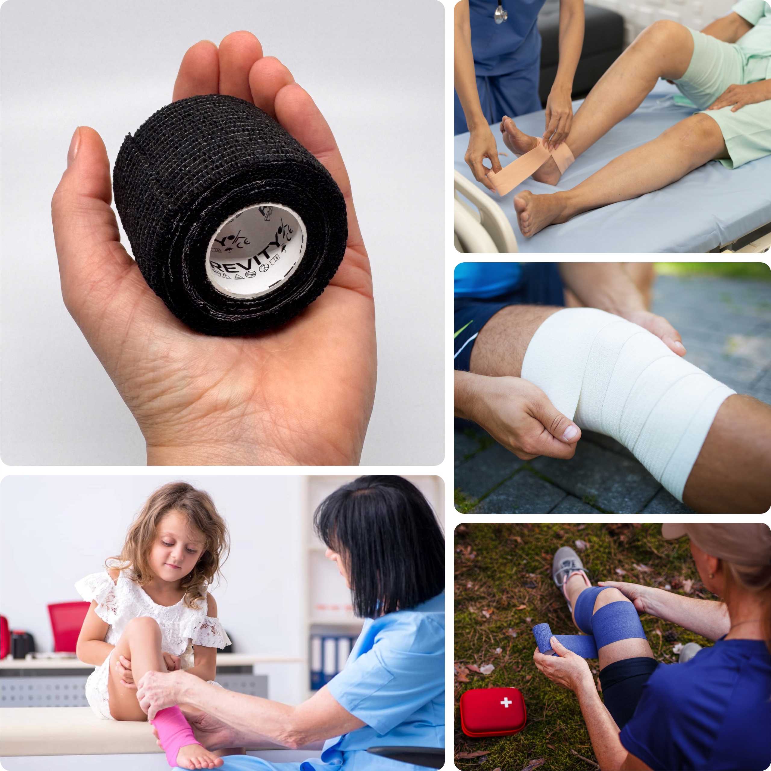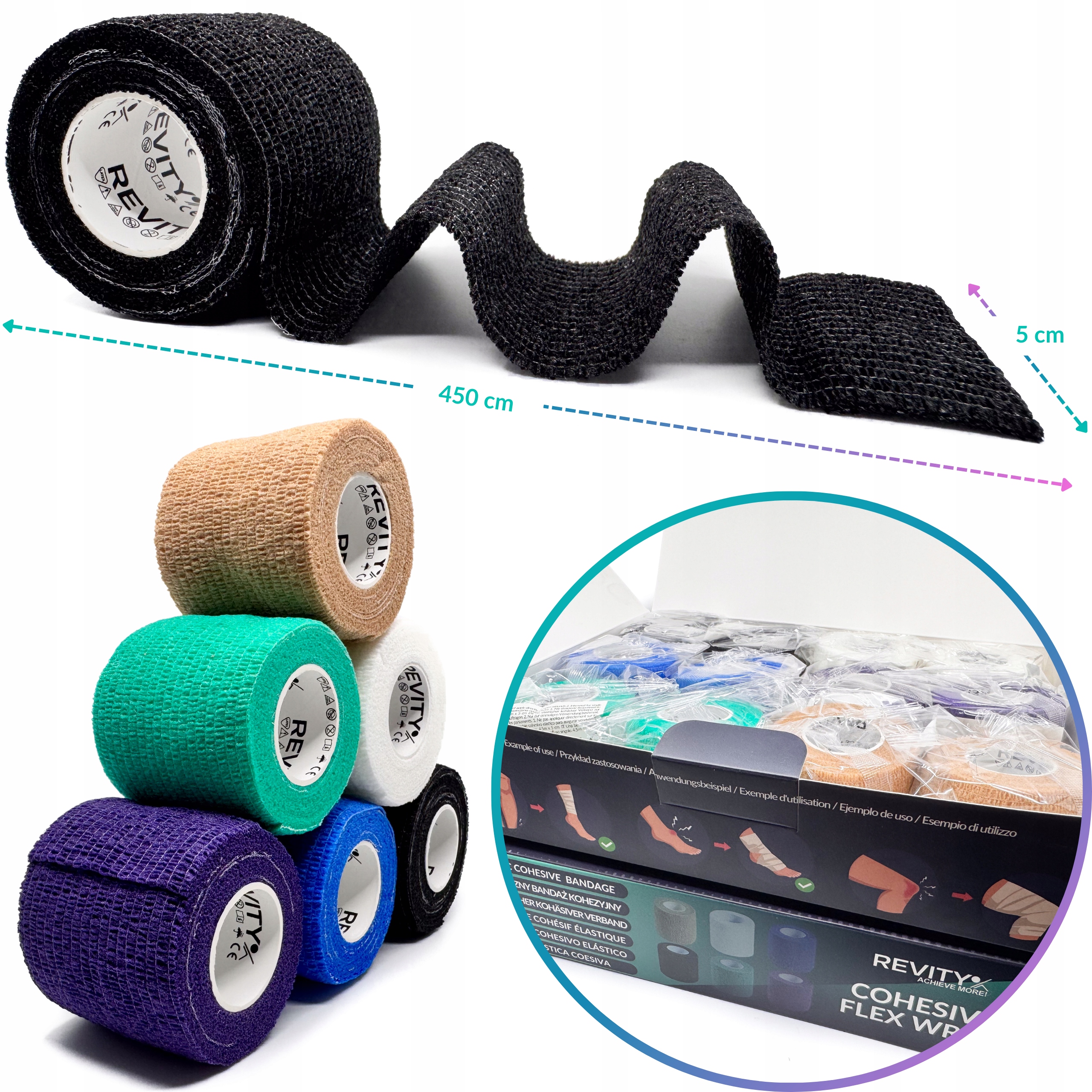 Bandaż kohezyjny (samoprzylepny) Revity to elastyczny opatrunek, który przylega wyłącznie do siebie, a nie klei się do skóry, włosów ani odzieży. Jest przepuszczalny dla powietrzanie nasiąka wodą i po nałożeniu nie strzępi się. Można go rwać ręcznie — bez nożyczek i bez dodatkowych zapinek. Produkt przeznaczony dla ludzi i zwierząt; sprawdza się w sporcie, medycynie i weterynarii. Oznaczony jako wyrób medyczny klasy I z certyfikatem CE.