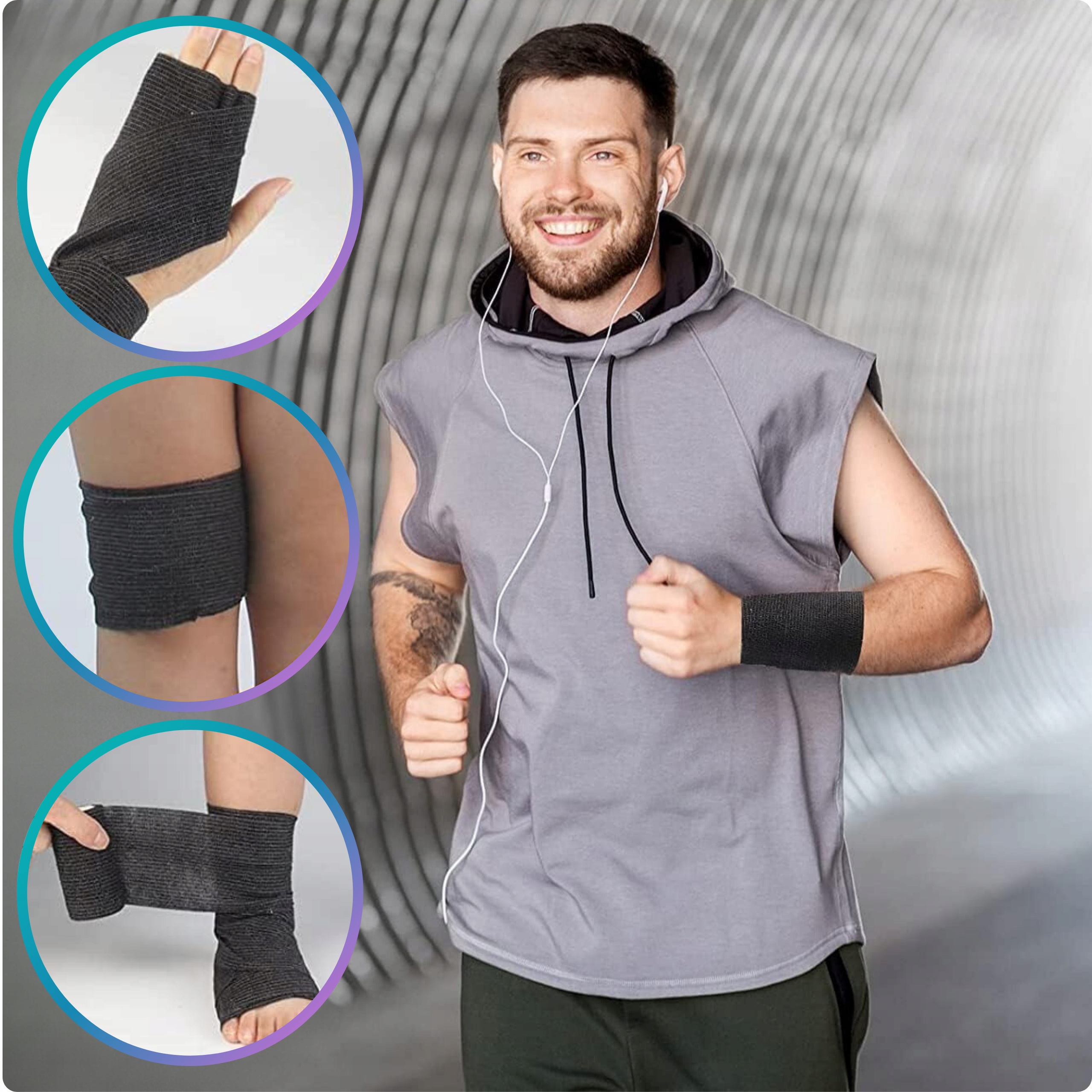 • Sport: podtrzymanie i kompresja, pomoc w stabilizacji stawów i mięśni, profilaktyka drobnych urazów.