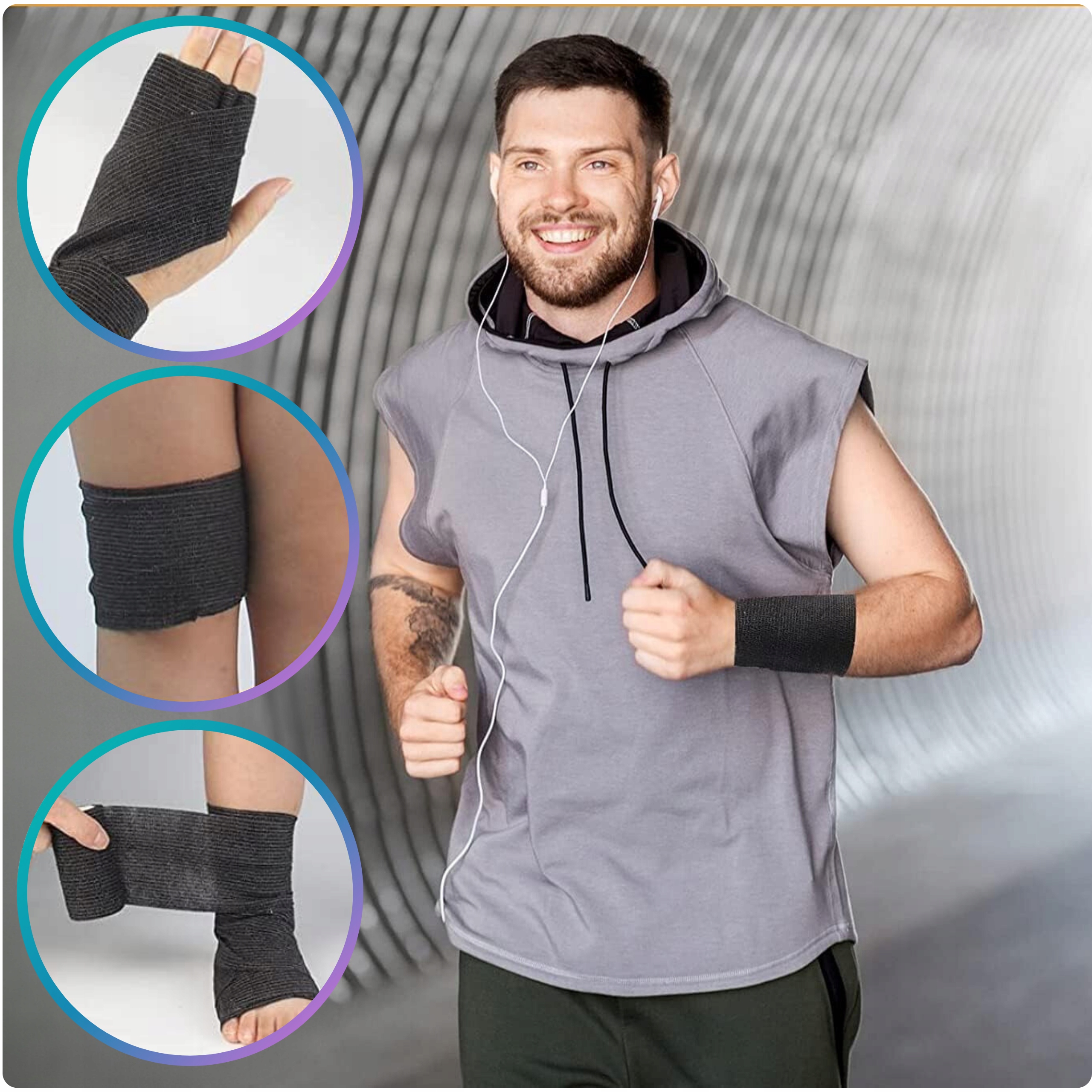 Sport: podtrzymanie i kompresja, pomoc w stabilizacji stawów i mięśni, profilaktyka drobnych urazów.
