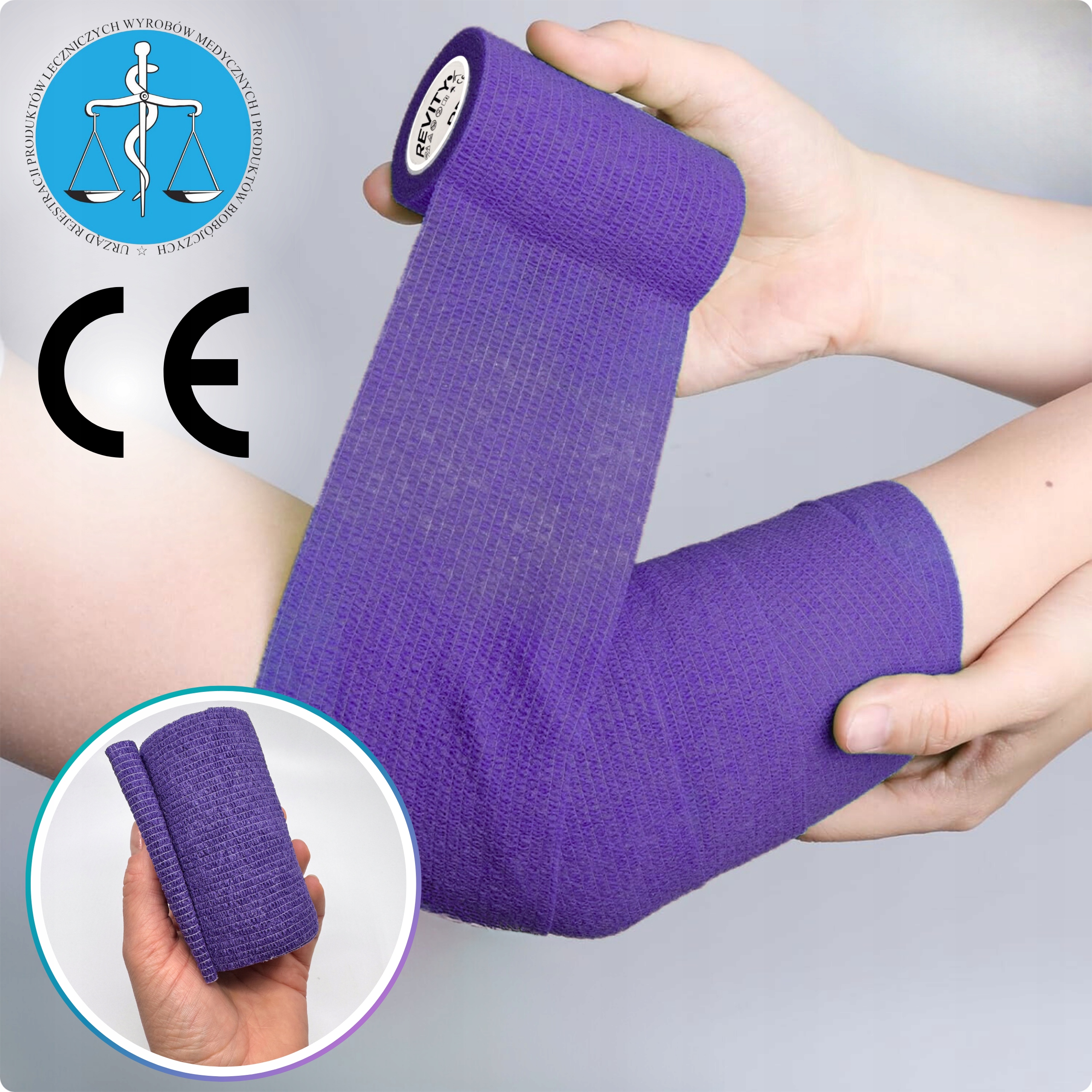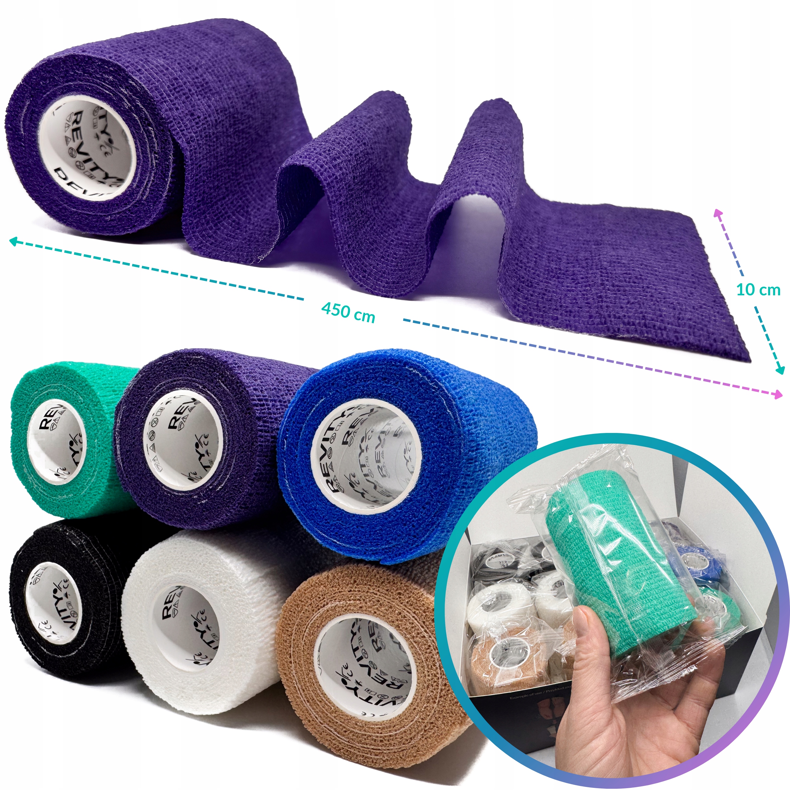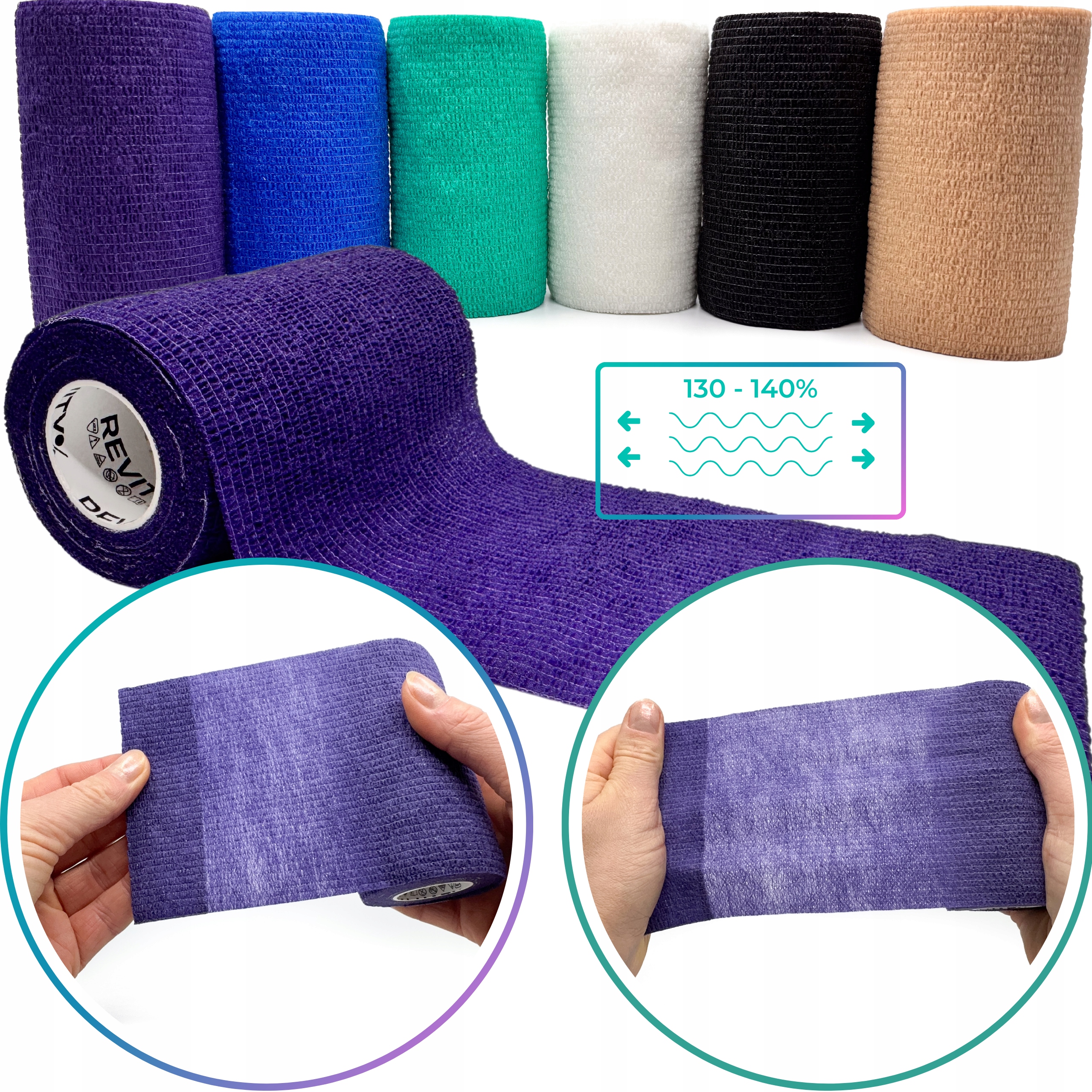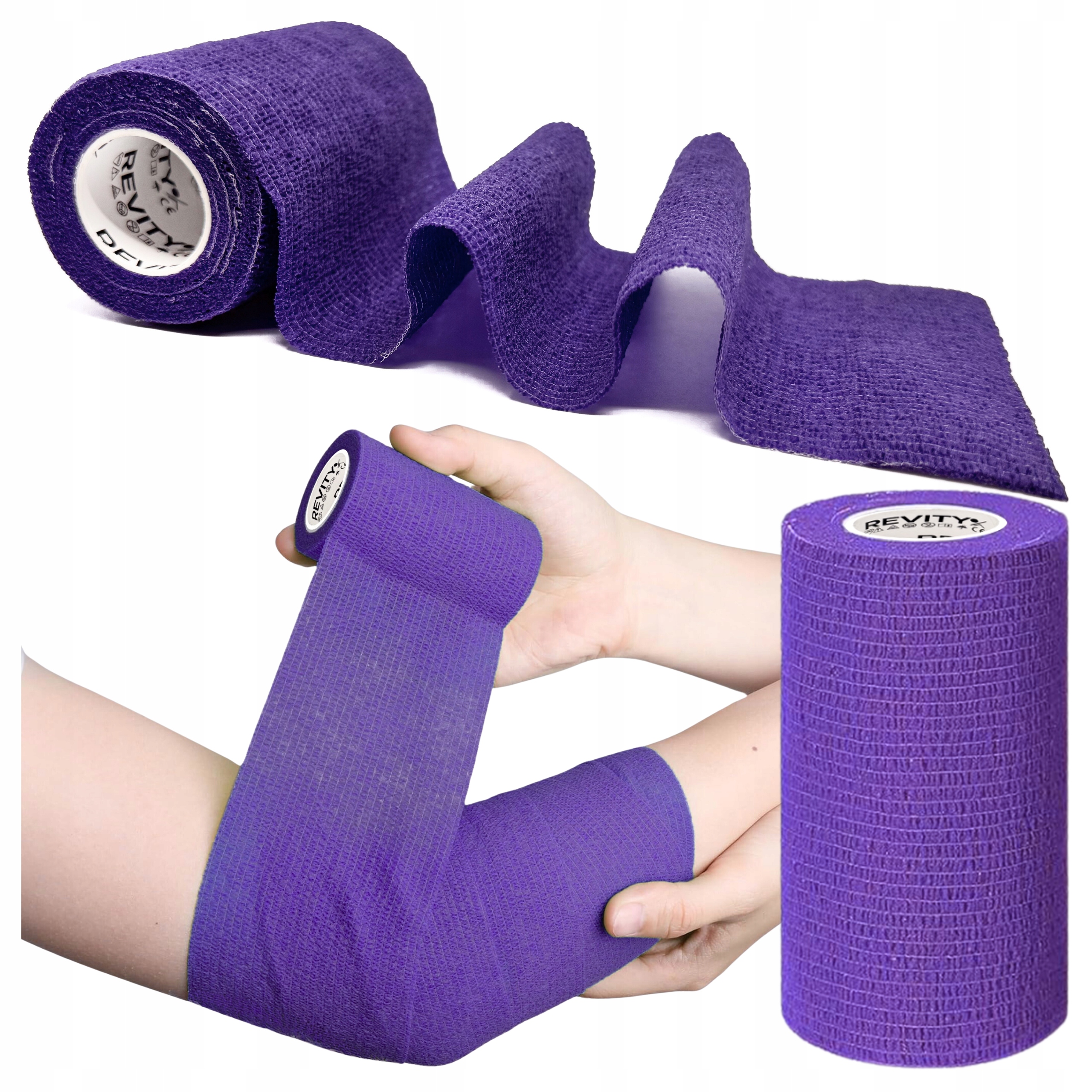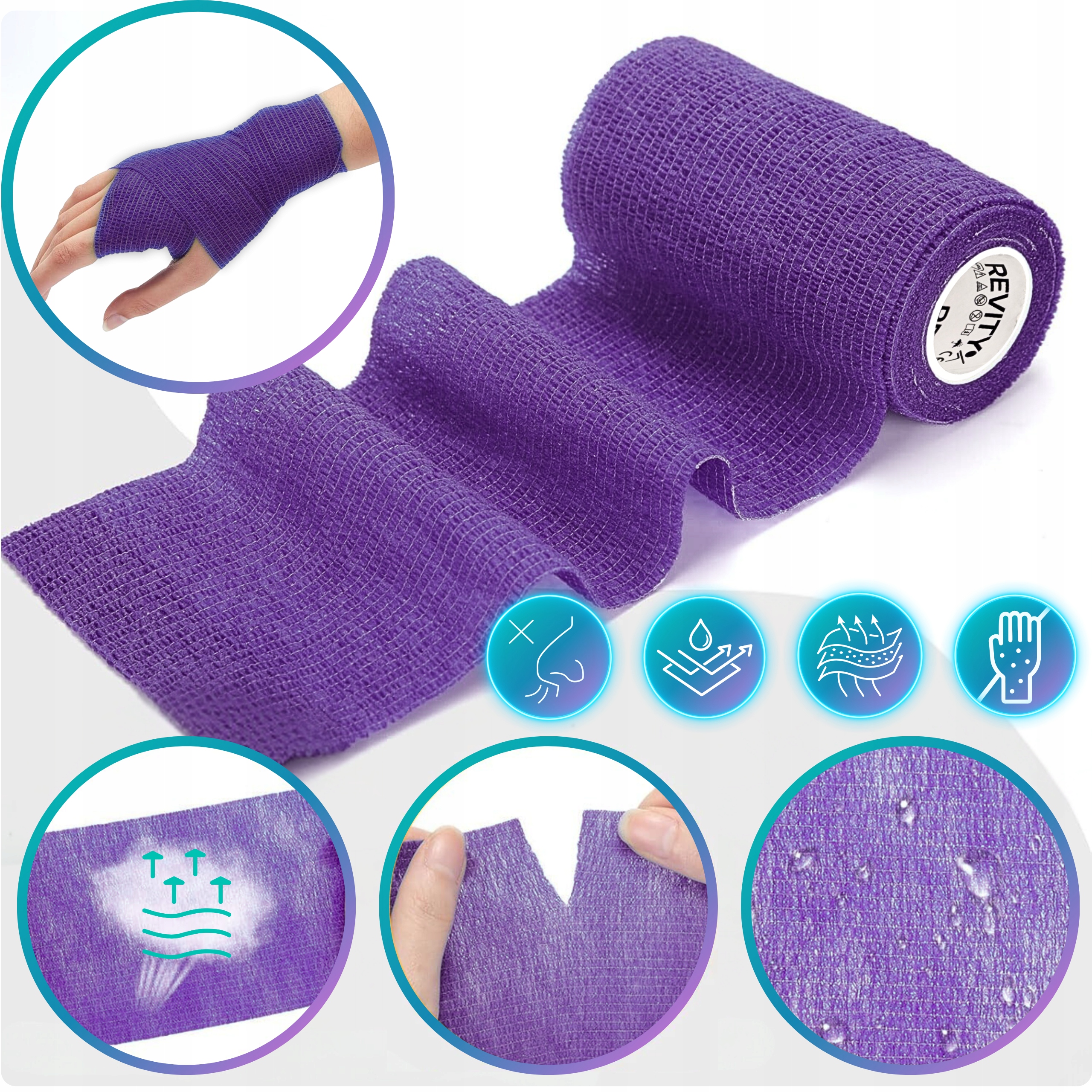 Bandaż kohezyjny (samoprzylepny) Revity to elastyczny opatrunek, który przylega wyłącznie do siebie, a nie klei się do skóry, włosów ani odzieży. Jest przepuszczalny dla powietrza, nie nasiąka wodą i po nałożeniu nie strzępi się. Można go rwać ręcznie — bez nożyczek i bez dodatkowych zapinek. Produkt przeznaczony dla ludzi i zwierząt; sprawdza się w sporcie, medycynie i weterynarii. Oznaczony jako wyrób medyczny klasy I z certyfikatem CE.