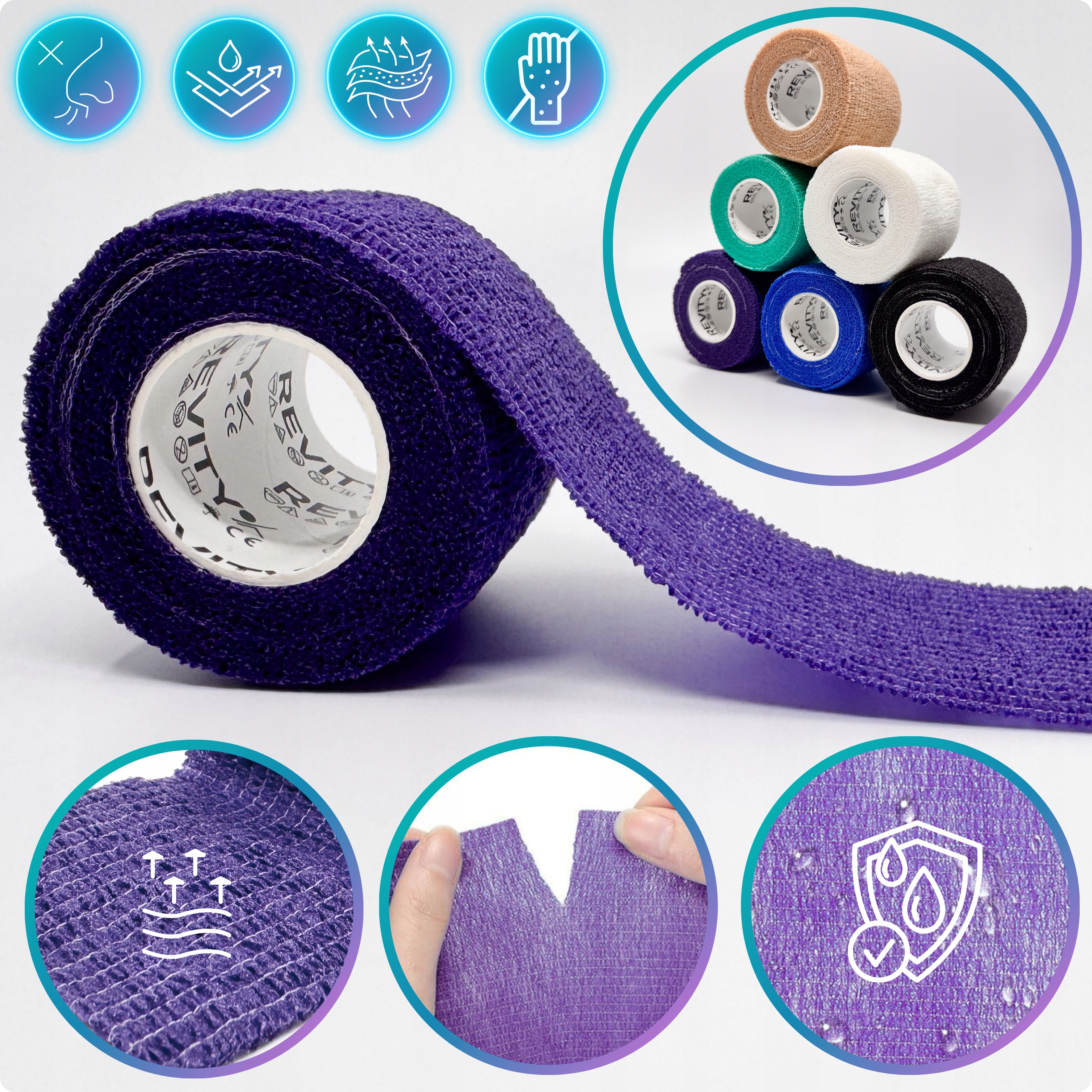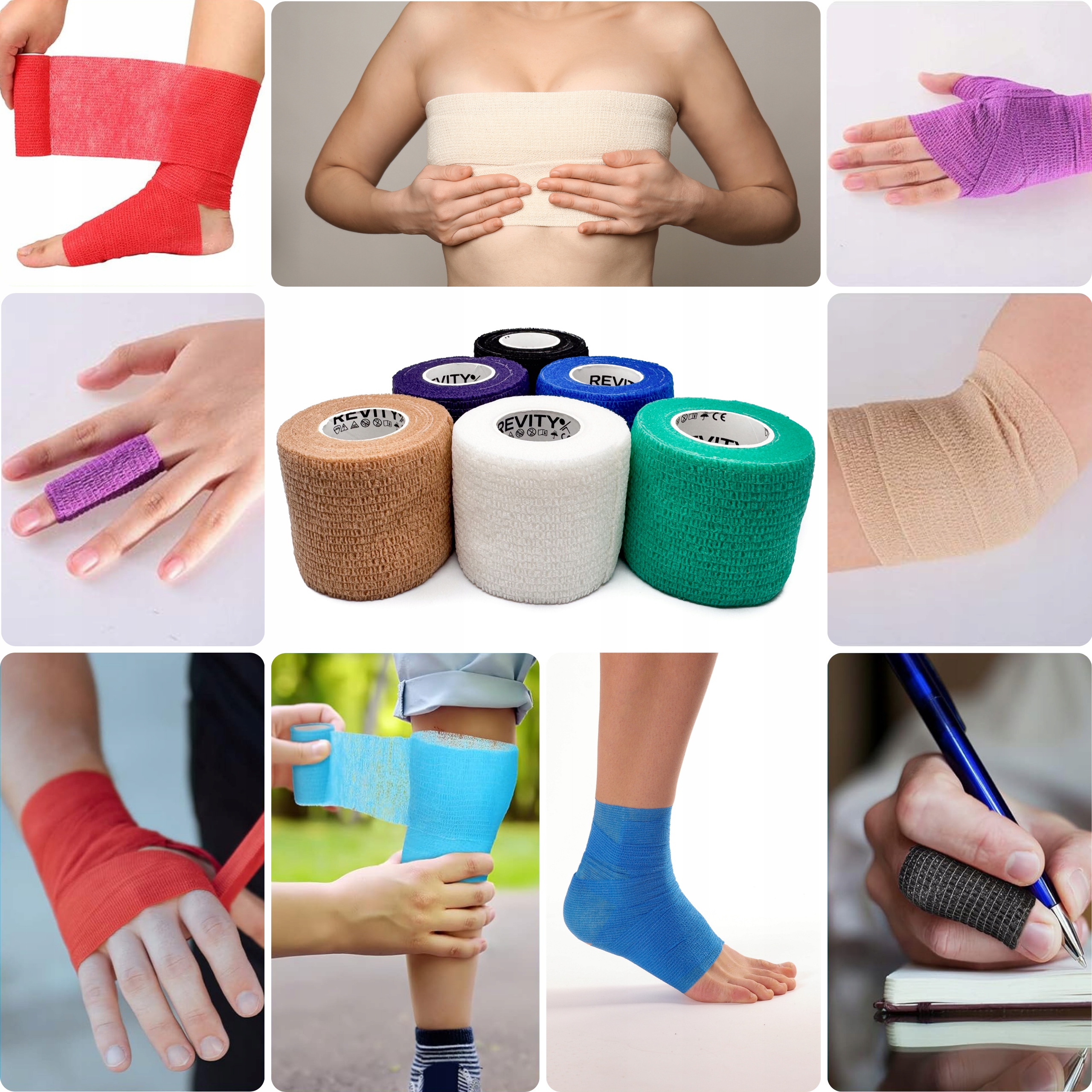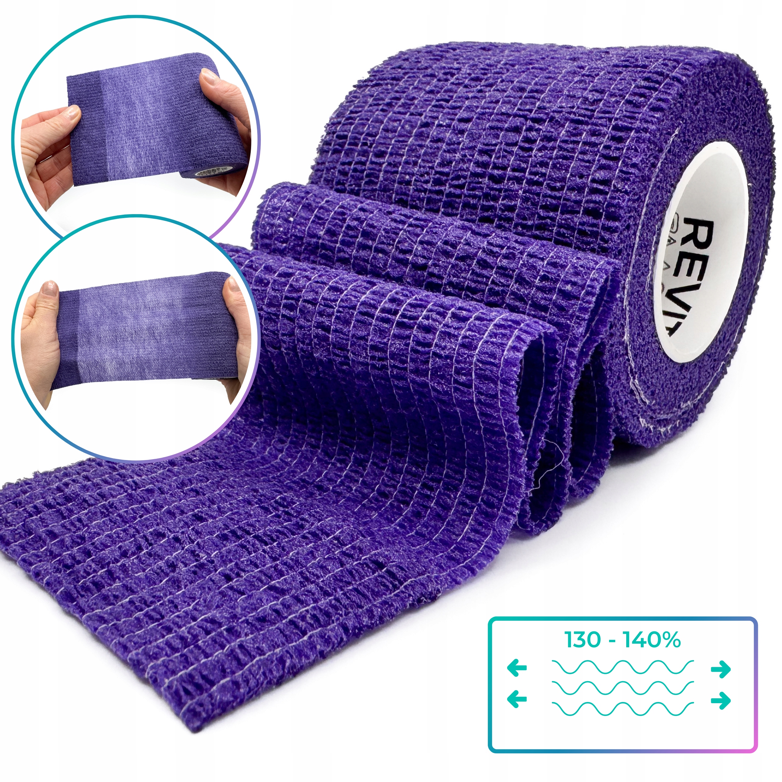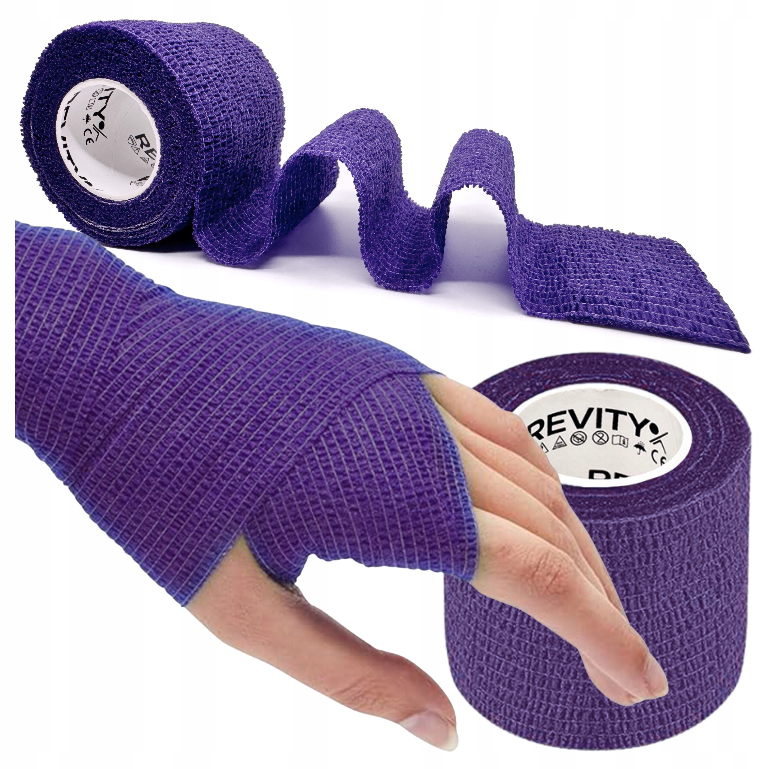 Bandaż kohezyjny (samoprzylepny) Revity to elastyczny opatrunek, który przylega wyłącznie do siebie, a nie klei się do skóry, włosów ani odzieży. Jest przepuszczalny dla powietrzanie nasiąka wodą i po nałożeniu nie strzępi się. Można go rwać ręcznie — bez nożyczek i bez dodatkowych zapinek. Produkt przeznaczony dla ludzi i zwierząt; sprawdza się w sporcie, medycynie i weterynarii. Oznaczony jako wyrób medyczny klasy I z certyfikatem CE.