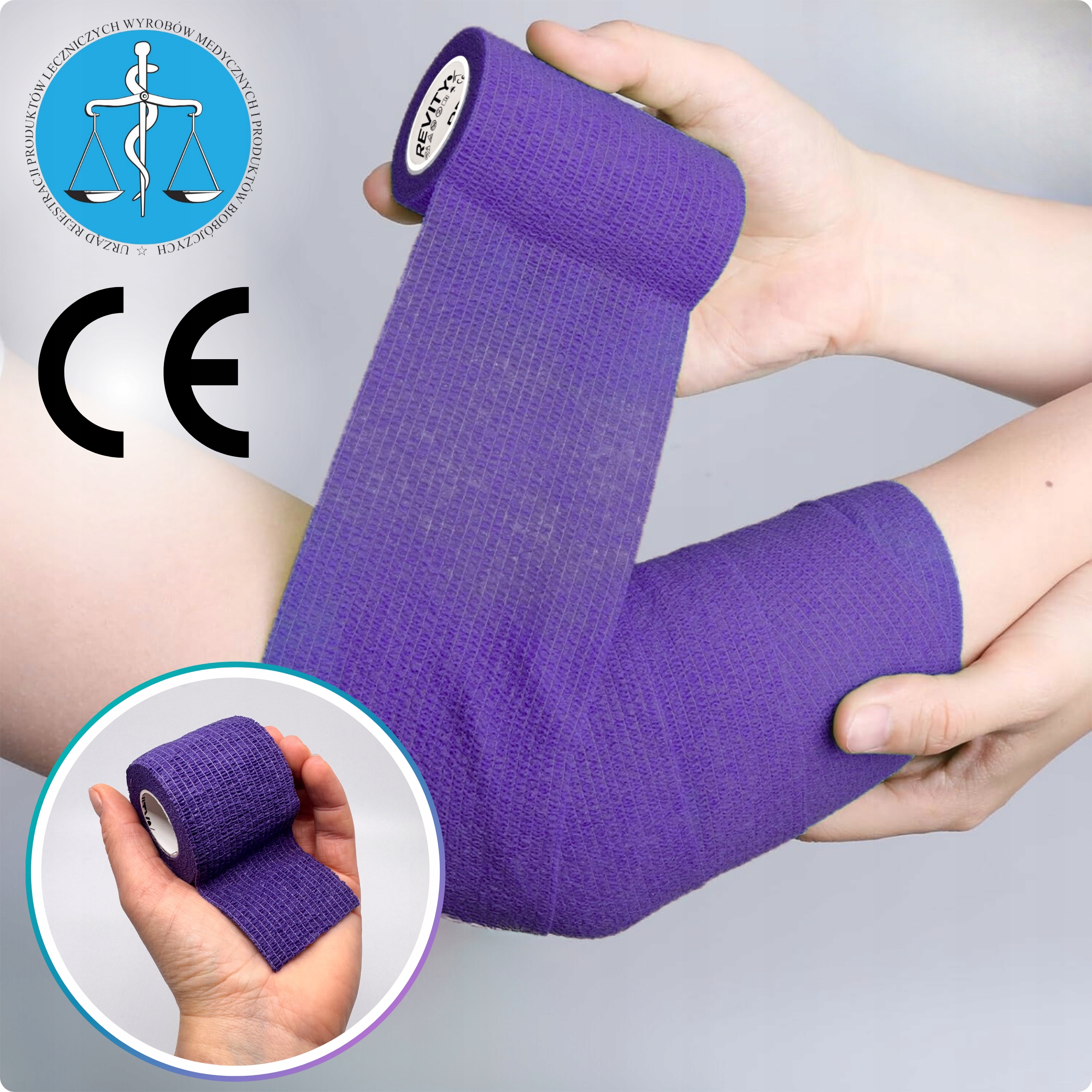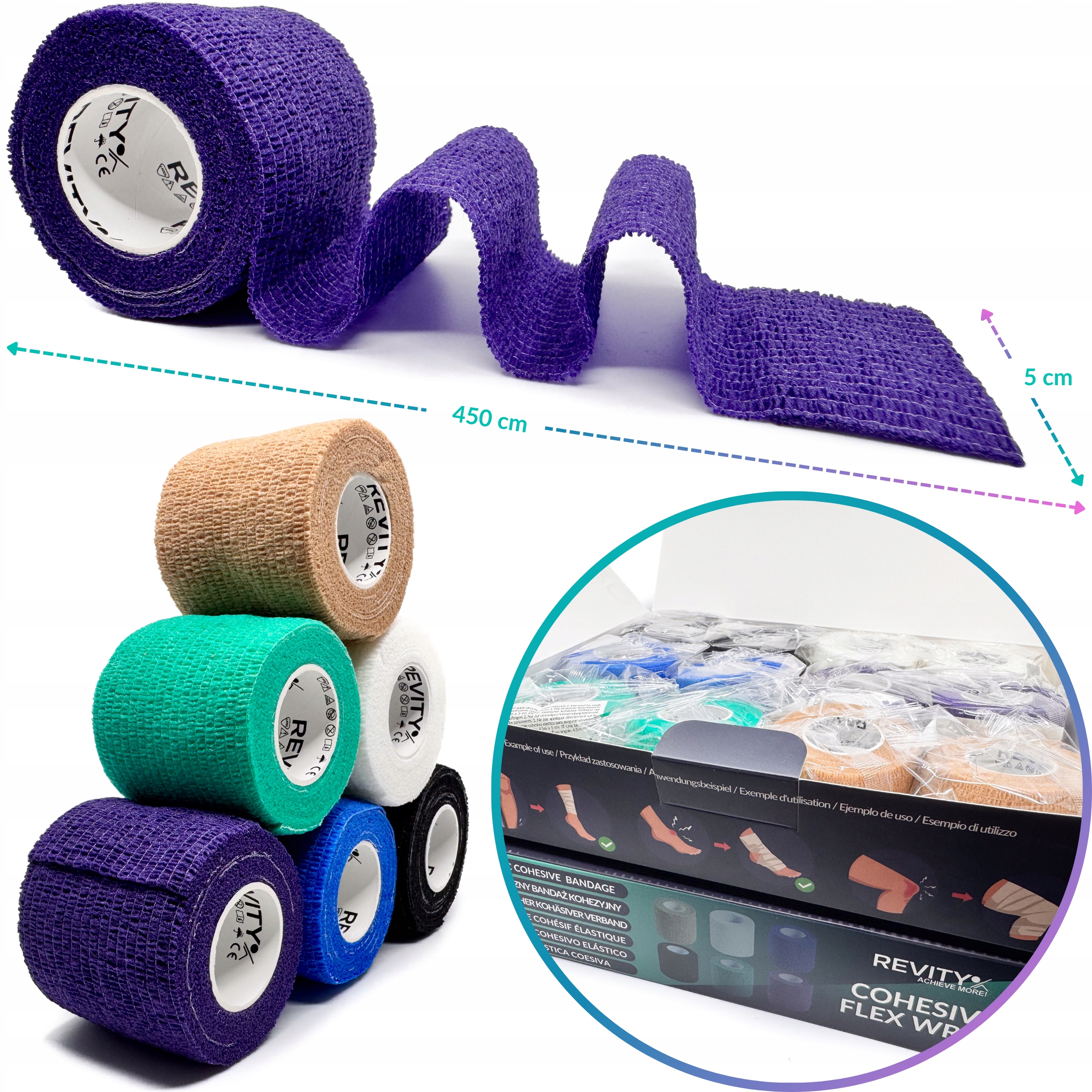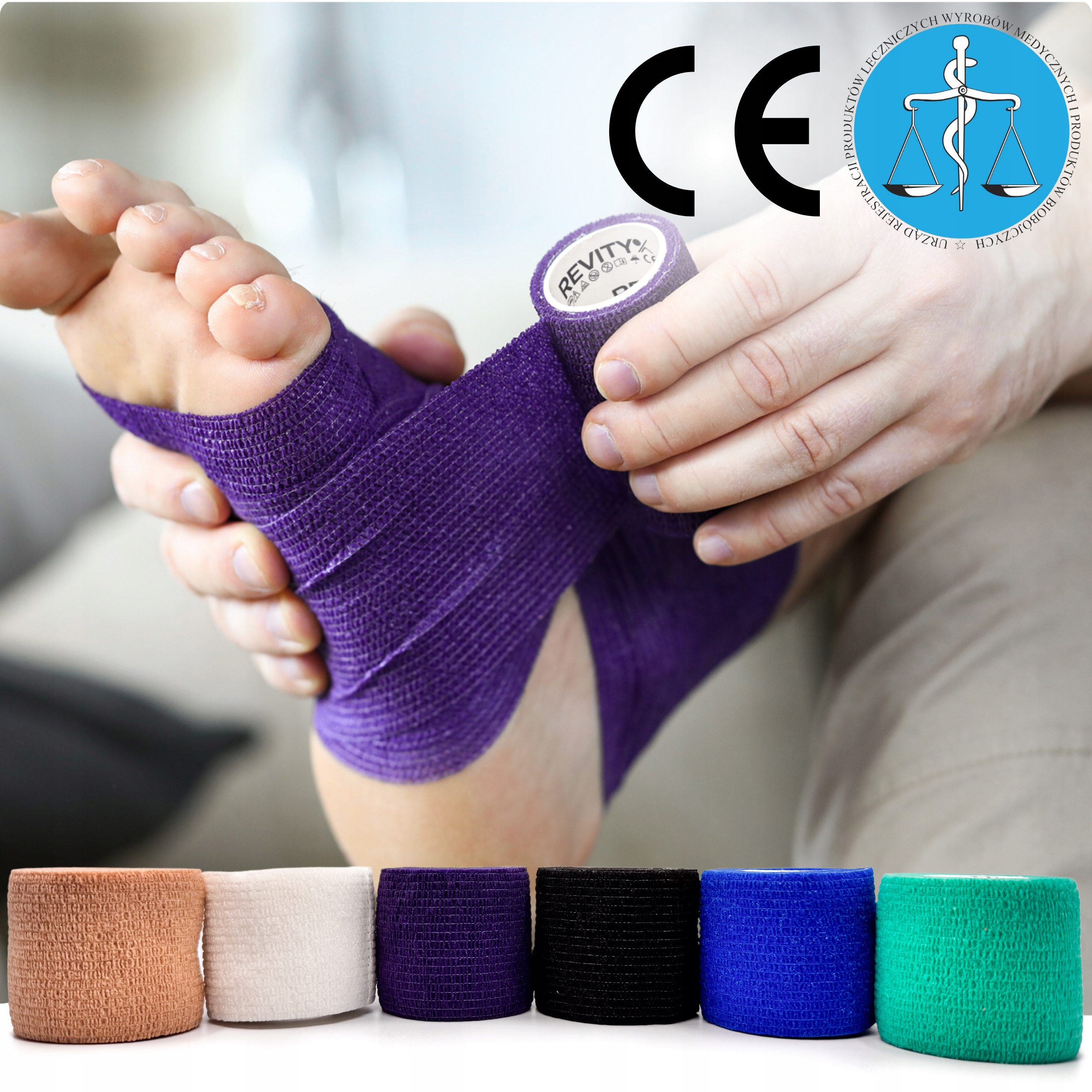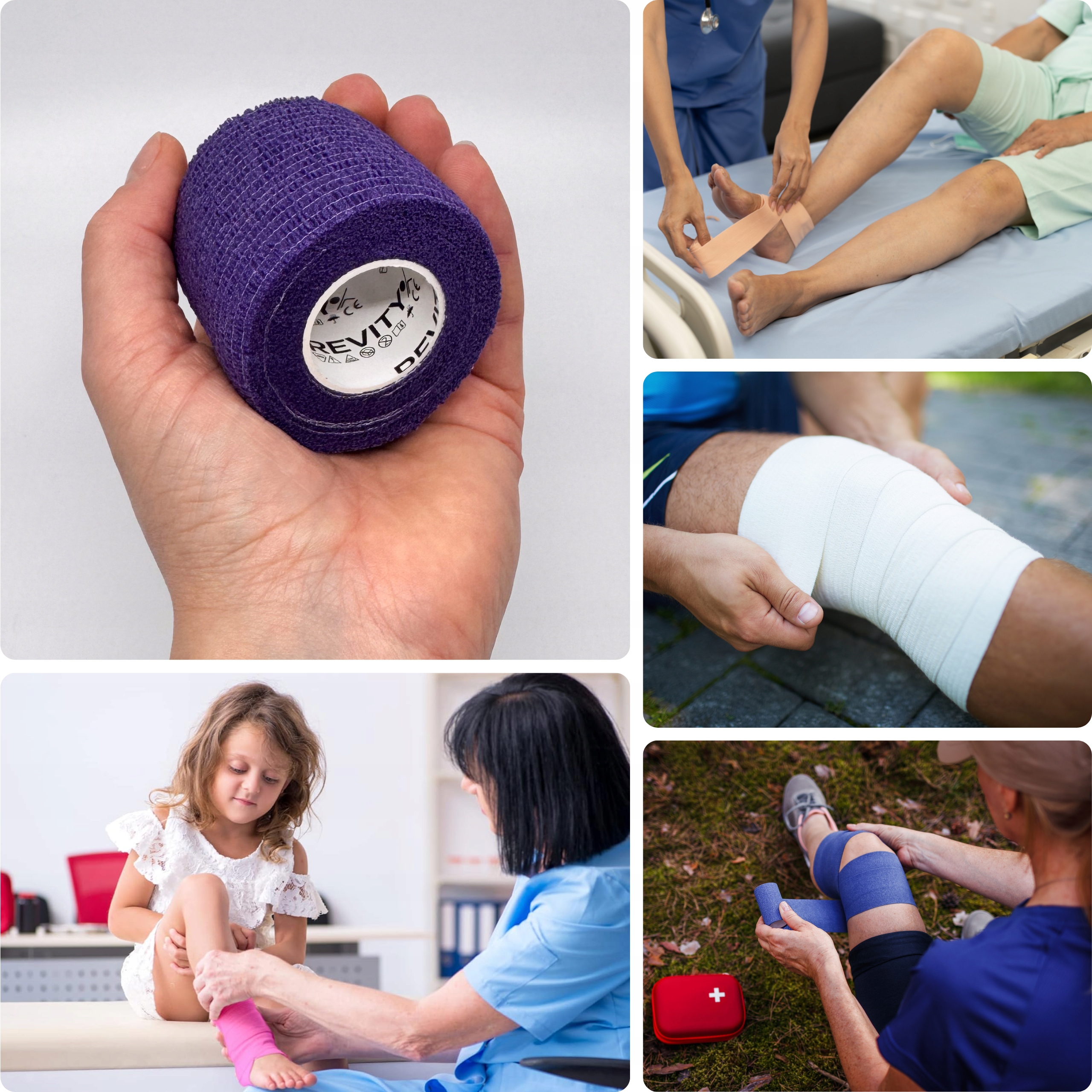 Bandaż kohezyjny (samoprzylepny) Revity to elastyczny opatrunek, który przylega wyłącznie do siebie, a nie klei się do skóry, włosów ani odzieży. Jest przepuszczalny dla powietrzanie nasiąka wodą i po nałożeniu nie strzępi się. Można go rwać ręcznie — bez nożyczek i bez dodatkowych zapinek. Produkt przeznaczony dla ludzi i zwierząt; sprawdza się w sporcie, medycynie i weterynarii. Oznaczony jako wyrób medyczny klasy I z certyfikatem CE.