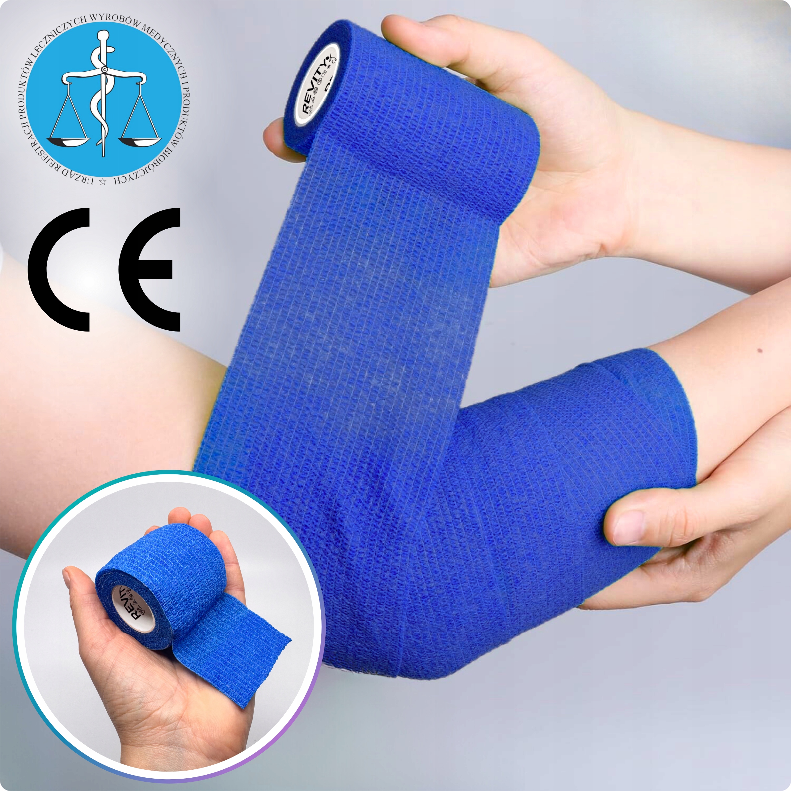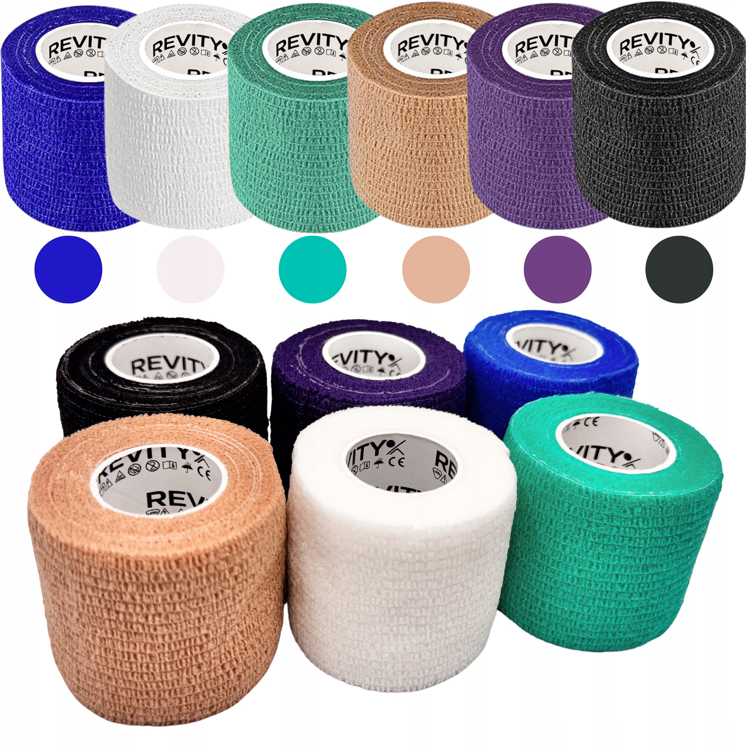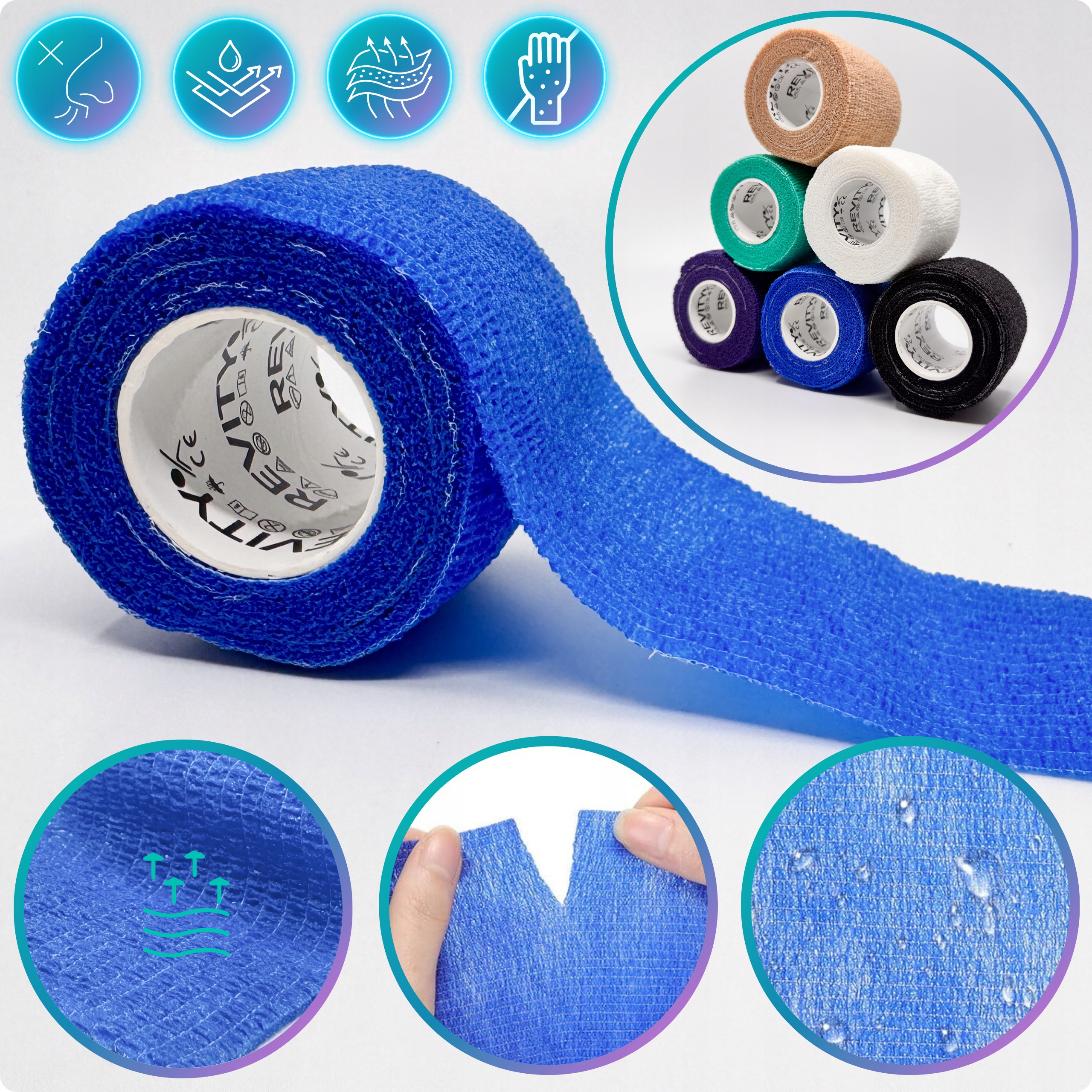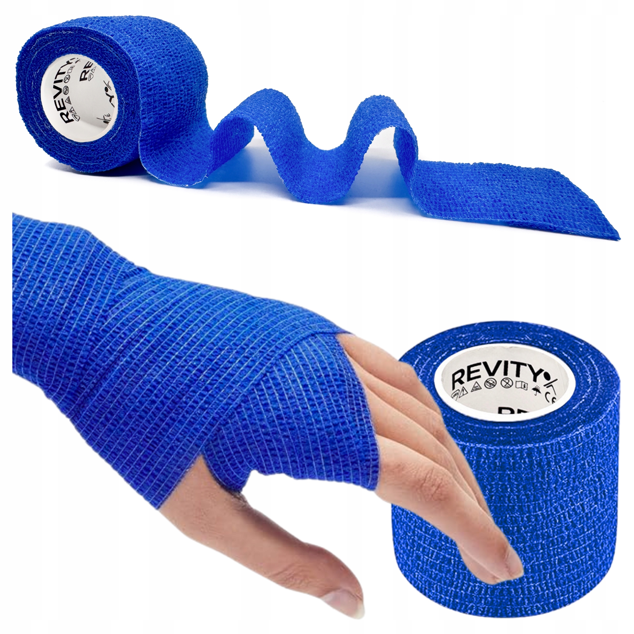 Bandaż kohezyjny (samoprzylepny) Revity to elastyczny opatrunek, który przylega wyłącznie do siebie, a nie klei się do skóry, włosów ani odzieży. Jest przepuszczalny dla powietrzanie nasiąka wodą i po nałożeniu nie strzępi się. Można go rwać ręcznie — bez nożyczek i bez dodatkowych zapinek. Produkt przeznaczony dla ludzi i zwierząt; sprawdza się w sporcie, medycynie i weterynarii. Oznaczony jako wyrób medyczny klasy I z certyfikatem CE.