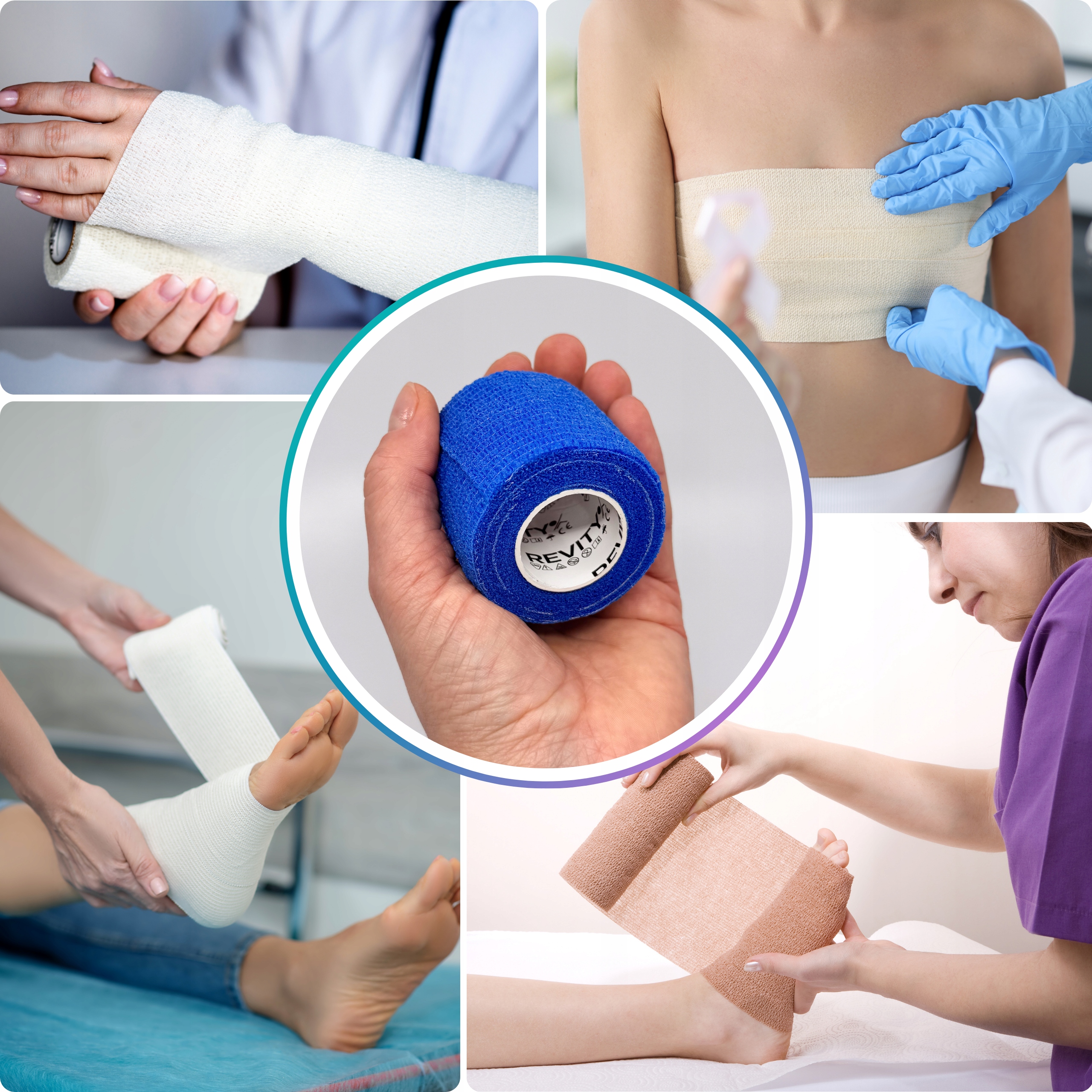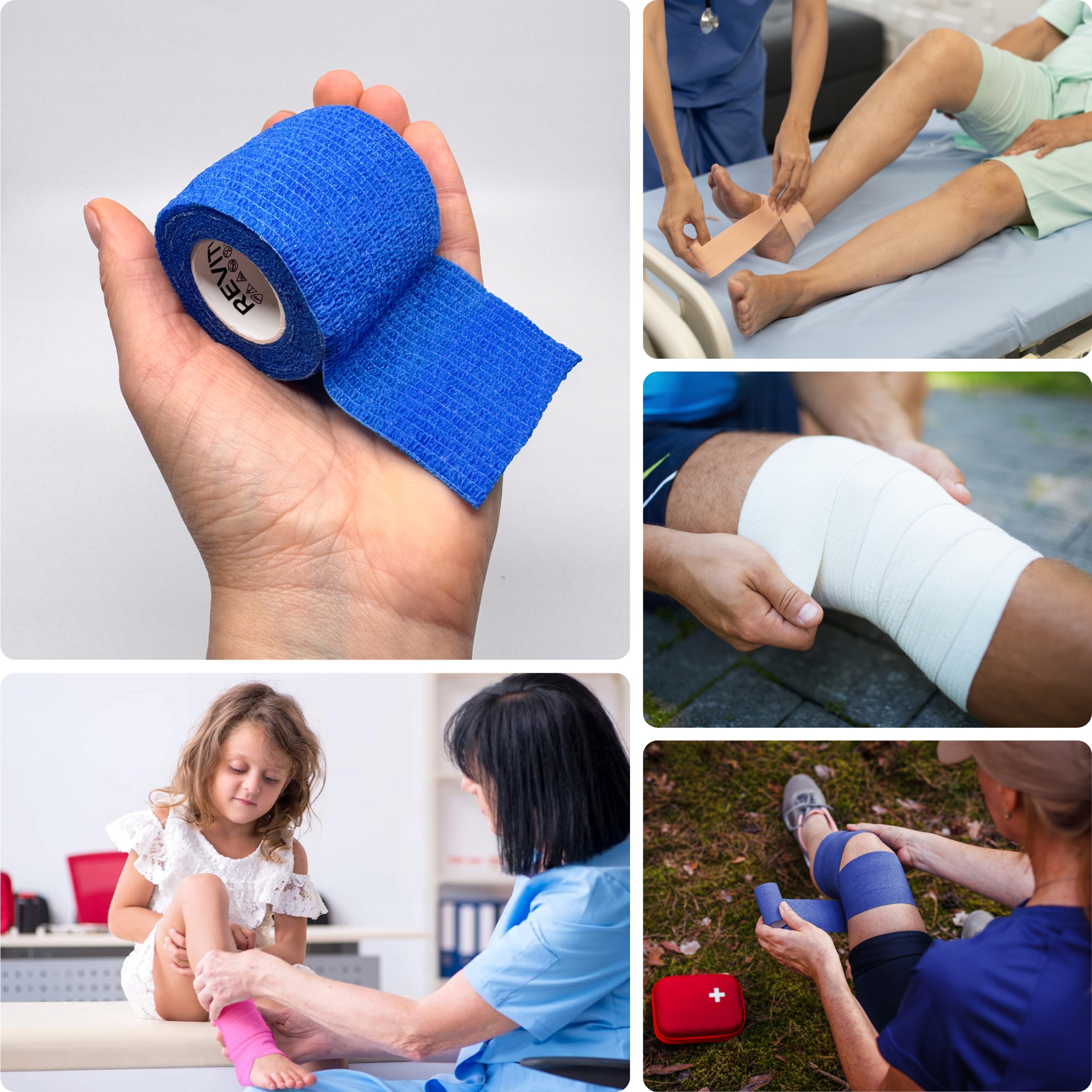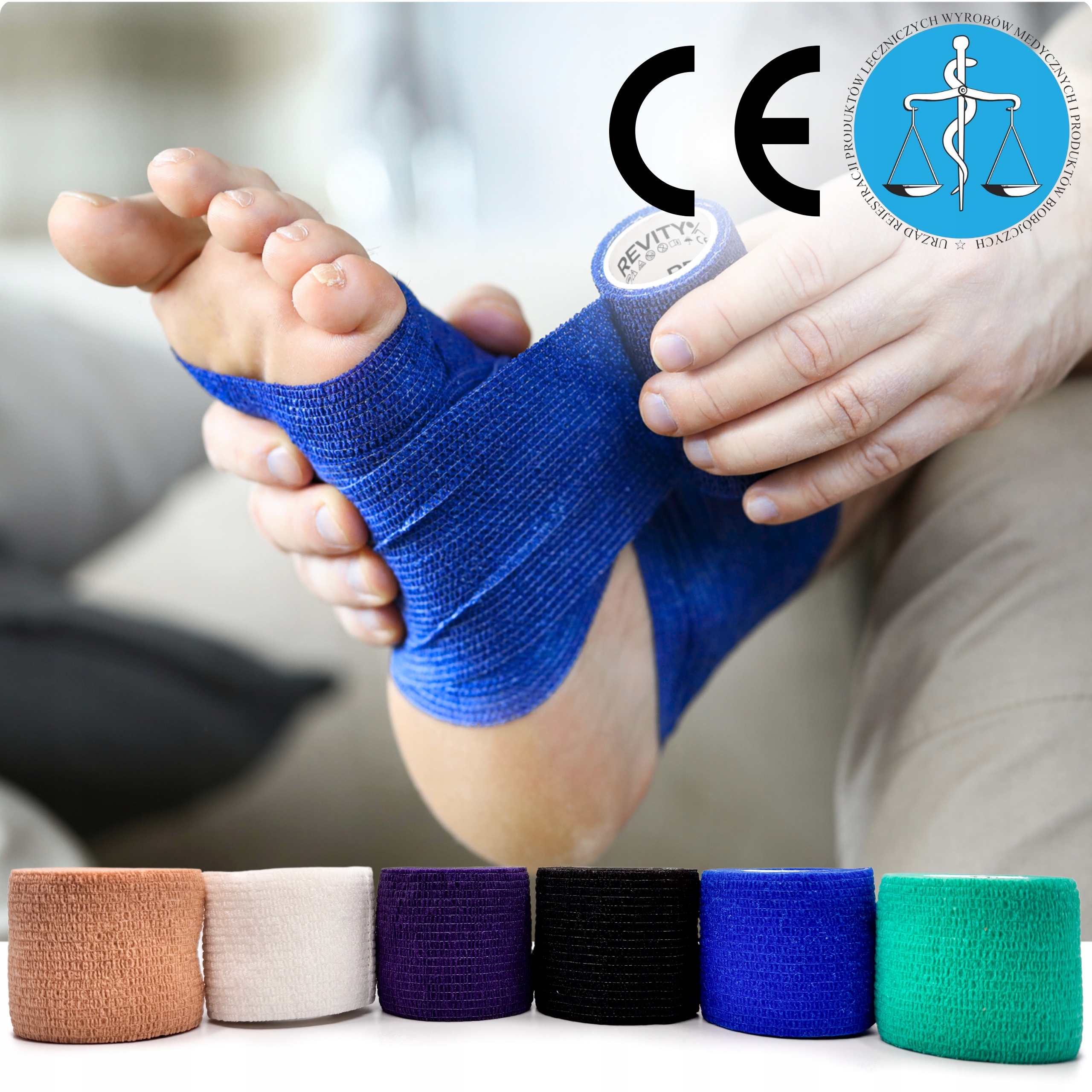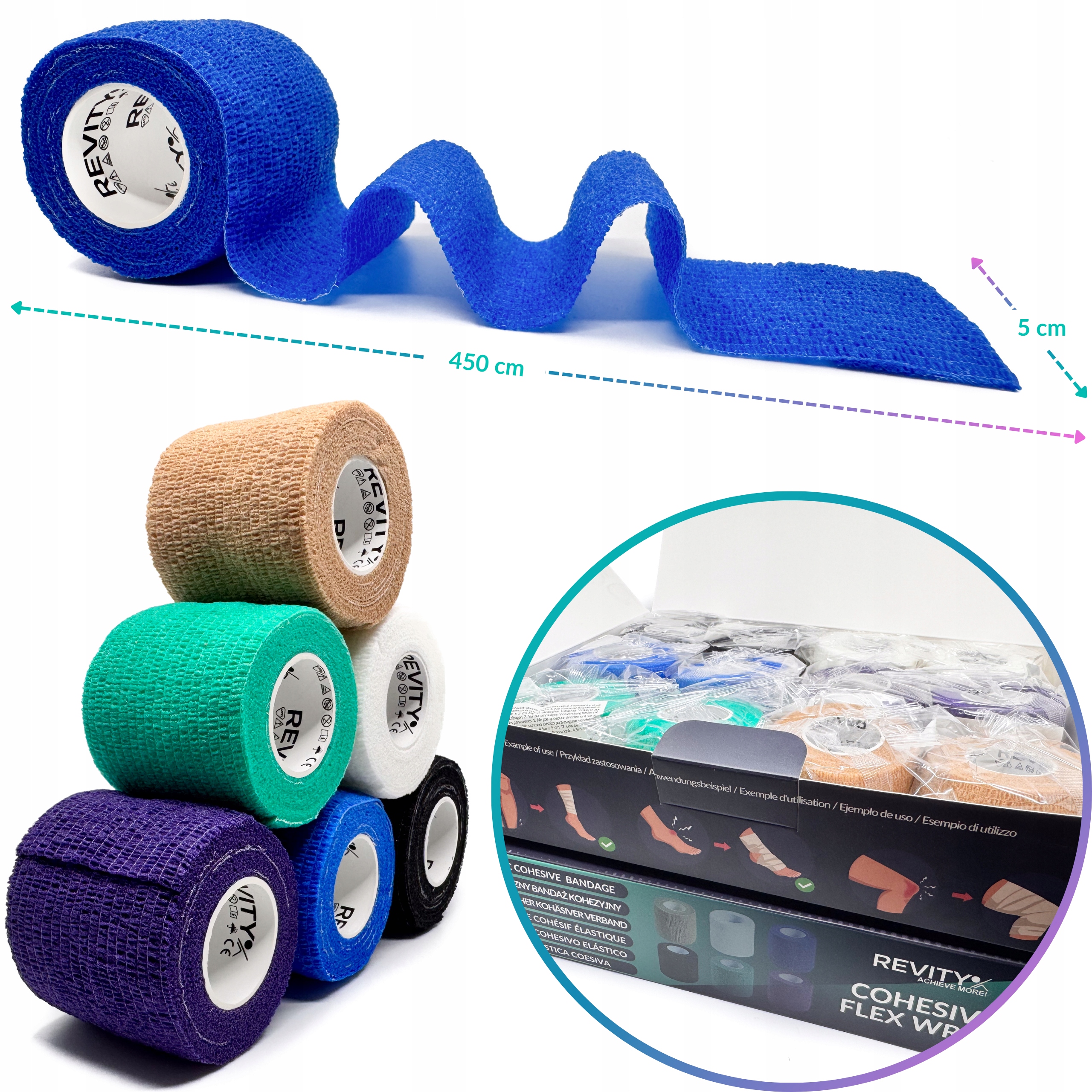 Bandaż kohezyjny (samoprzylepny) Revity to elastyczny opatrunek, który przylega wyłącznie do siebie, a nie klei się do skóry, włosów ani odzieży. Jest przepuszczalny dla powietrzanie nasiąka wodą i po nałożeniu nie strzępi się. Można go rwać ręcznie — bez nożyczek i bez dodatkowych zapinek. Produkt przeznaczony dla ludzi i zwierząt; sprawdza się w sporcie, medycynie i weterynarii. Oznaczony jako wyrób medyczny klasy I z certyfikatem CE.