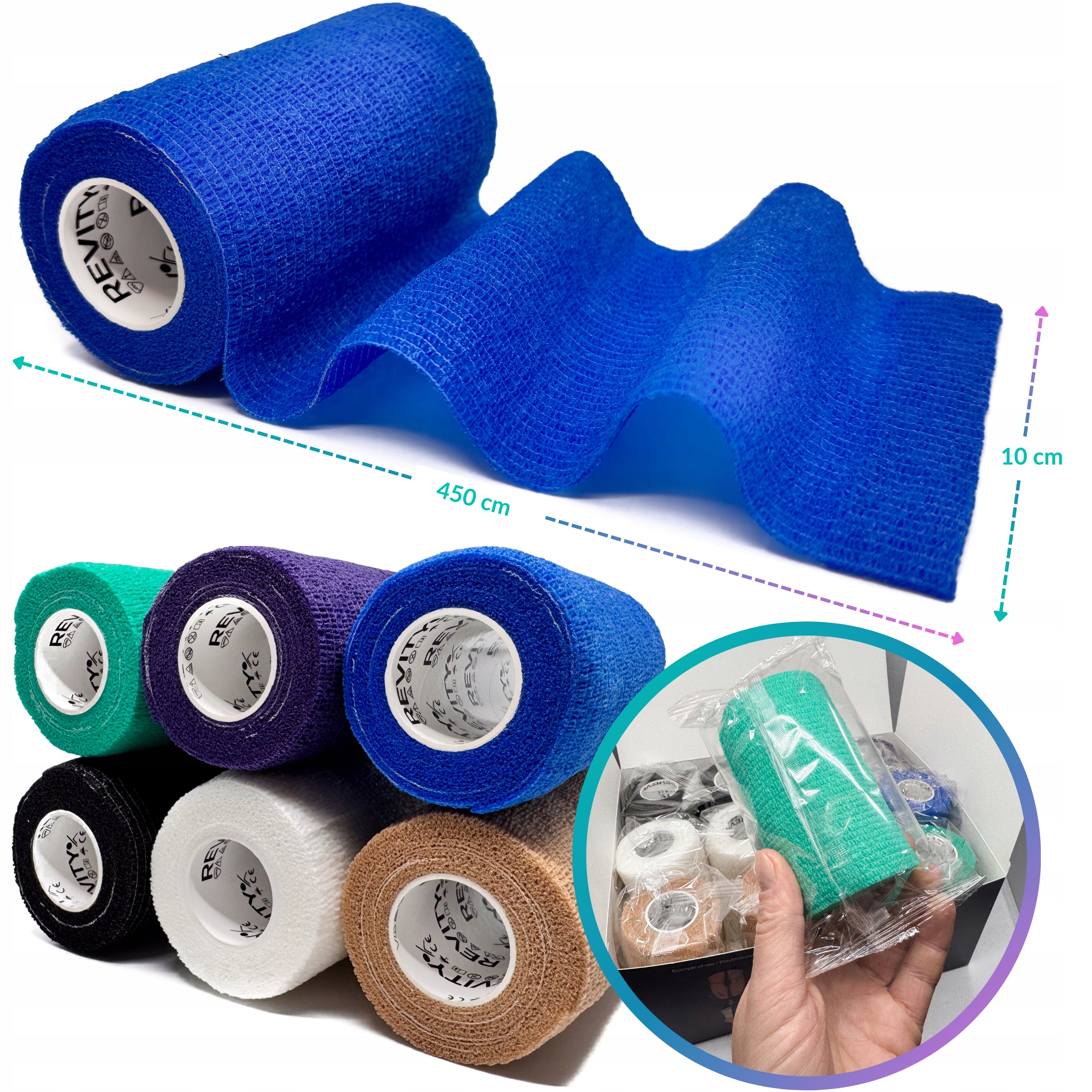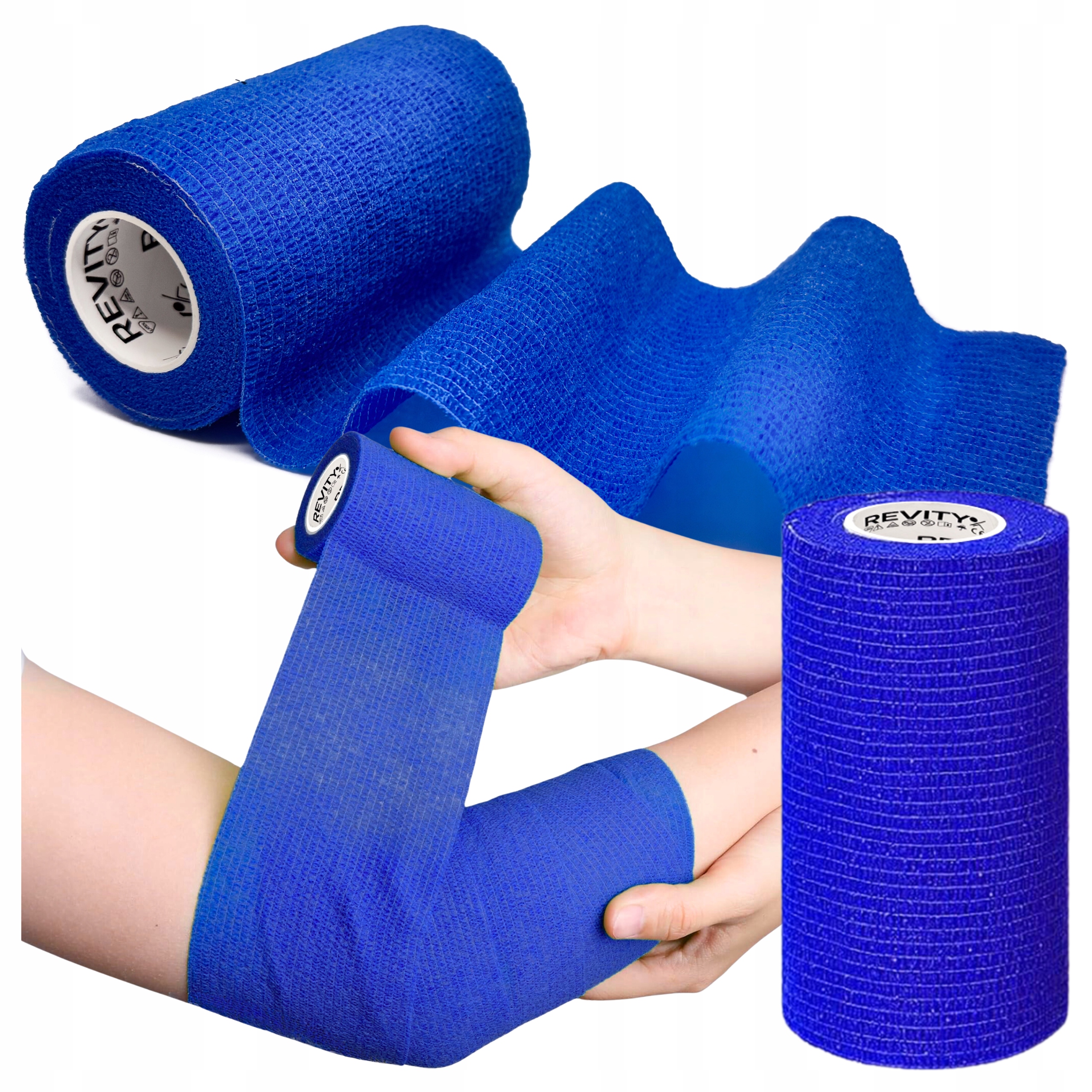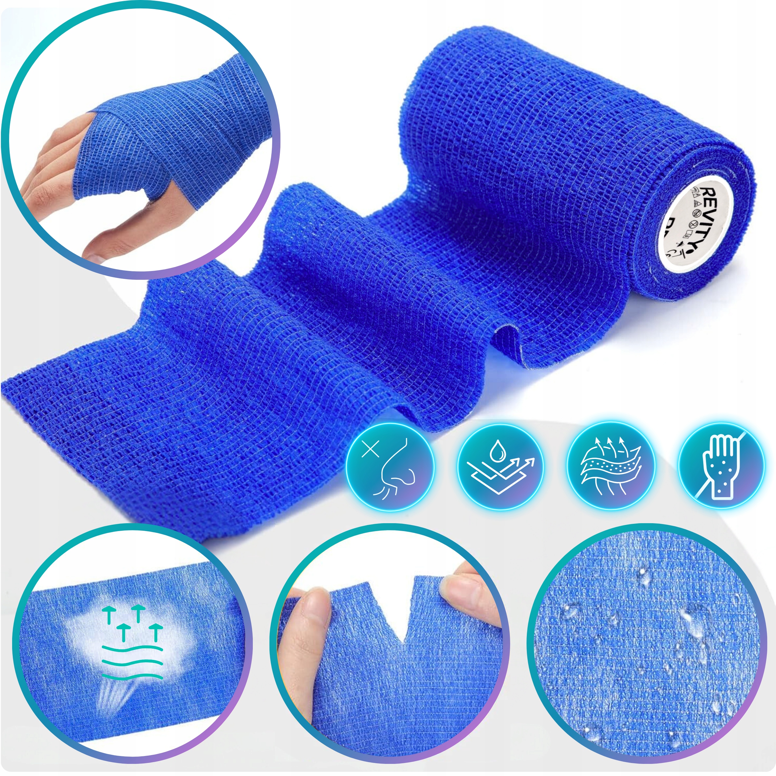 Bandaż kohezyjny (samoprzylepny) Revity to elastyczny opatrunek, który przylega wyłącznie do siebie, a nie klei się do skóry, włosów ani odzieży. Jest przepuszczalny dla powietrza, nie nasiąka wodą i po nałożeniu nie strzępi się. Można go rwać ręcznie — bez nożyczek i bez dodatkowych zapinek. Produkt przeznaczony dla ludzi i zwierząt; sprawdza się w sporcie, medycynie i weterynarii. Oznaczony jako wyrób medyczny klasy I z certyfikatem CE.