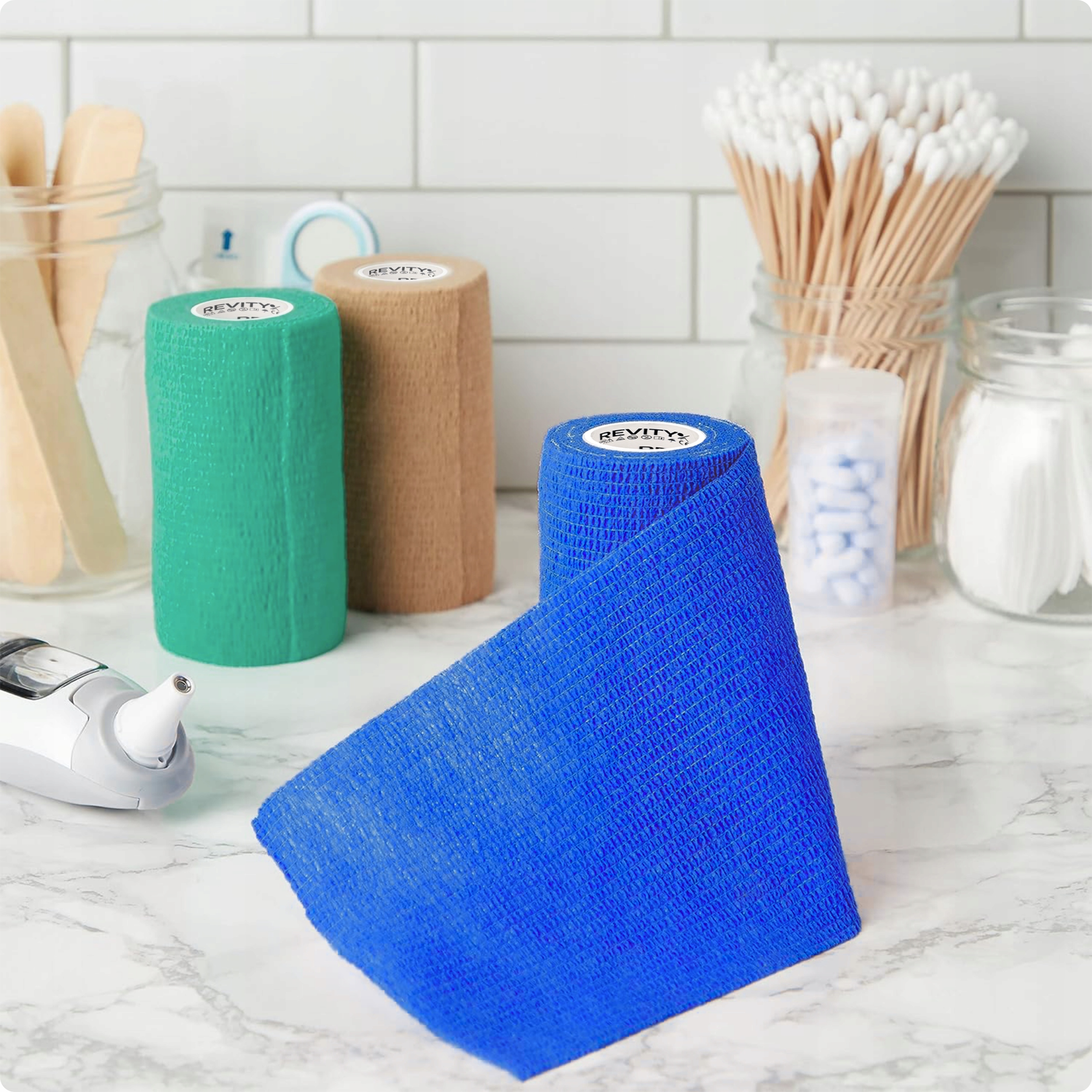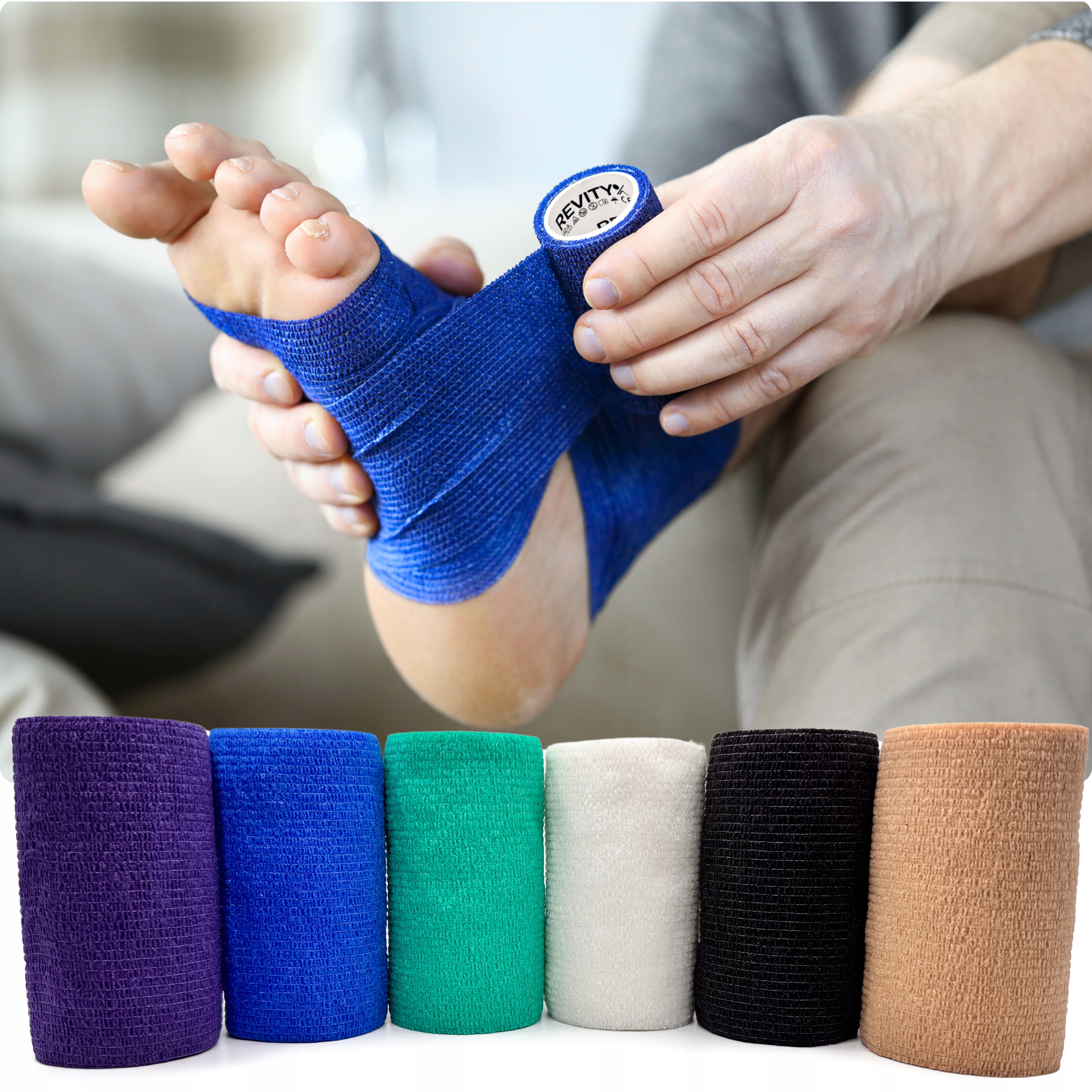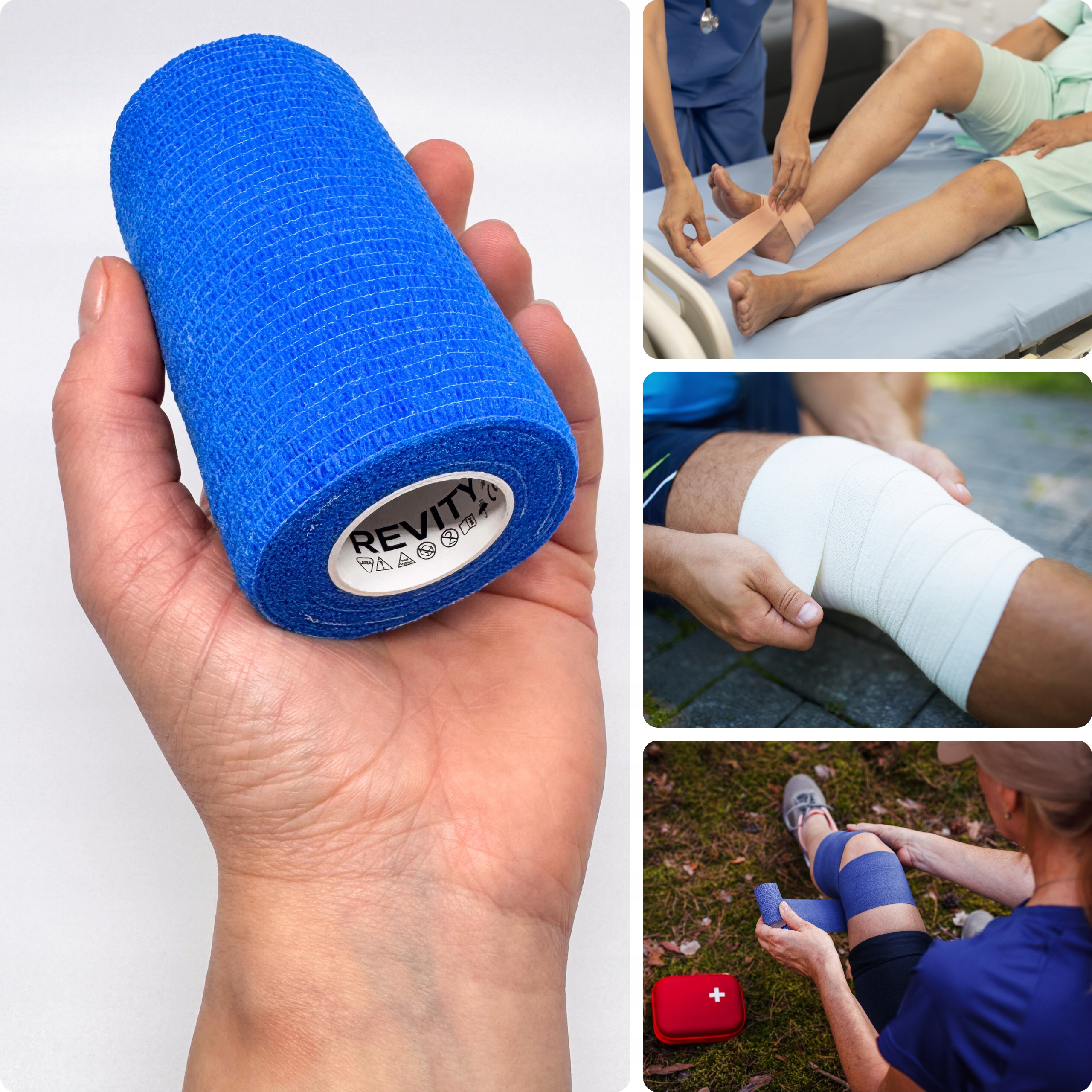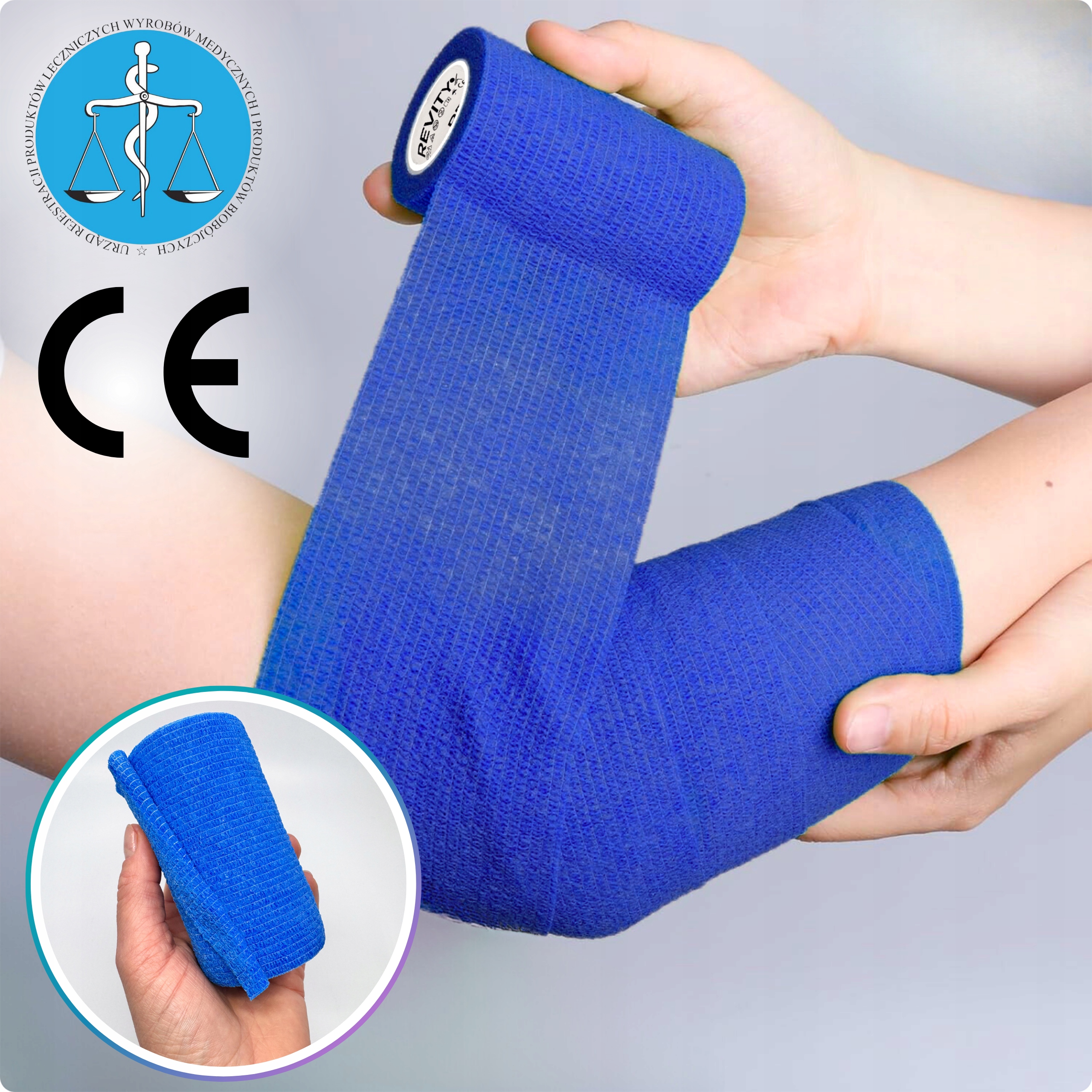 Bandaż kohezyjny (samoprzylepny) Revity to elastyczny opatrunek, który przylega wyłącznie do siebie, a nie klei się do skóry, włosów ani odzieży. Jest przepuszczalny dla powietrza, nie nasiąka wodą i po nałożeniu nie strzępi się. Można go rwać ręcznie — bez nożyczek i bez dodatkowych zapinek. Produkt przeznaczony dla ludzi i zwierząt; sprawdza się w sporcie, medycynie i weterynarii. Oznaczony jako wyrób medyczny klasy I z certyfikatem CE.