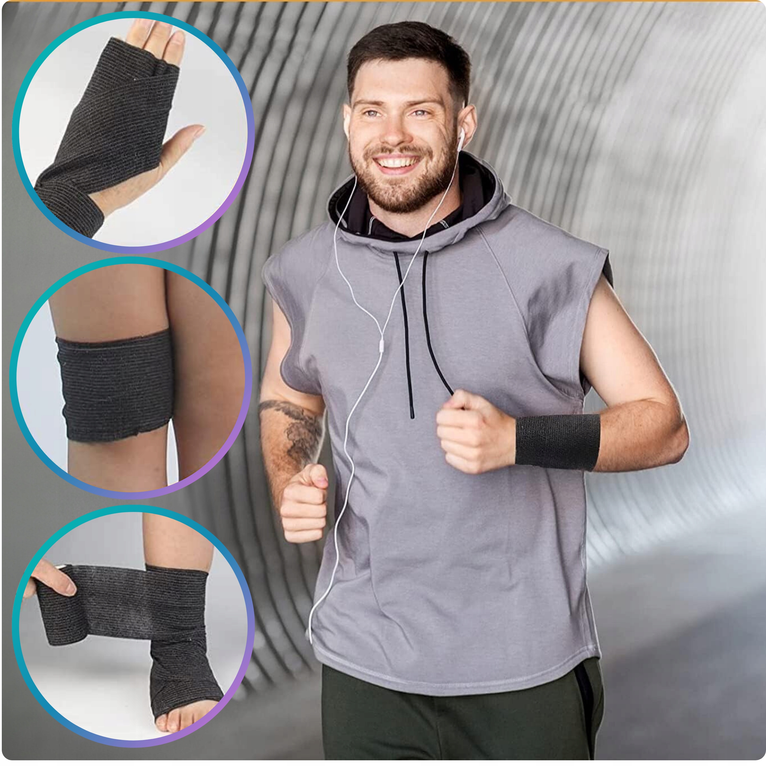 • Sport: podtrzymanie i kompresja, pomoc w stabilizacji stawów i mięśni, profilaktyka drobnych urazów.