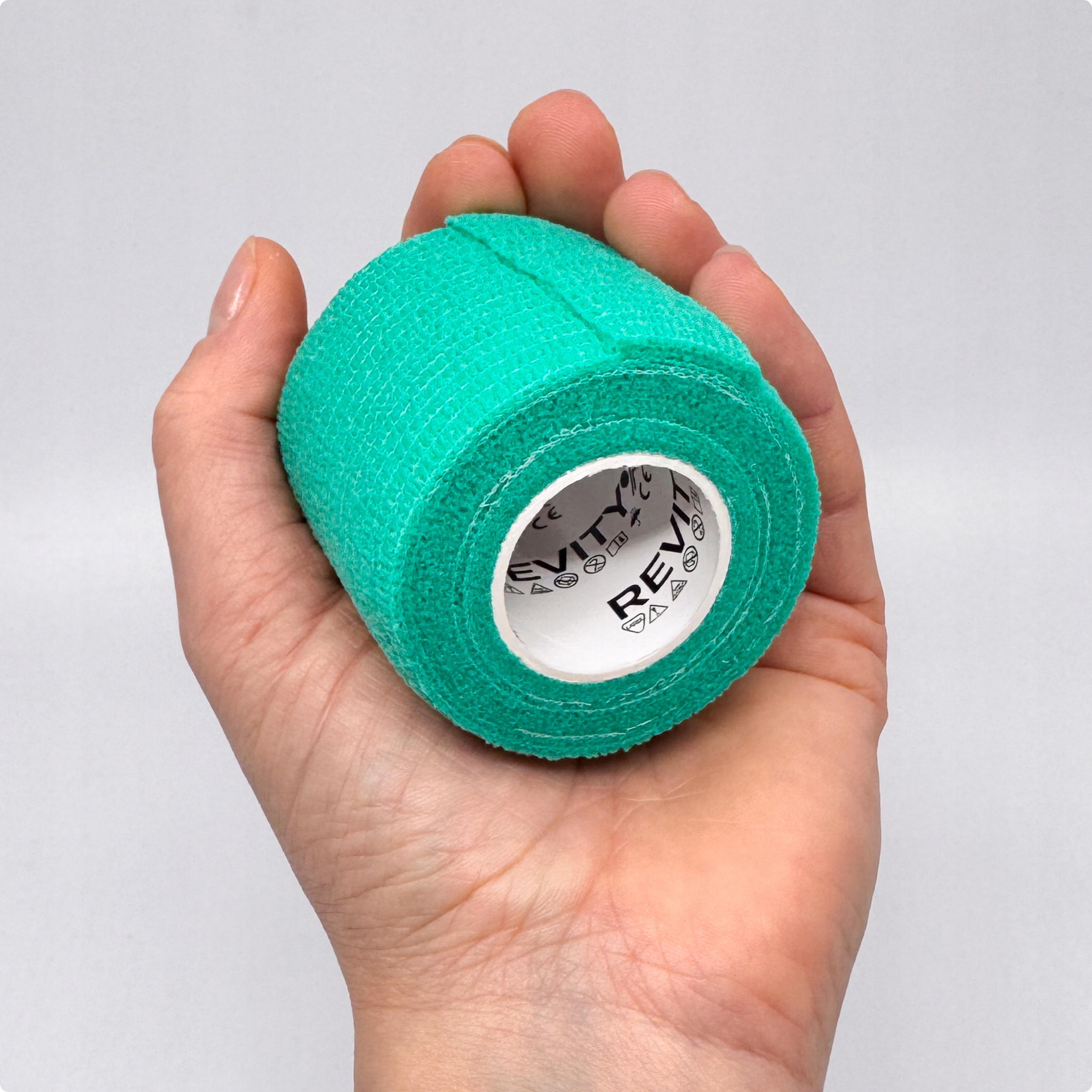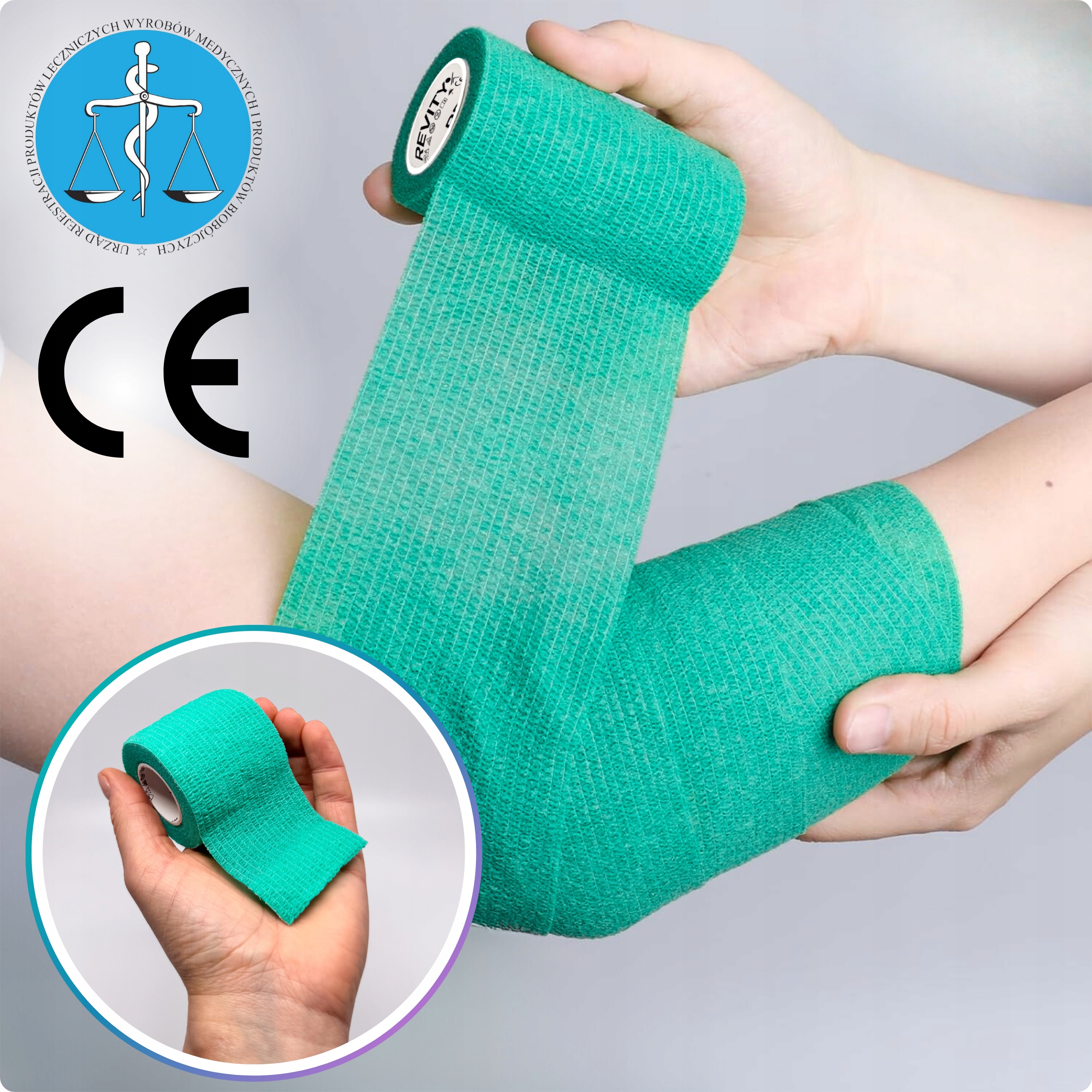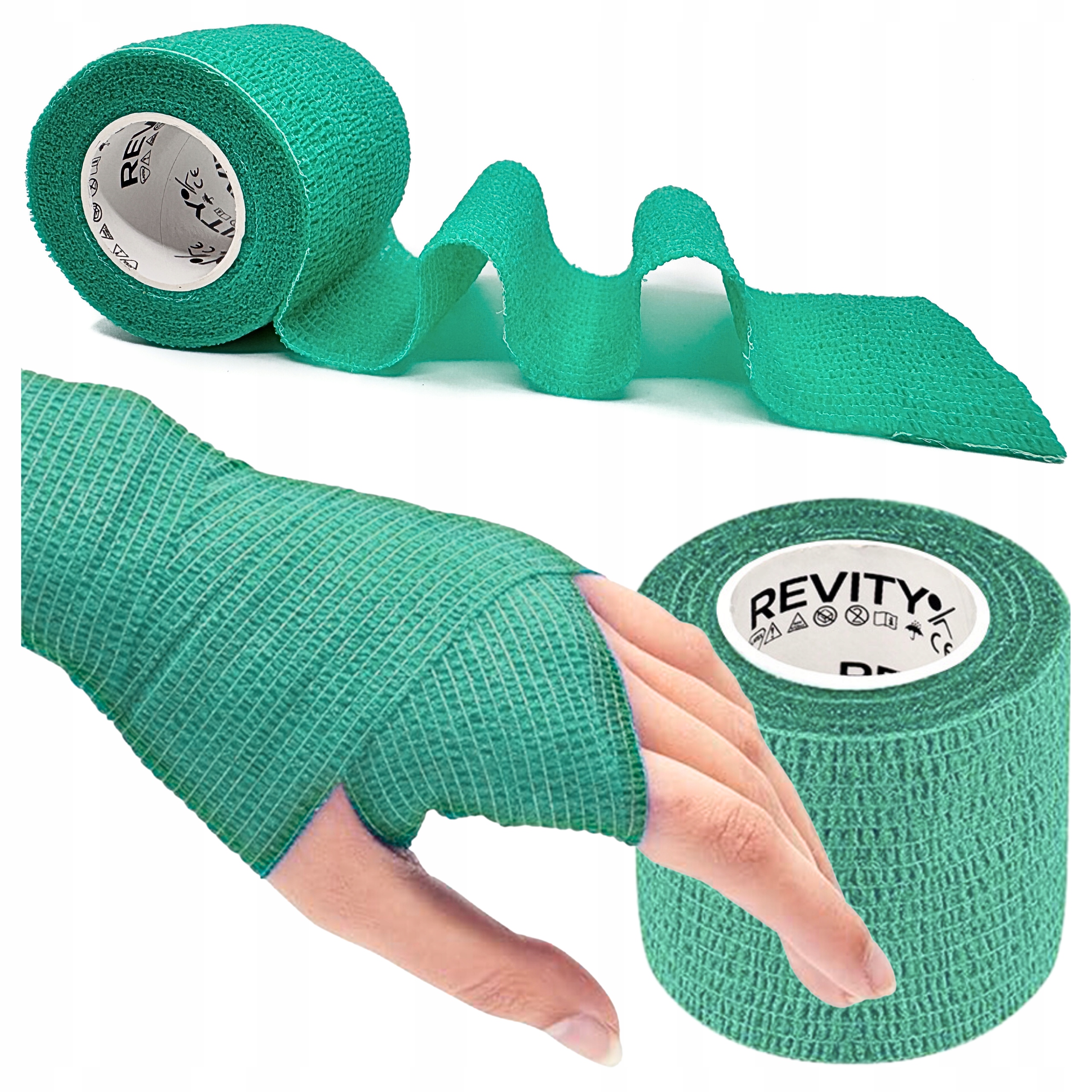 Bandaż kohezyjny (samoprzylepny) Revity to elastyczny opatrunek, który przylega wyłącznie do siebie, a nie klei się do skóry, włosów ani odzieży. Jest przepuszczalny dla powietrza, nie nasiąka wodą i po nałożeniu nie strzępi się. Można go rwać ręcznie — bez nożyczek i bez dodatkowych zapinek. Produkt przeznaczony dla ludzi i zwierząt; sprawdza się w sporcie, medycynie i weterynarii. Oznaczony jako wyrób medyczny klasy I z certyfikatem CE.