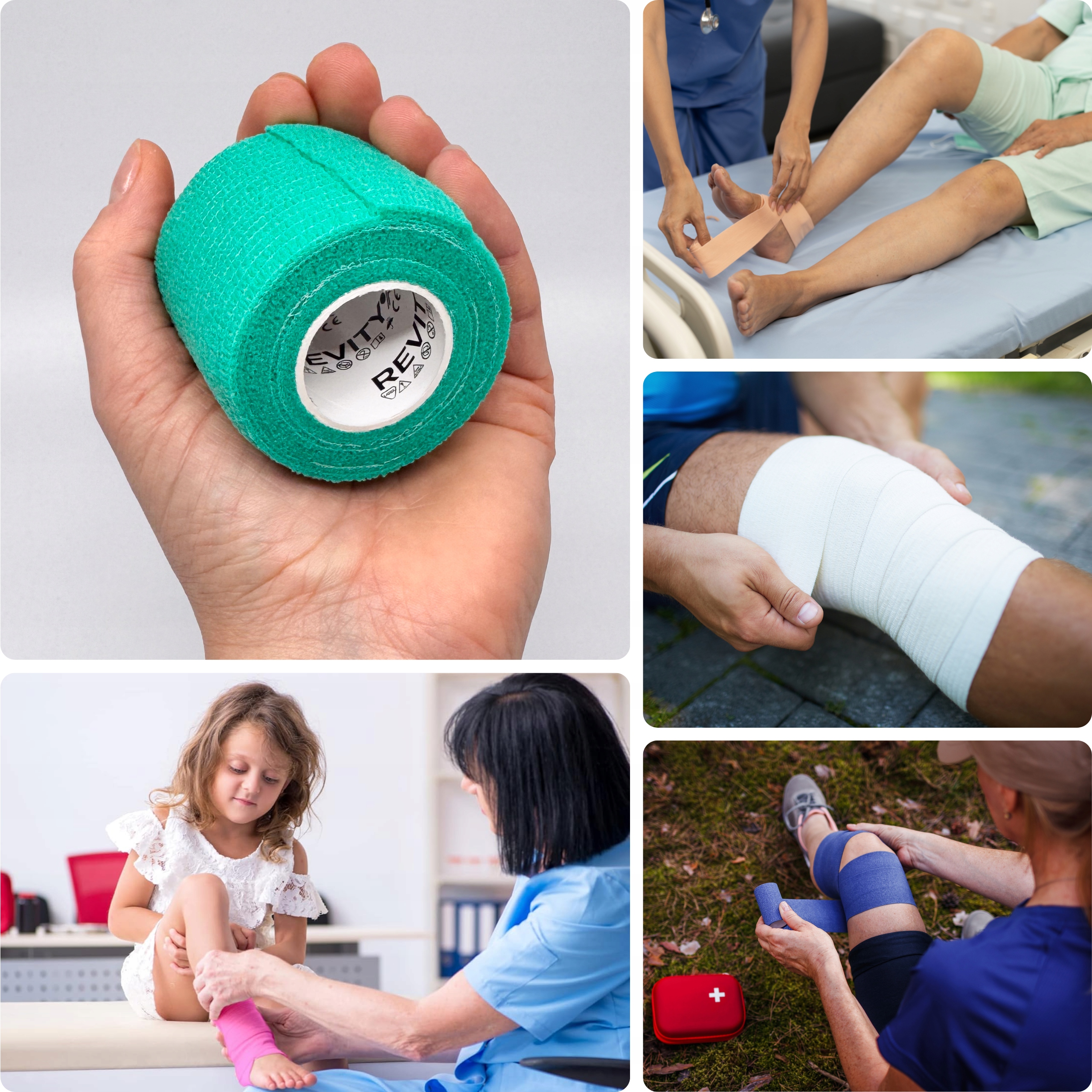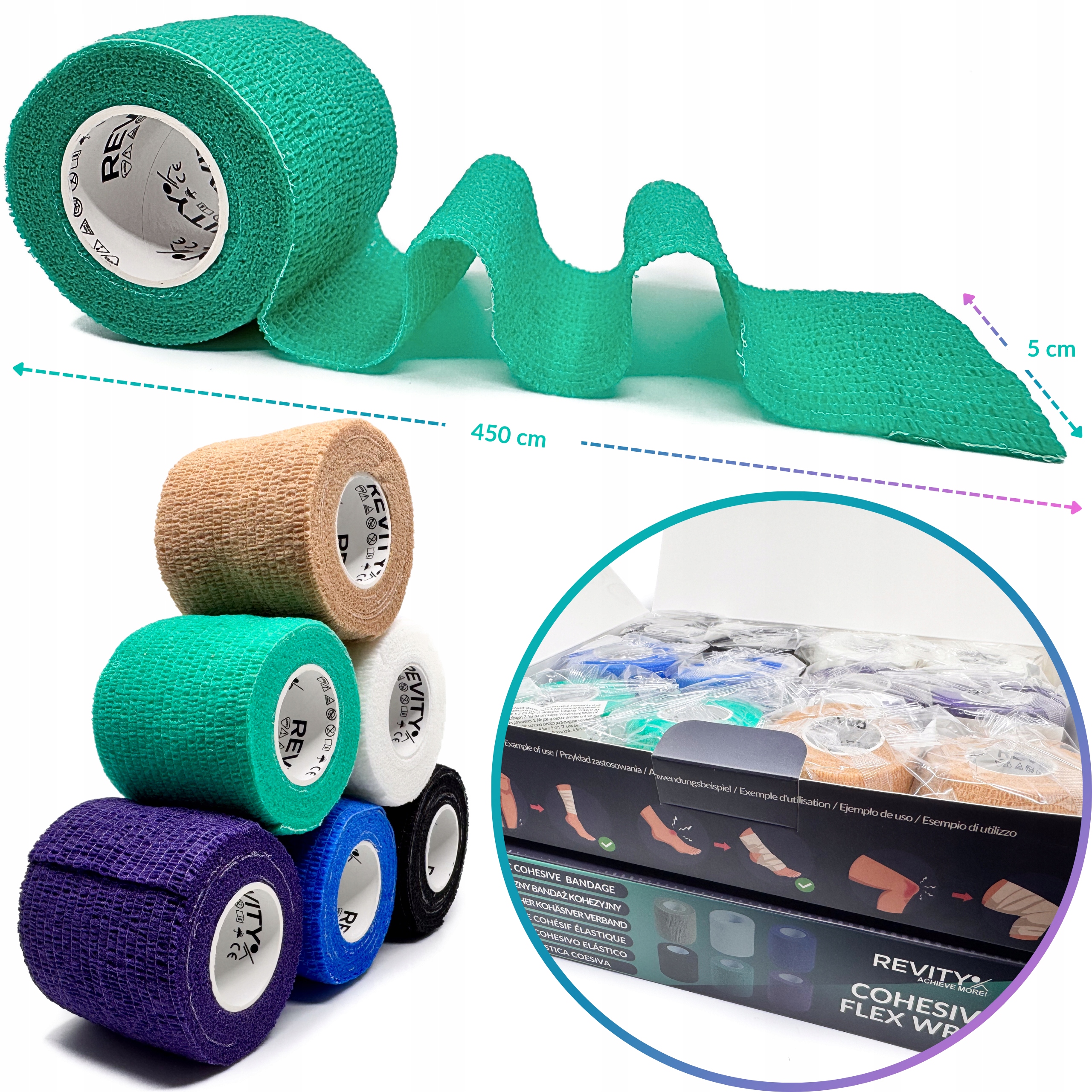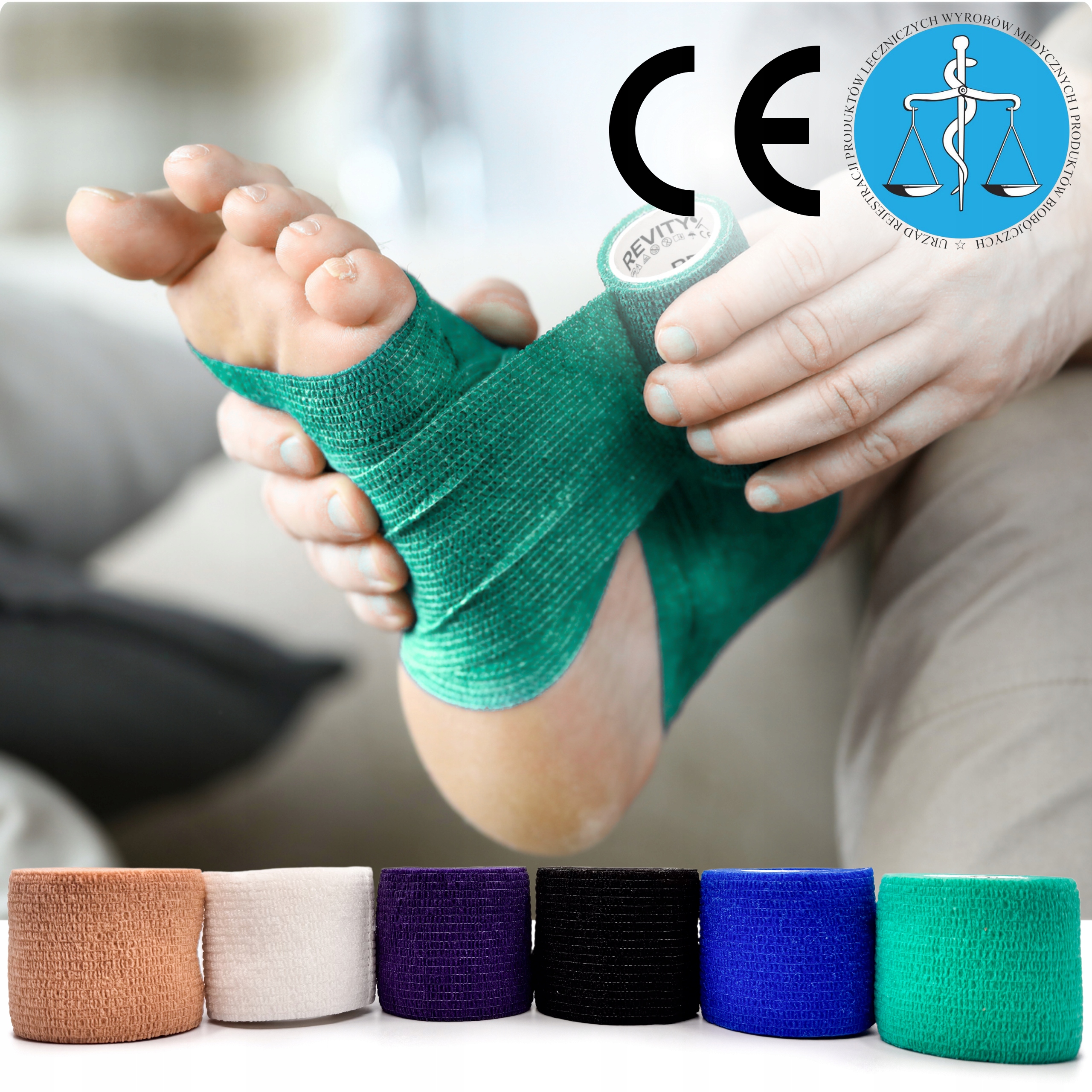 Bandaż kohezyjny (samoprzylepny) Revity to elastyczny opatrunek, który przylega wyłącznie do siebie, a nie klei się do skóry, włosów ani odzieży. Jest przepuszczalny dla powietrza, nie nasiąka wodą i po nałożeniu nie strzępi się. Można go rwać ręcznie — bez nożyczek i bez dodatkowych zapinek. Produkt przeznaczony dla ludzi i zwierząt; sprawdza się w sporcie, medycynie i weterynarii. Oznaczony jako wyrób medyczny klasy I z certyfikatem CE.