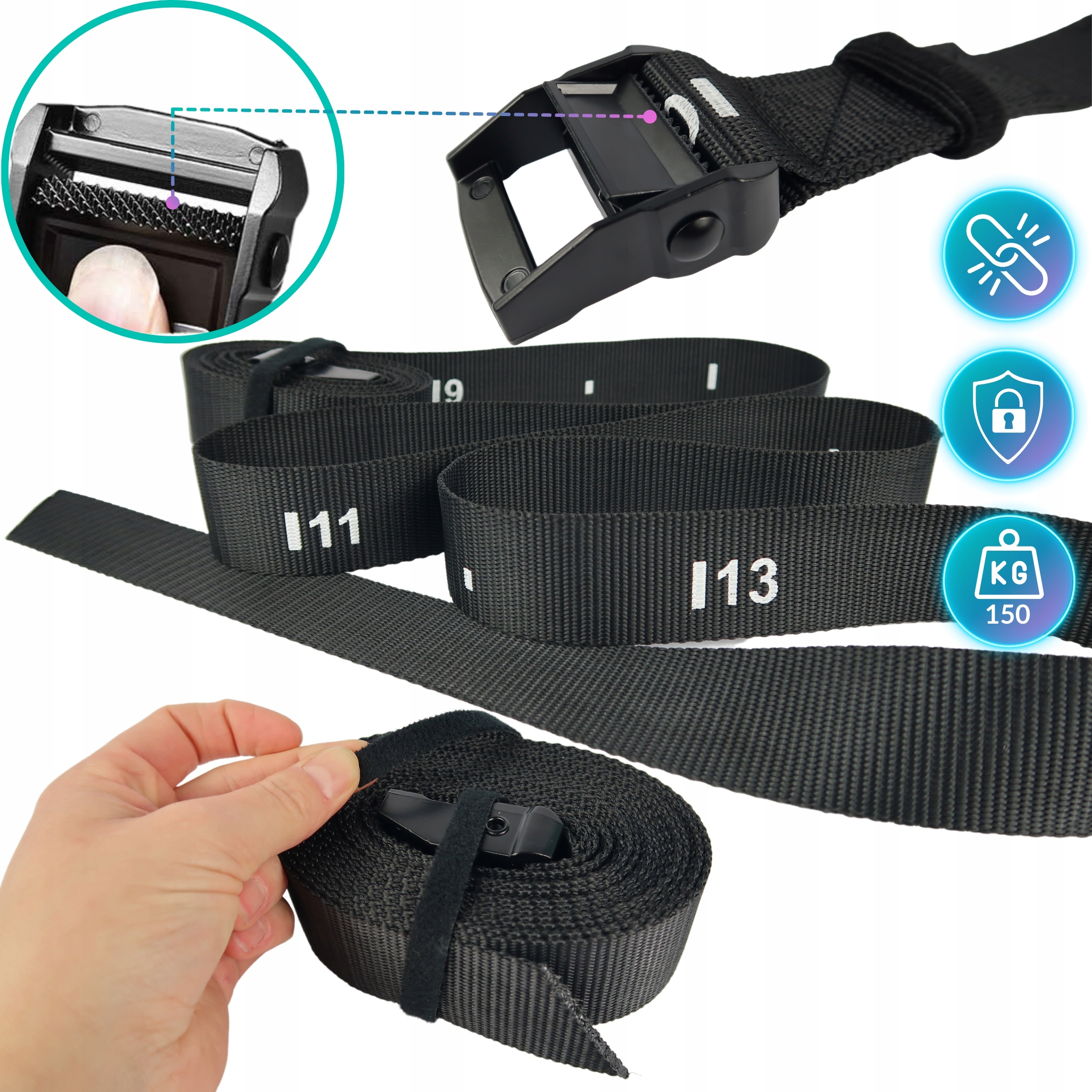 ✅ Pasy są szerokie, metalowe sprzączki masywne i skutecznie blokują pasy przed poślizgiem. Łatwo je wyregulować w przeciwieństwie do konkurencyjnych rozwiązań. Dodatkowo pasy mają na swoich końcach rzepy, które ułatwiają przechowywanie.