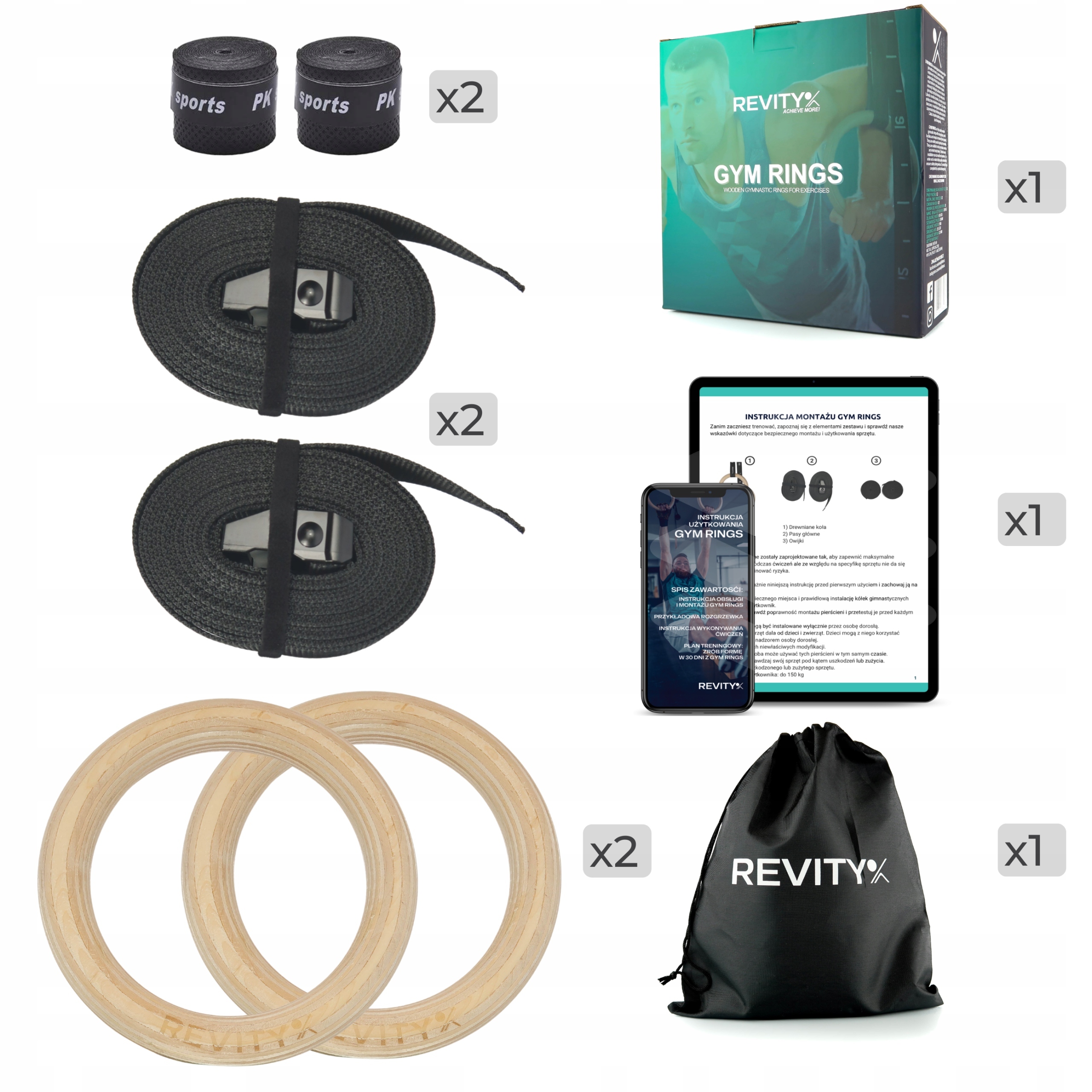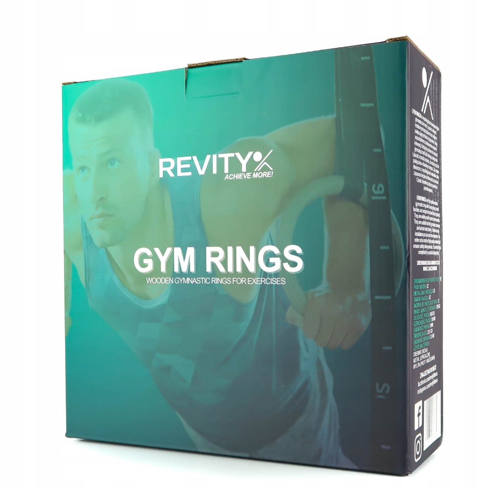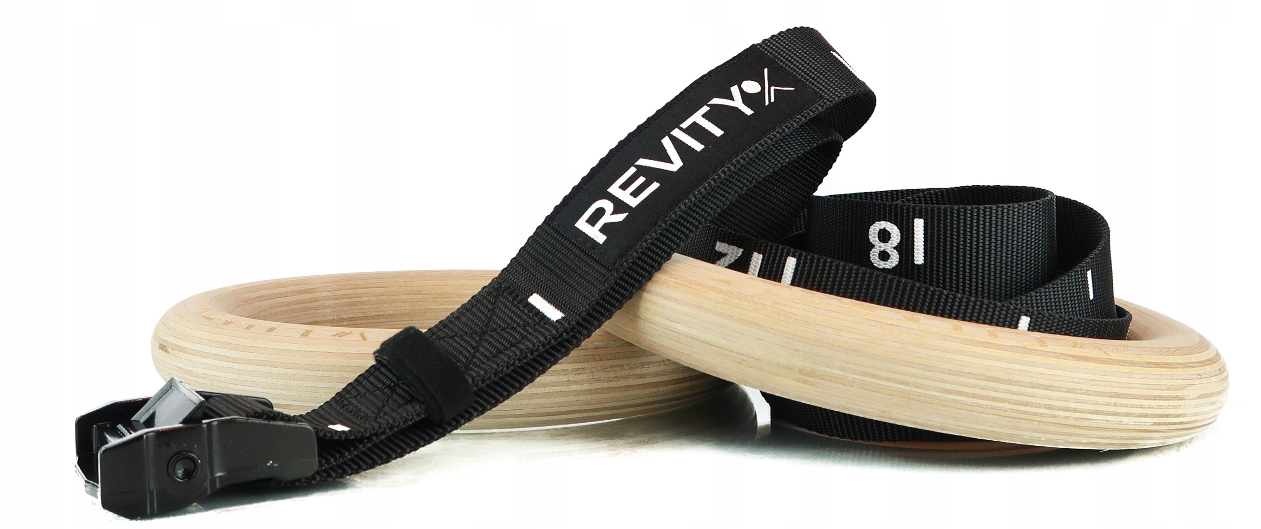 GYM RINGS marki REVITY to koła gimnastyczne wykonane z najwyższej jakości materiałów: pasów o bardzo wysokiej nośności, stalowych malowanych proszkowo sprzączek oraz drewnianych pierścieni. Pasy zdecydowaliśmy wykonać nieco szersze niż w przypadku innych modeli dostępnych na rynku (38 mm) oraz nieco grubsze aby zapewnić lepszy chwyt i rozłożenie obciążenia. Zestaw jest kompletny i w jego skład wchodzą: 2 drewniane koła, 2 pasy nośne ze sprzączkami oraz miarką, 2 owijki do kółek (poprawa chwytu) oraz woreczka do przechowywania.