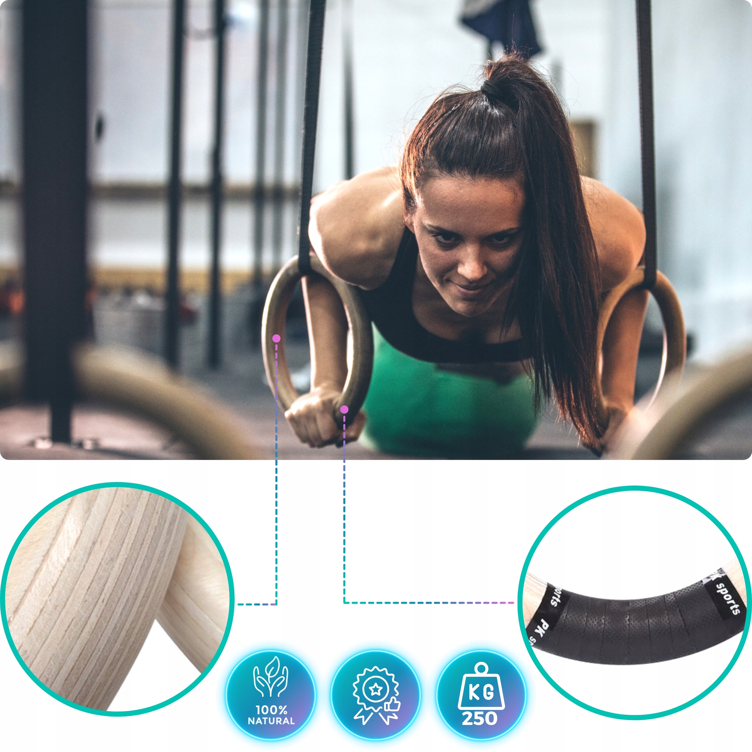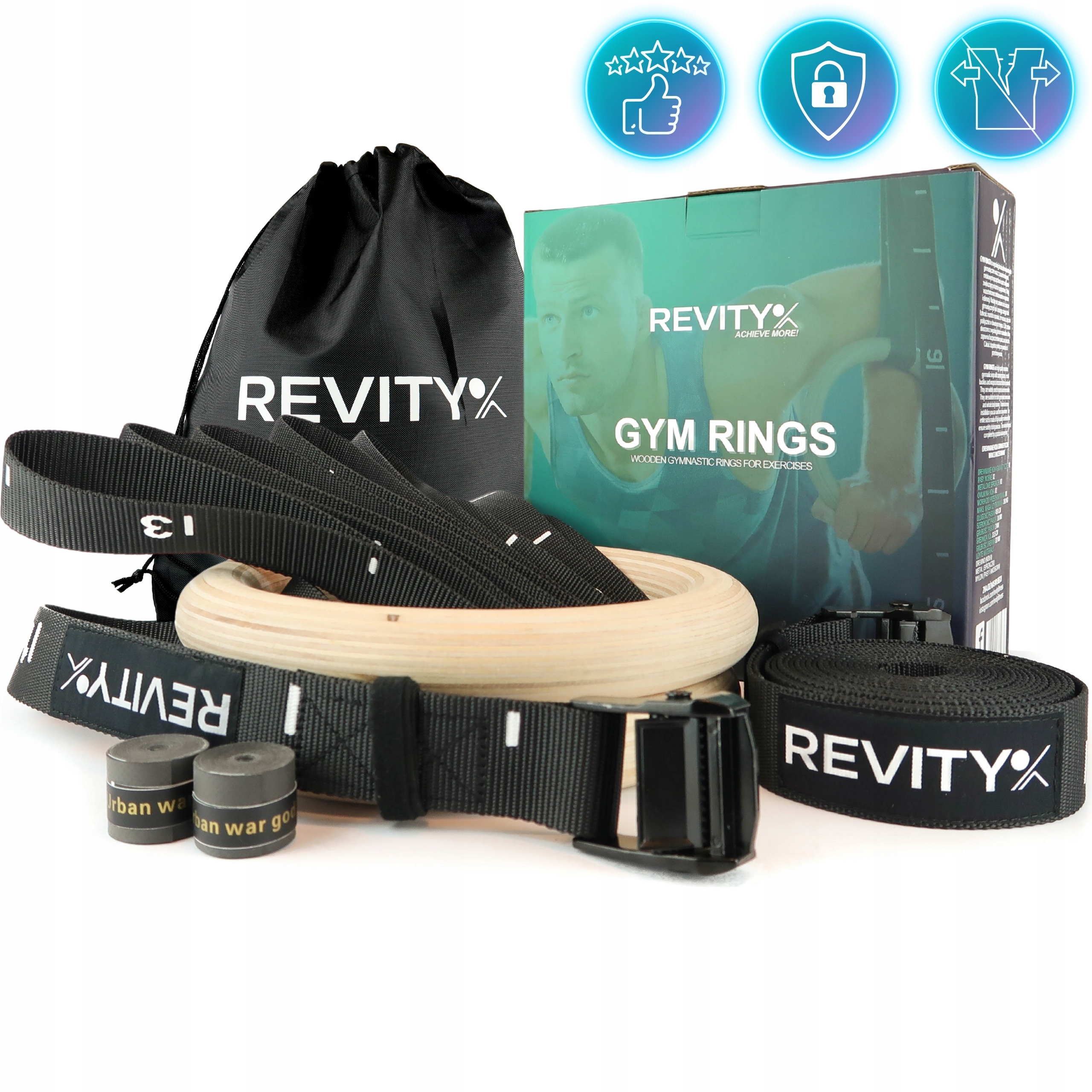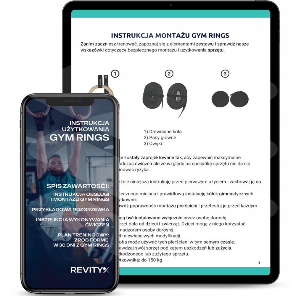 GYM RINGS marki REVITY to koła gimnastyczne wykonane z najwyższej jakości materiałów: pasów o bardzo wysokiej nośności, stalowych malowanych proszkowo sprzączek oraz drewnianych pierścieni. Pasy zdecydowaliśmy wykonać nieco szersze niż w przypadku innych modeli dostępnych na rynku (38 mm) oraz nieco grubsze aby zapewnić lepszy chwyt i rozłożenie obciążenia. Zestaw jest kompletny i w jego skład wchodzą: 2 drewniane koła, 2 pasy nośne ze sprzączkami oraz miarką, 2 owijki do kółek (poprawa chwytu) oraz woreczka do przechowywania.