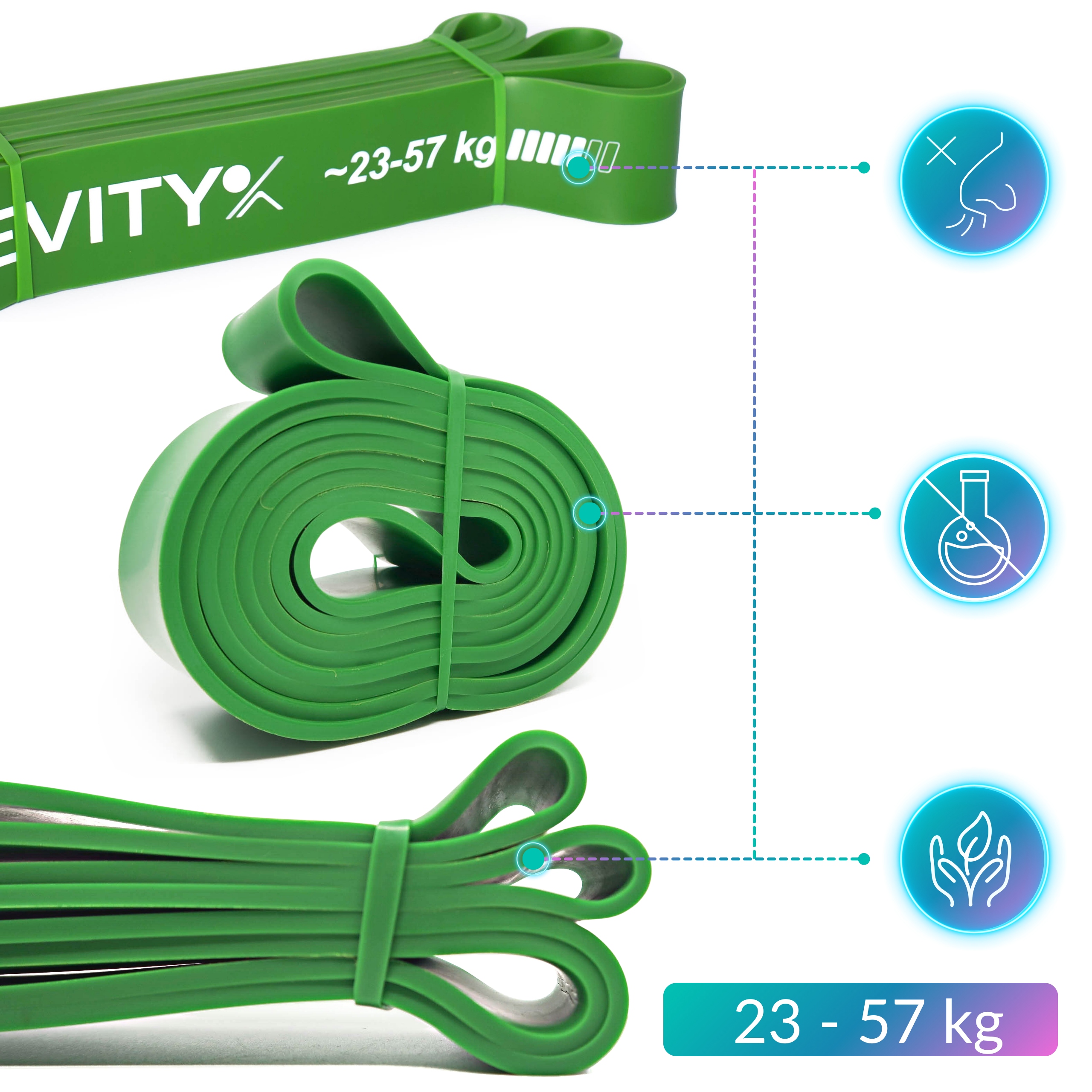 ✅ Opór gumy zielonej jest w przedziale 23-57 kg. Każda guma ma swój unikalny opór, aby łatwo można było dostosować opór do konkretnego ćwiczenia oraz poziomu zaawansowania. Guma ma rozmiar 4,5 mm x 2080 mm (długość pętli) x 45 mm. Z użyciem tej gumy wykonasz trening większych partii ciała.