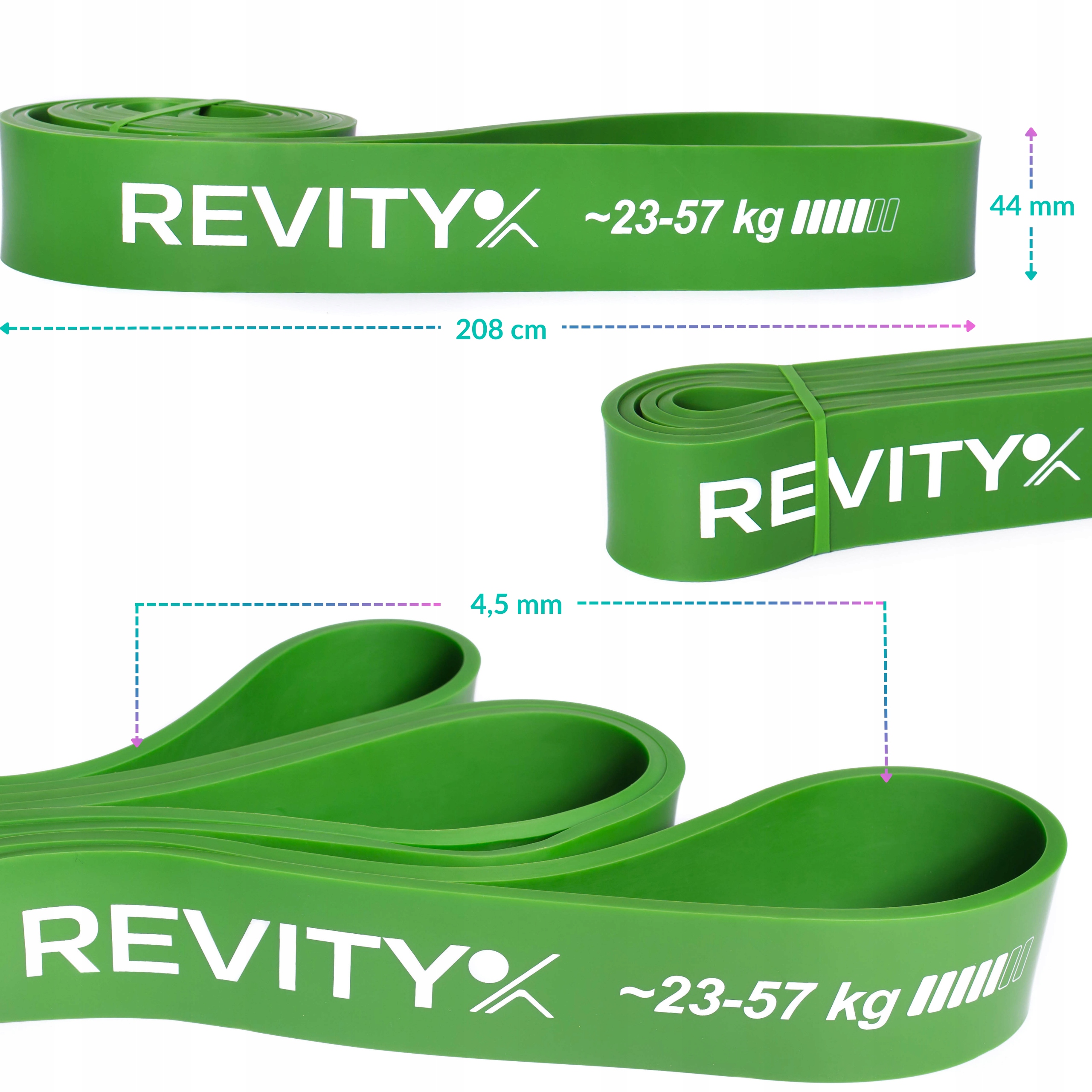 ➡️ Kolor zielony, grubość 44 mm, opór 23-57 kg, długość pętli 208 cm