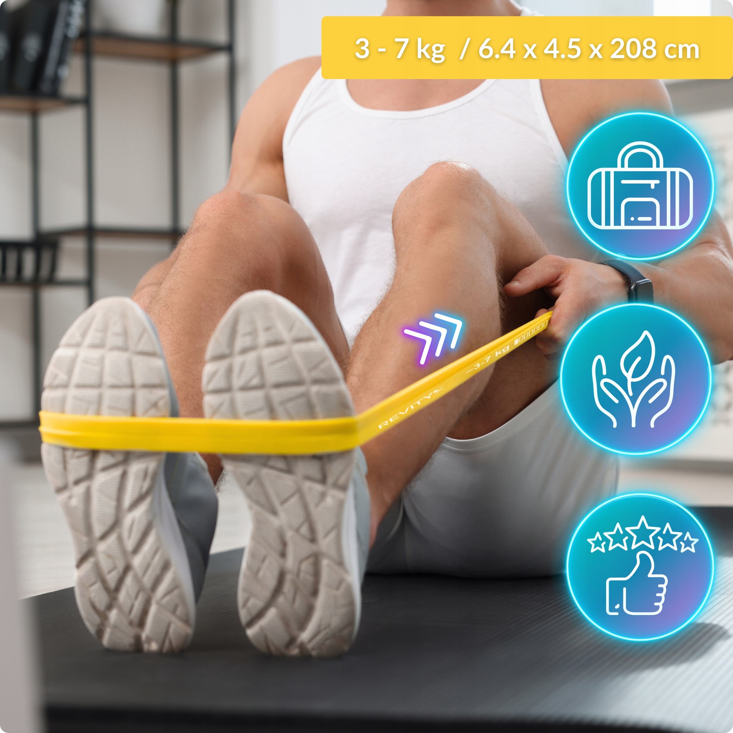 ➡️ Kolor żółty, grubość 6.4 mm, opór 3-7 kg, długość pętli 208 cm