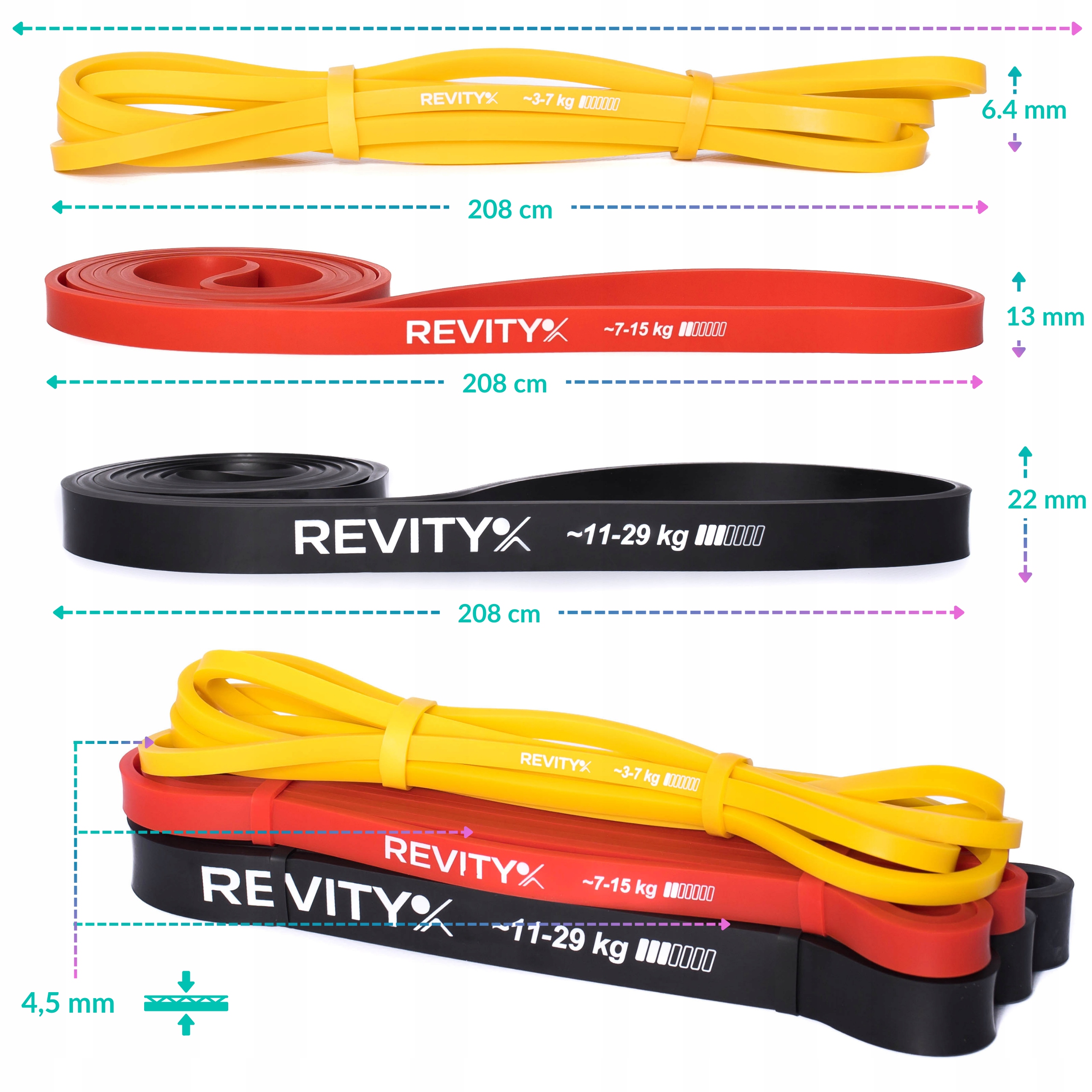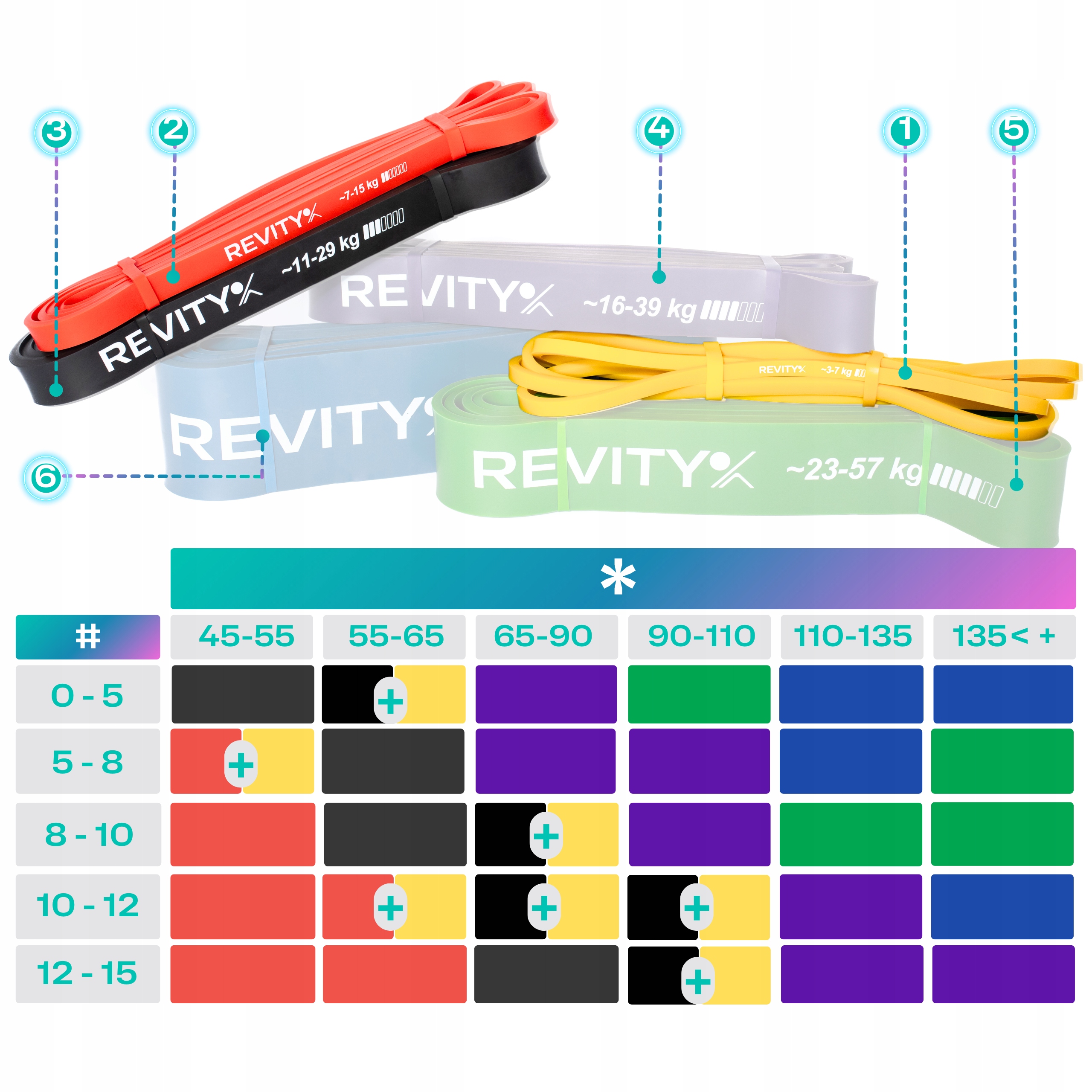 ✅ ŁATWOŚĆ DOBORU ĆWICZEŃ - Na każdej z gum znajduje się nasze logo oraz wartość oporu wraz ze skalą.