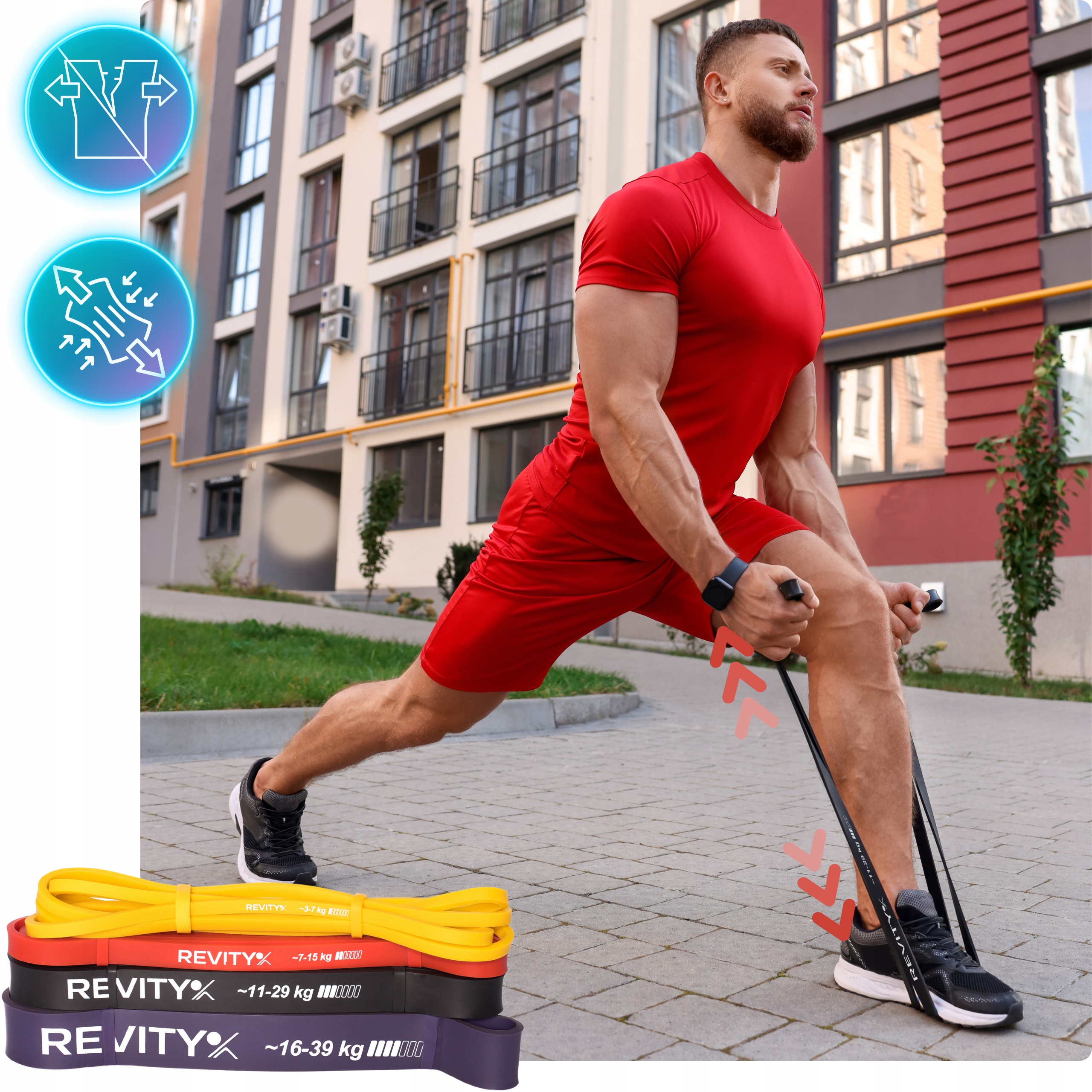 Gumy do ćwiczeń Power Band A+ marki REVITY to ulepszona wersja taśm oporowych Power Band wykonana z najwyższej jakości naturalnego lateksu. Taśmy przeznaczone są do treningu fitness, oporowego, crossfit czy siłowego. Mają formę zamkniętych pętli, są niewielkie dlatego można je ze sobą zabrać w zasadzie wszędzie. Nasze gumy wykorzystywane są również przez fizjoterapeutów podczas terapii oraz bezpośrednio przez użytkowników w domach do rozciągania i mobility oraz powrotu do formy po kontuzji.