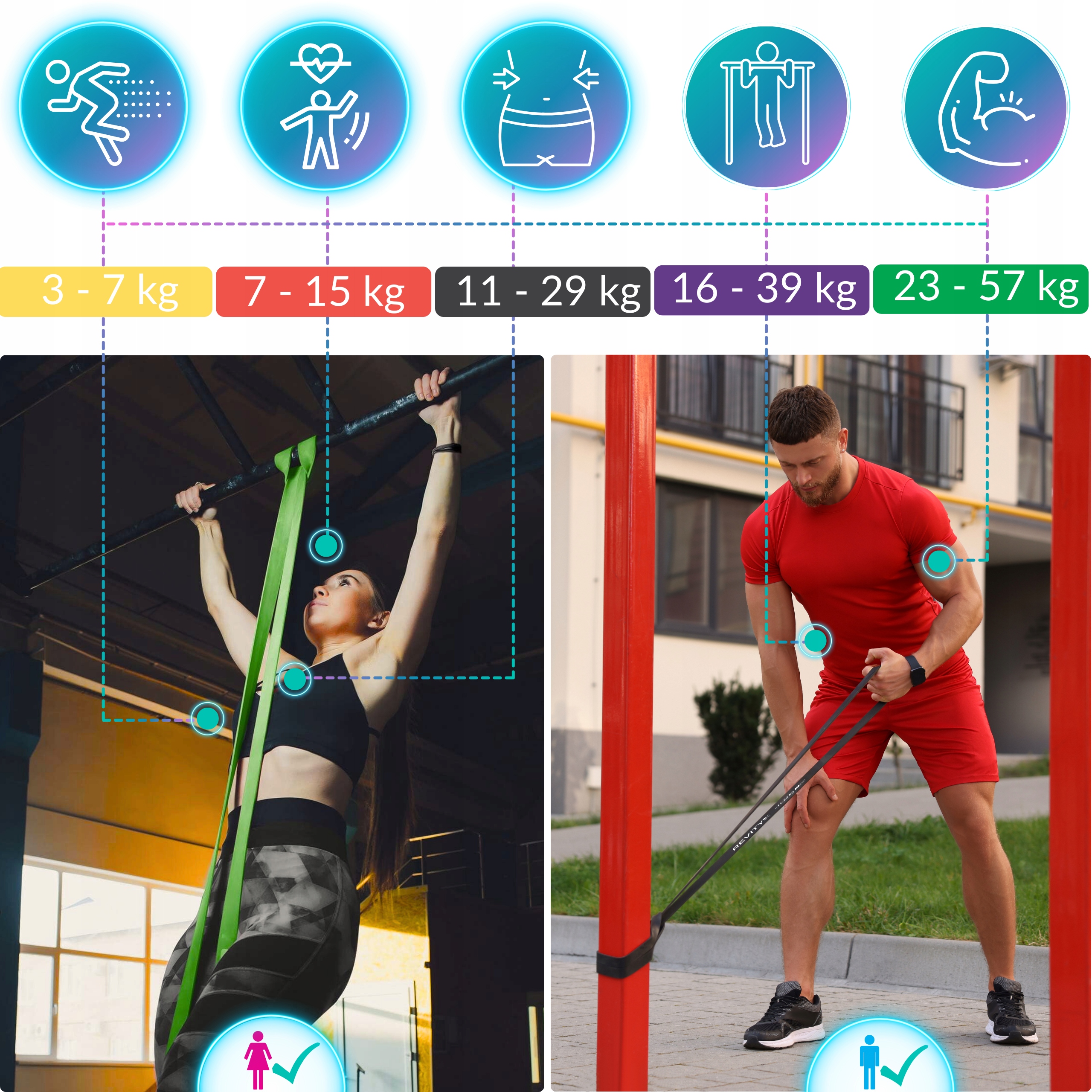 ✅ ZRÓCNICOWANE OPORY DLA KAŻDEGO - Opór gum jest w przedziale 3-57 kg. Każda guma ma swój unikalny opór, aby łatwo można było dostosować opór do konkretnego ćwiczenia oraz poziomu zaawansowania. Używając wszystkich gum jednocześnie uzyskasz opór nawet 147 kg. Gumy mają rozmiar 4,5 mm x 2080 mm (długość pętli) x 6.4 / 13 / 22 / 32 / 44 mm. Ten zestaw nie zawiera niebieskiej gumy (można dokupić osobno lub kupić zestaw 6 szt. Z użyciem tych gum wykonasz trening całego ciała i solidnie zmęczysz wszystkie możliwe mięśnie, zarówno w ćwiczeniach izolowanych jak i wielostawowych. Nadają się również do nauki i progresowania podciągania na drążku.