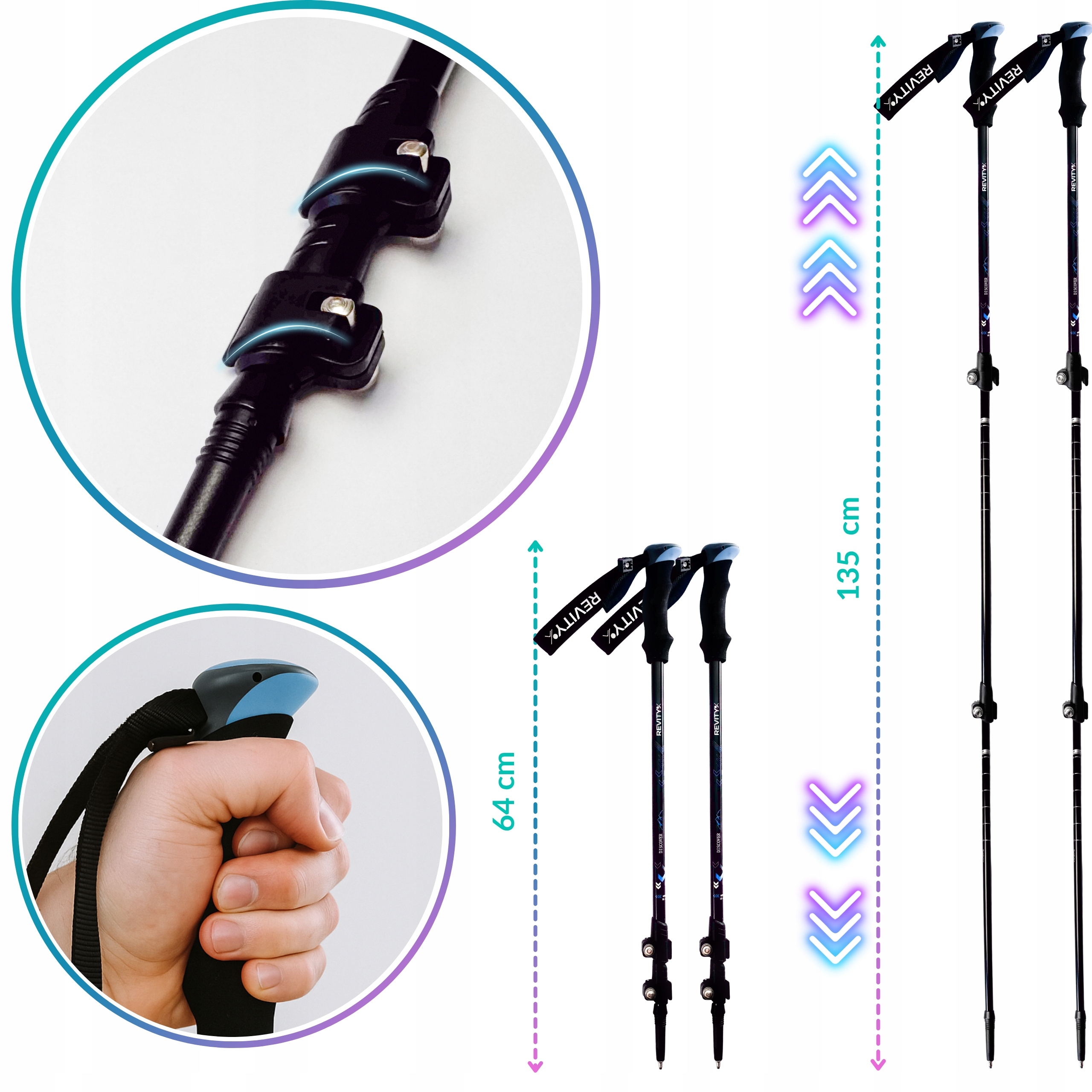 ✅ REGULOWANA DŁUGOŚĆ 64–135 cm - dzięki systemowi teleskopowemu i blokadzie zaciskowej typu Quick Lock z łatwością dostosujesz długość kijków do swojego wzrostu i warunków terenowych – nawet w rękawiczkach!