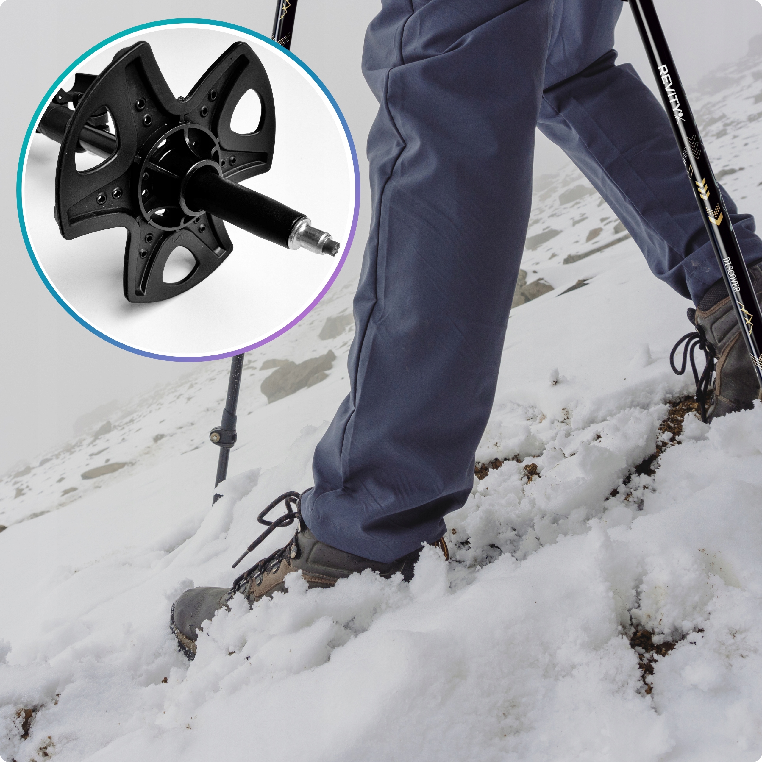 To właśnie tam kijki DISCOVER czują się najlepiej. W zestawie masz aż 8 końcówek: na śnieg, błoto, asfalt, żwir czy nierówne podłoże. Talerzyki zapobiegają zapadaniu się kijków w grząskim terenie, a grot wykonany z trwałego materiału zapewnia przyczepność nawet na skałach.