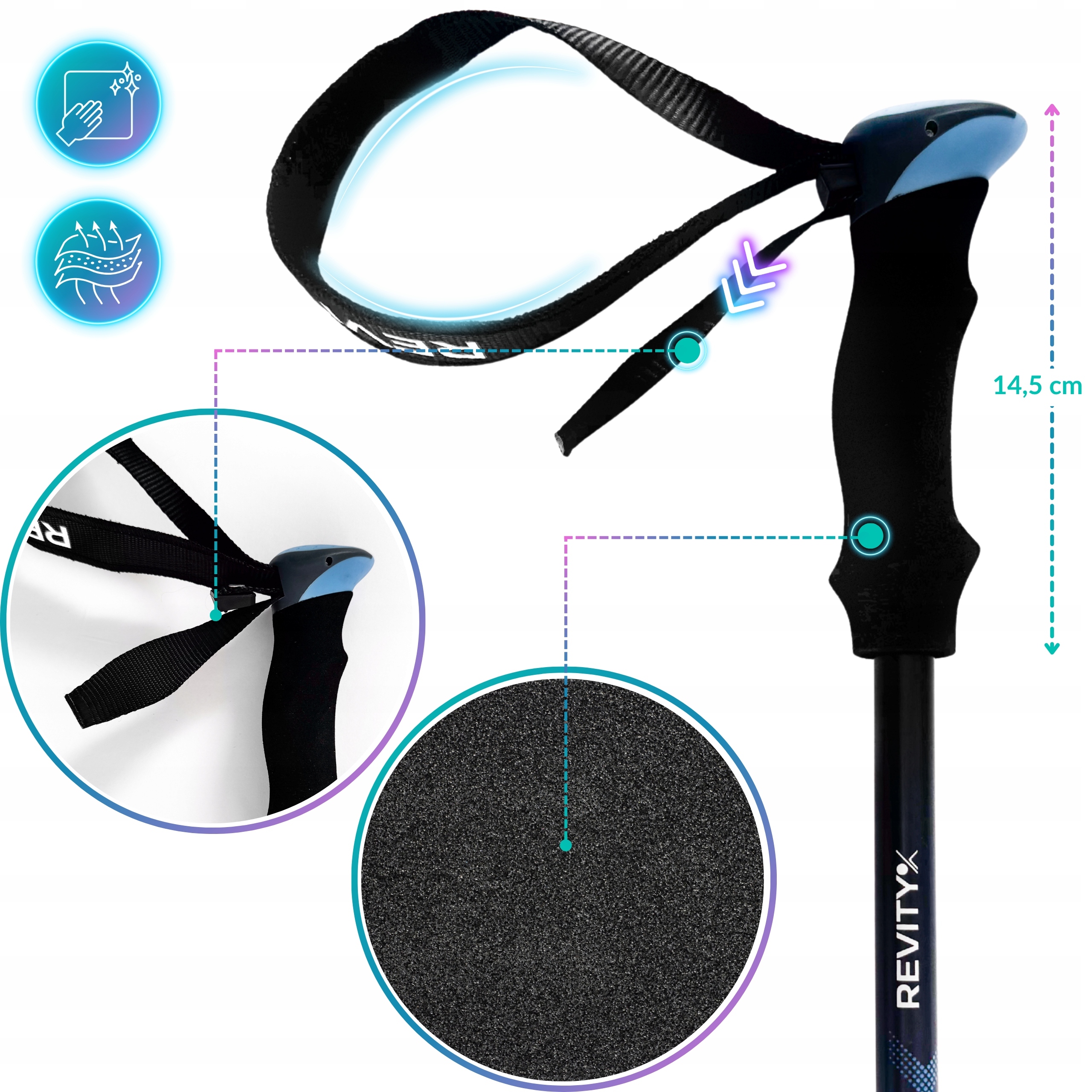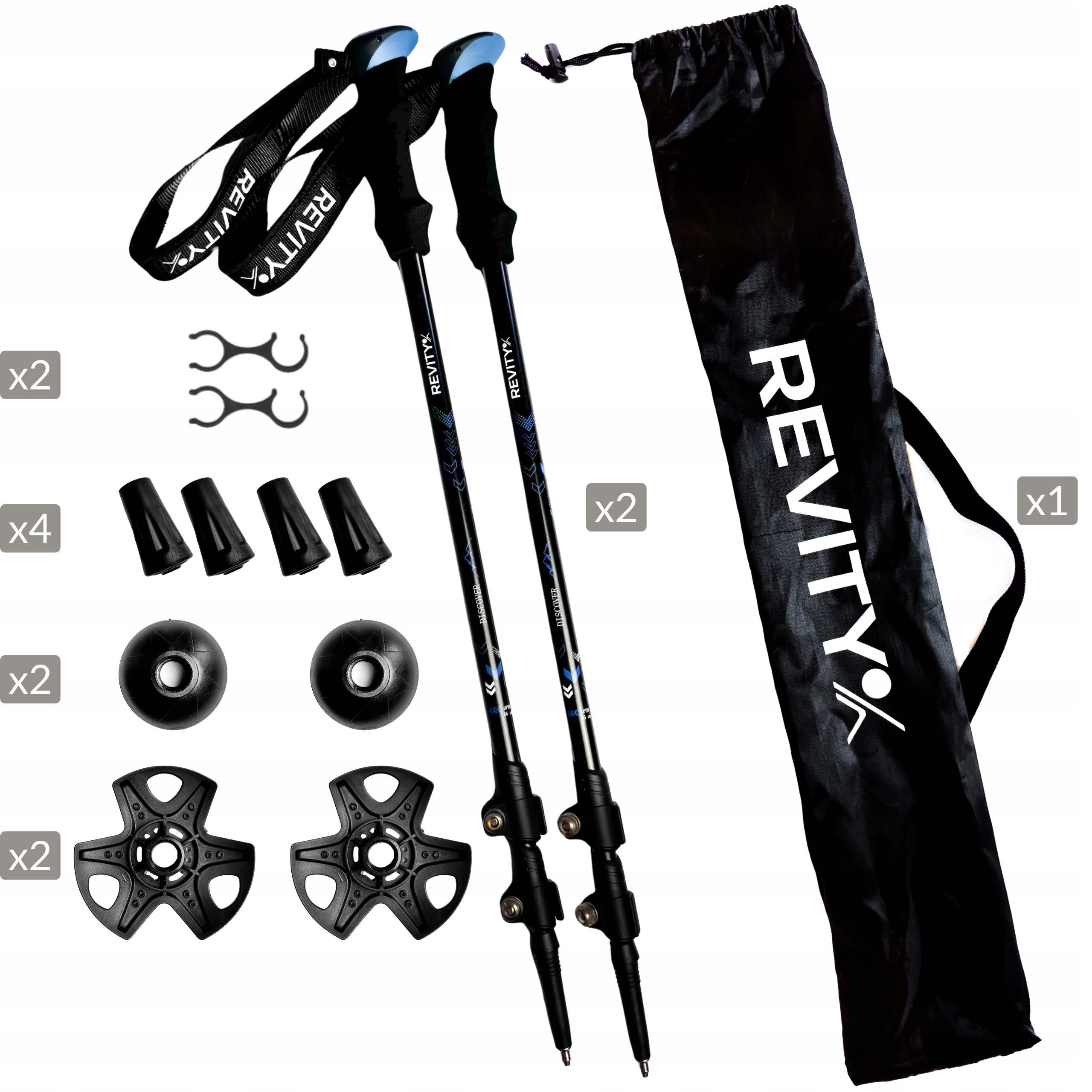 Kije trekkingowe Revity (zestaw 2 szt.) to regulowane kijki do marszu i lekkiego trekkingu, które poprawiają stabilność na szlaku i odciążają stawy podczas podejść i zejść. Zakres regulacji ok. 65–135 cm pozwala dopasować długość do wzrostu i terenu, a ergonomiczne uchwyty oraz paski nadgarstkowe ułatwiają pewny chwyt. Zestaw sprawdzi się na spacerach, w parku i w terenie – także jako wsparcie w treningu kondycyjnym.