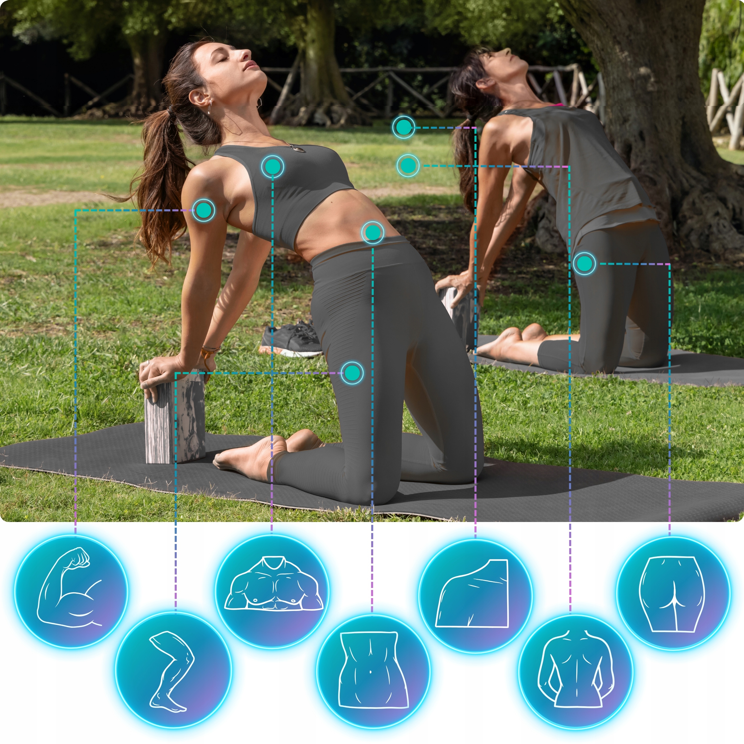 Dzięki pozycjom wykonywanym przy pomocy narzędzi pomocniczych takich jak blok do rozciągania: