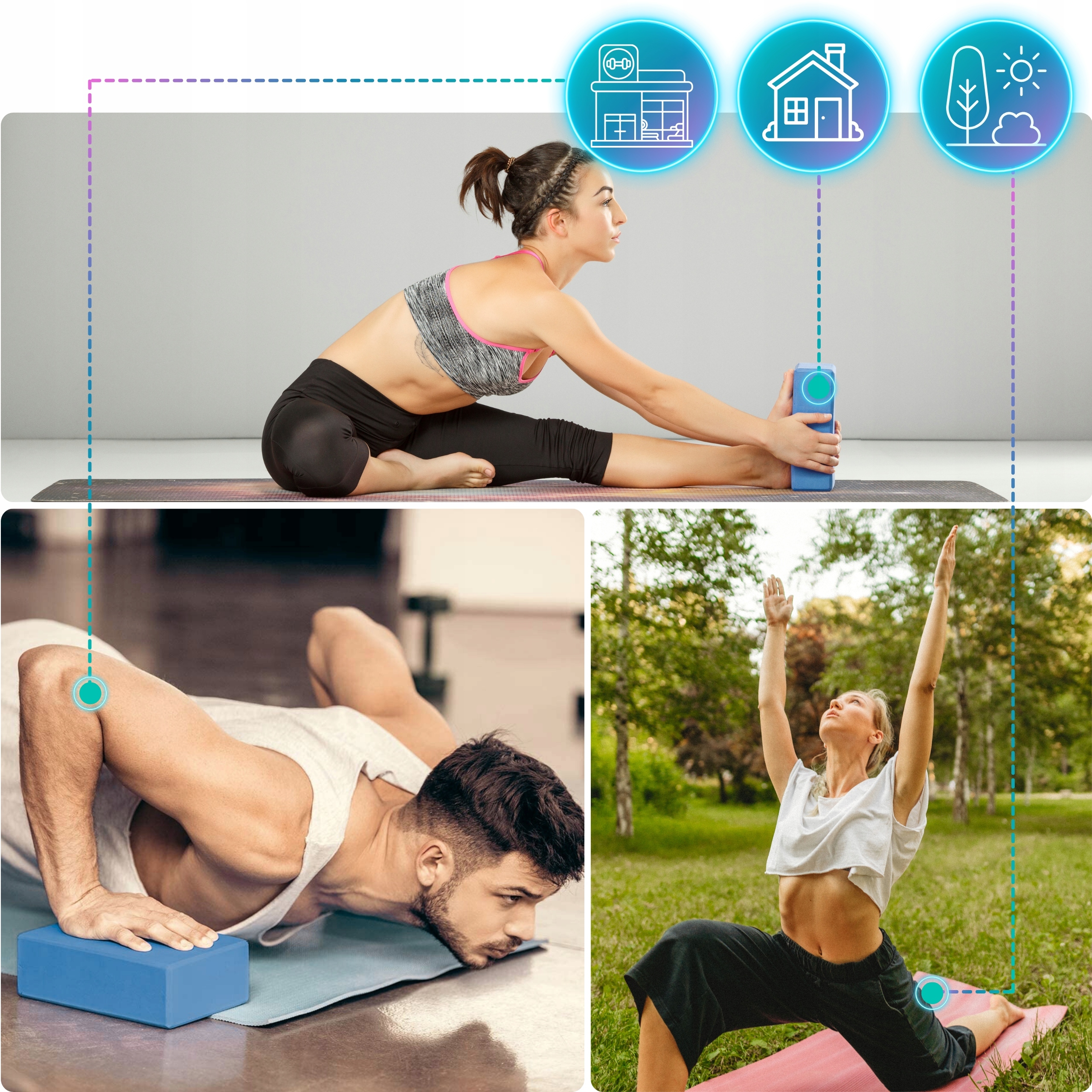 JOGA, BODY ART, STRETCHING, ZDROWY KRĘGOSŁUP, PILATES - to przenikające się formy, w których często spotkasz się z blokiem jako narzędziem pomocniczym. Wiele pozycji powtarza się w każdym z tych styli. Wszystkie z nich działają PROZDROWOTNIE i mają doskonały wpływ na ciało i umysł.