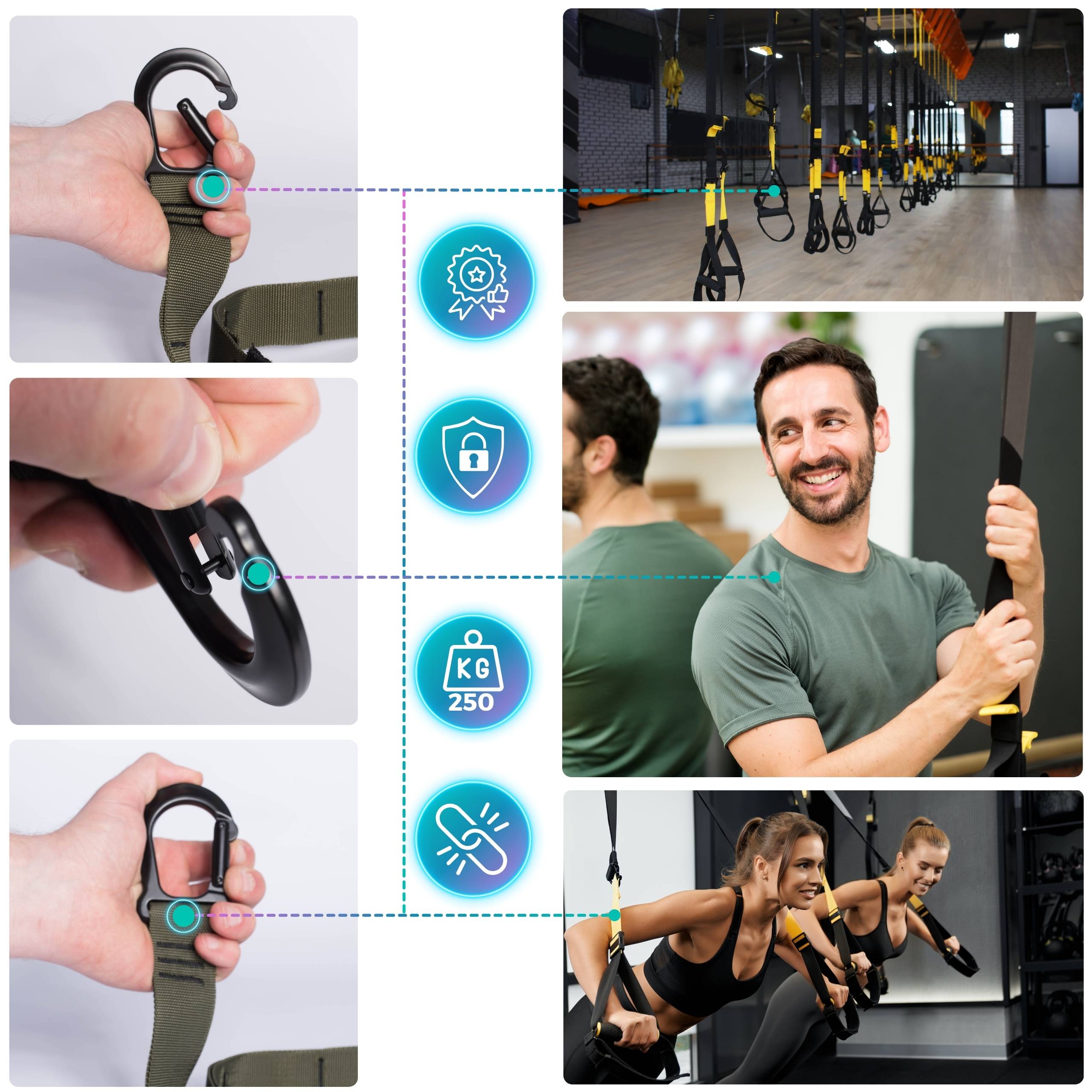 ✅ Zestaw składa się z wysokiej jakości pasów, metalowych klipsów z ząbkami, ściągaczami z gumkami, przedłużki z karabińczykiem oraz tzw. kotwicy do drzwi. Zestaw możesz używać w zależności od potrzeb. Opcjonalnie możesz też dokupić nasz hak do kompletu, który idealnie komponuje się z zestawem.