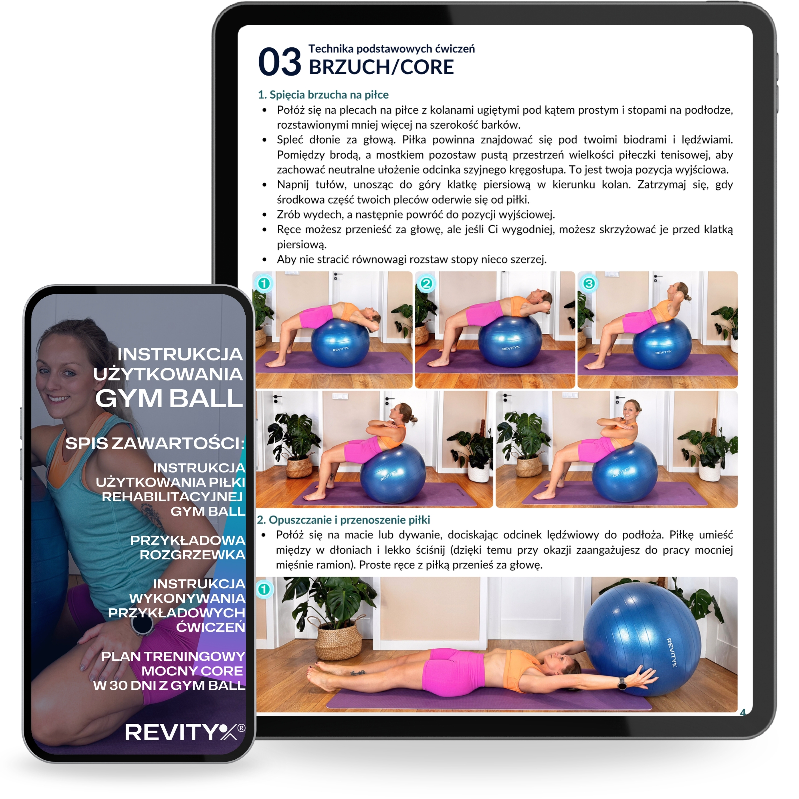 Z piłką otrzymujesz kompletną rozszerzoną instrukcję obsługi z atlasem ćwiczeń.