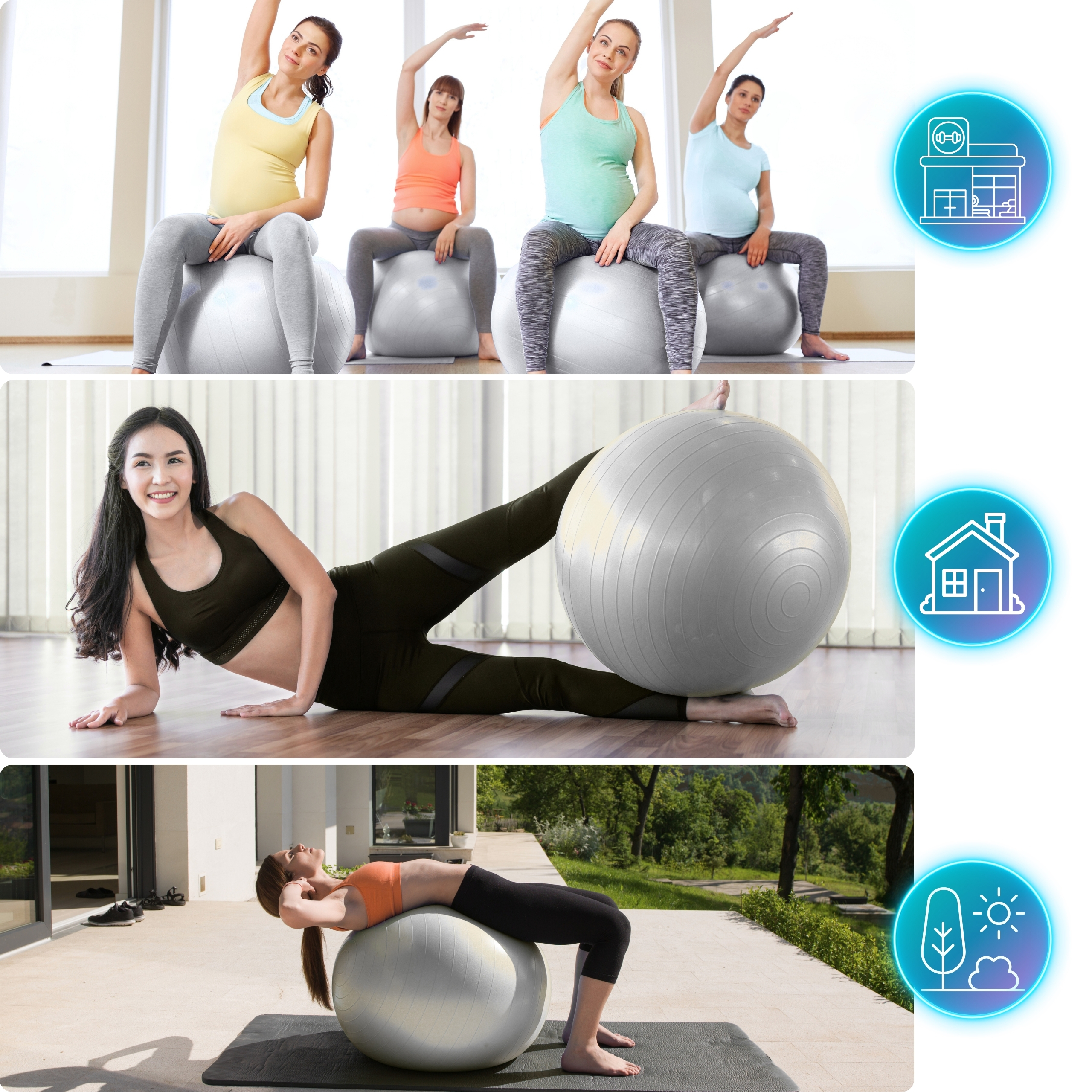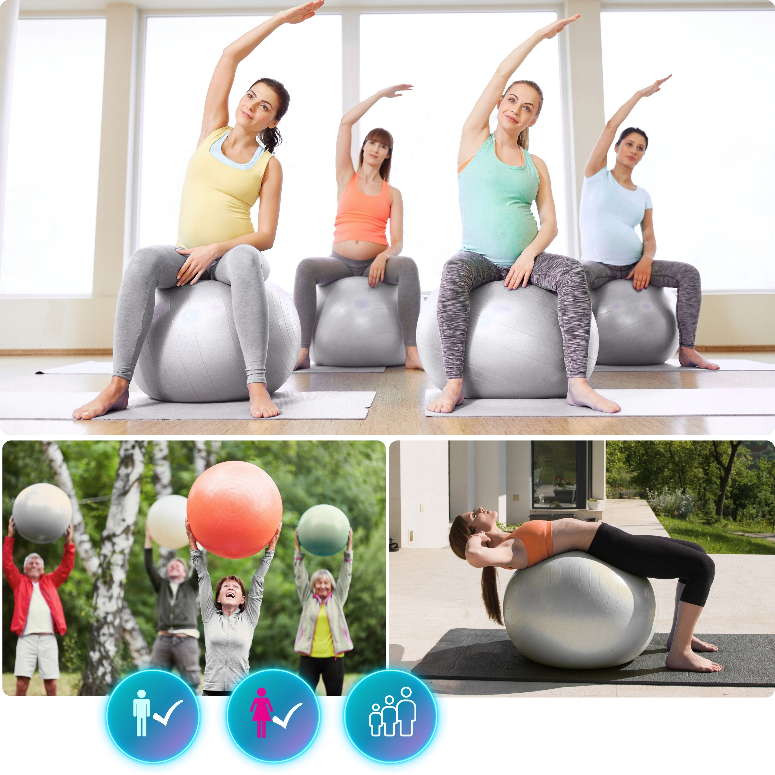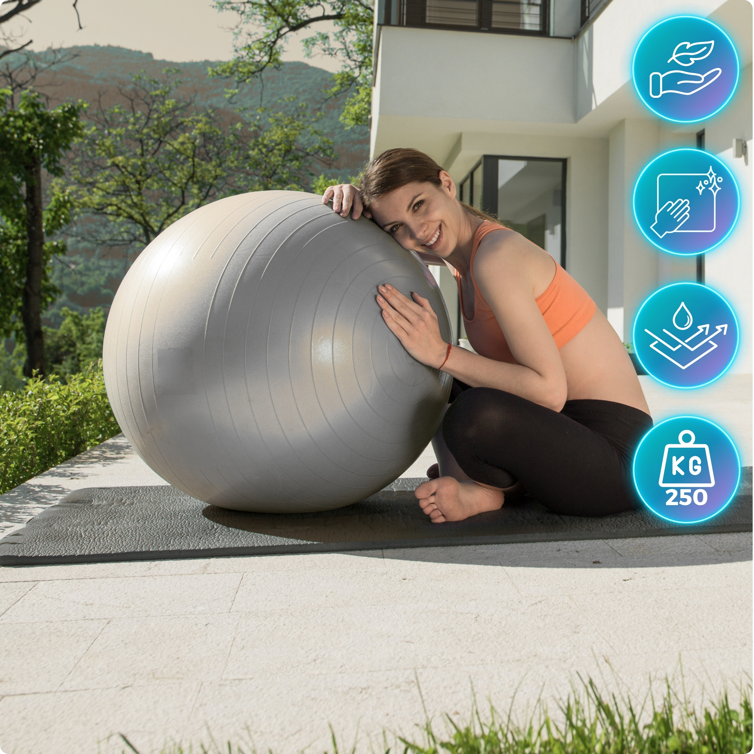 Ciąża to wyjątkowy czas dla każdej kobiety. Niewiele osób jednak mówi o tym, że ciąży towarzyszy obciążenie fizyczne i psychiczne. Piłka to jeden z niewielu przyrządów jakie poleca się właśnie kobietom w ciąży, aby zmobilizować do pracy mięśnie głębokie, które są odpowiedzialne za utrzymywanie prawidłowej postawy. Można na piłce siedzieć w ciągu dnia i odpoczywać, jak również wykonywać krótkie sesje ćwiczeń w pozycji siedzącej. Dzięki temu znacznie łatwiej po ciąży wrócisz do świetnej formy i nienagannej sylwetki. Pamiętaj, żeby przed użyciem skonsultować wszelkie przeciwwskazania ze swoim lekarzem.