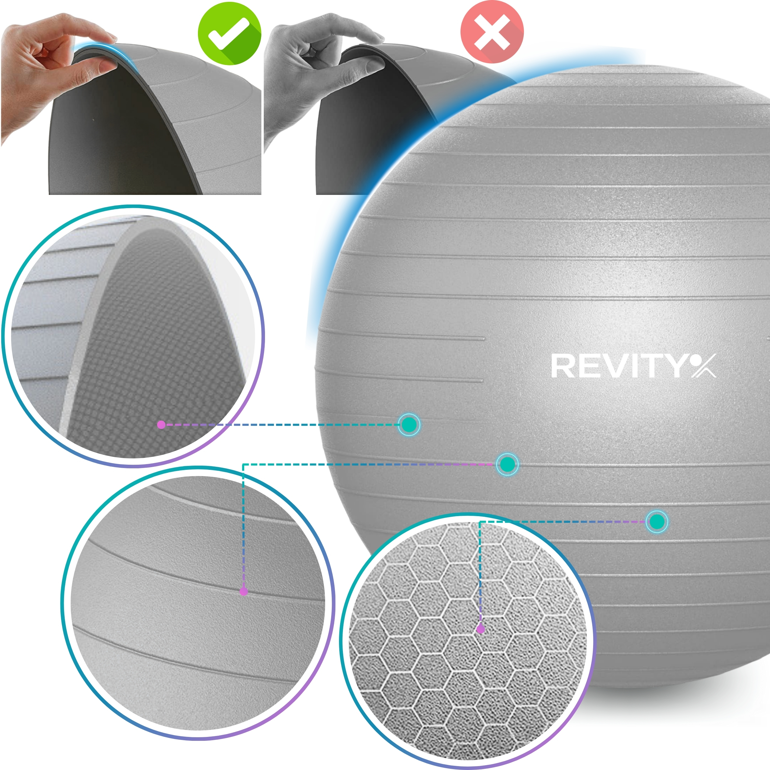 ✅ Innowacyjna struktura a'la plaster miodu, dzięki której piłka zachowuje kształt podczas ćwiczeń i jest odporna na uszkodzenia.