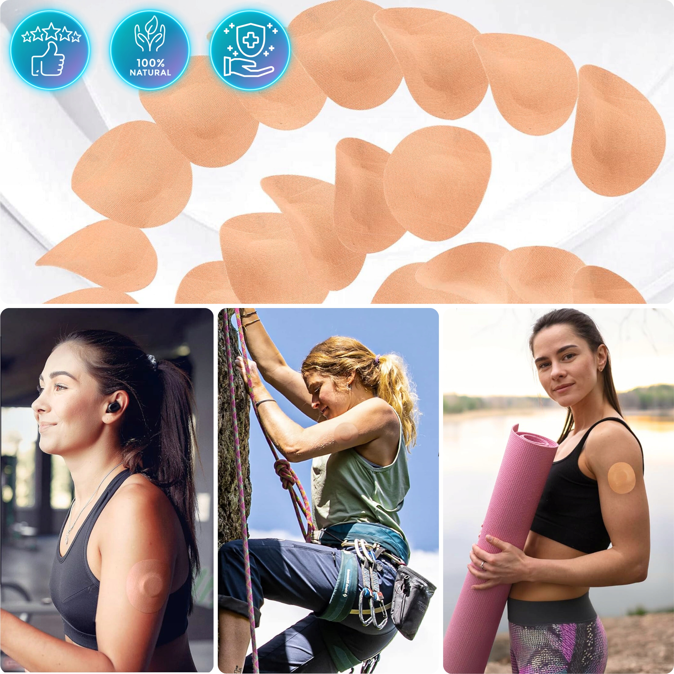 ✅ Plastry wykonano na bazie taśm kinezjologicznych z wysokiej jakości materiałów co sprawia, że skóra z łatwością może oddychać podczas, gdy naklejony jest na niej plaster. Plaster wykonano w uniwersalnym rozmiarze. Mocny splot taśmy sprawia, że po aplikacji plastry się nie strzępią.