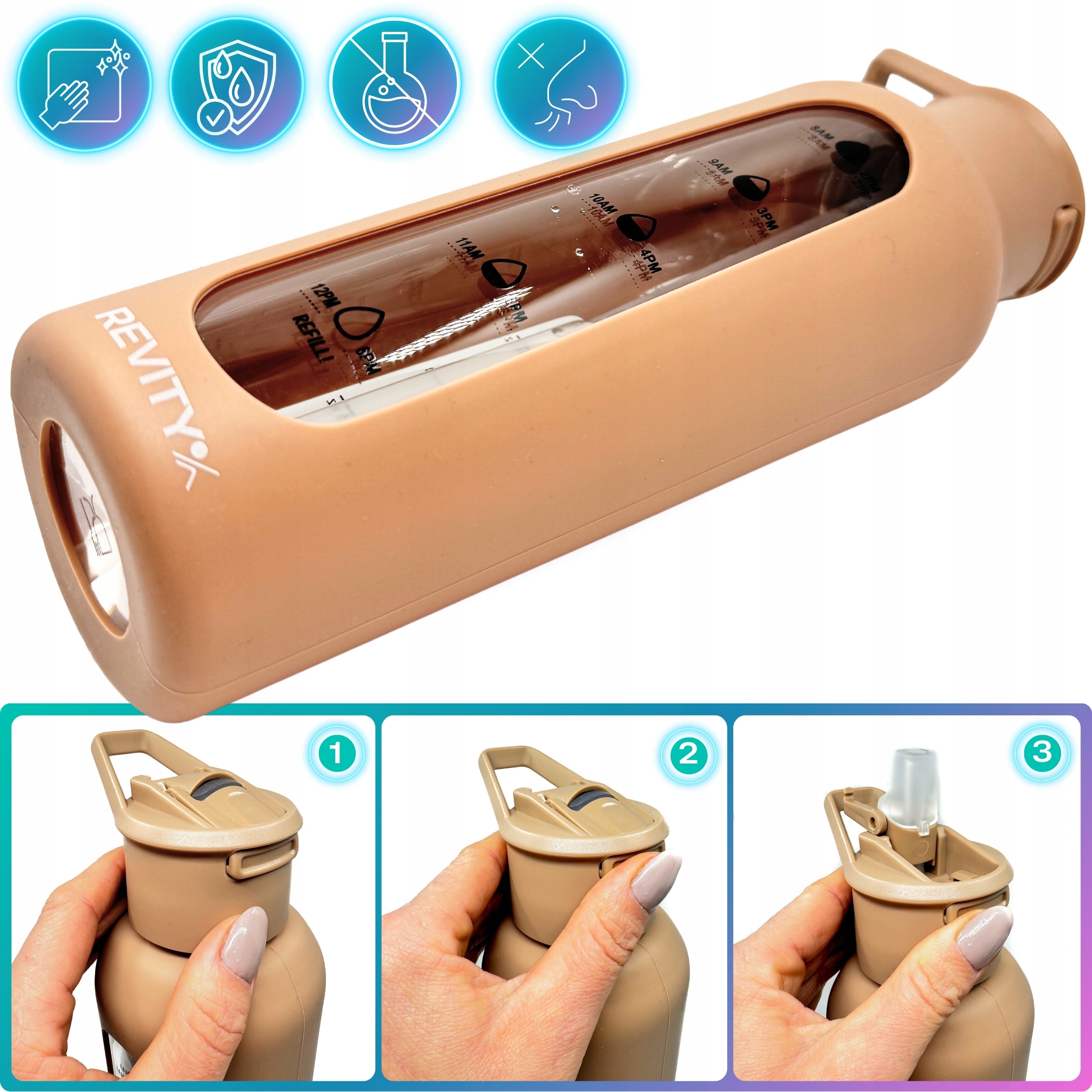 ✅ Automatyczne wieczko ze słomką, dzięki której możesz pić z butelki bez podnoszenia