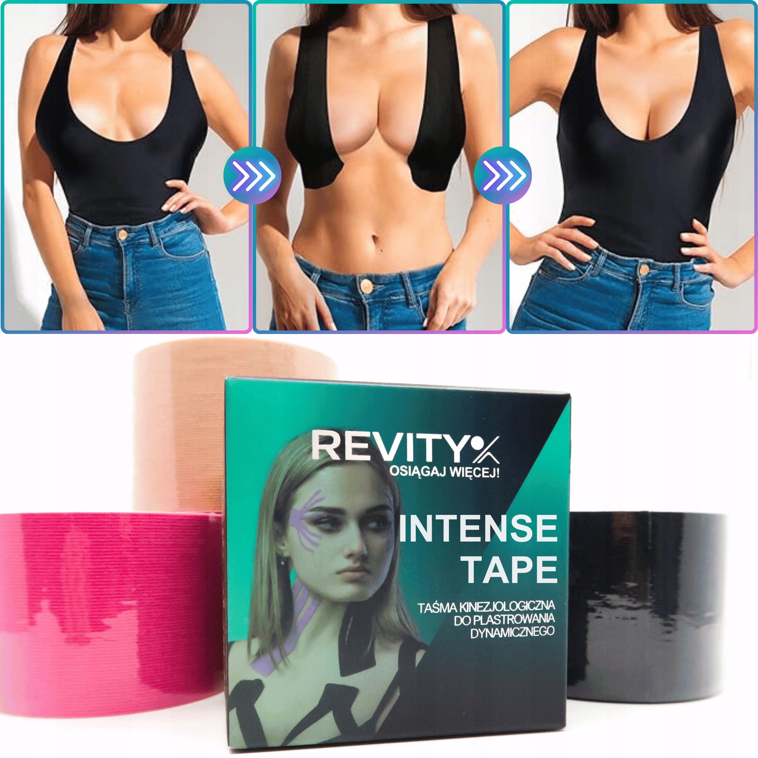 Taśma kinezjologiczna REVITY INTENSE TAPE to samoprzylepne plastry w rolce (potocznie tejpy, kinesio tape) służące do poprawiania ukrwienia i przepływu limfy w miejscu zastosowania plastra. Nasze tejpy znalazły uznanie wśród fanek naturalnych sposobów odmładzających ponieważ ich stosowanie nie wymaga trwałej ingerencji chirurgicznej.
