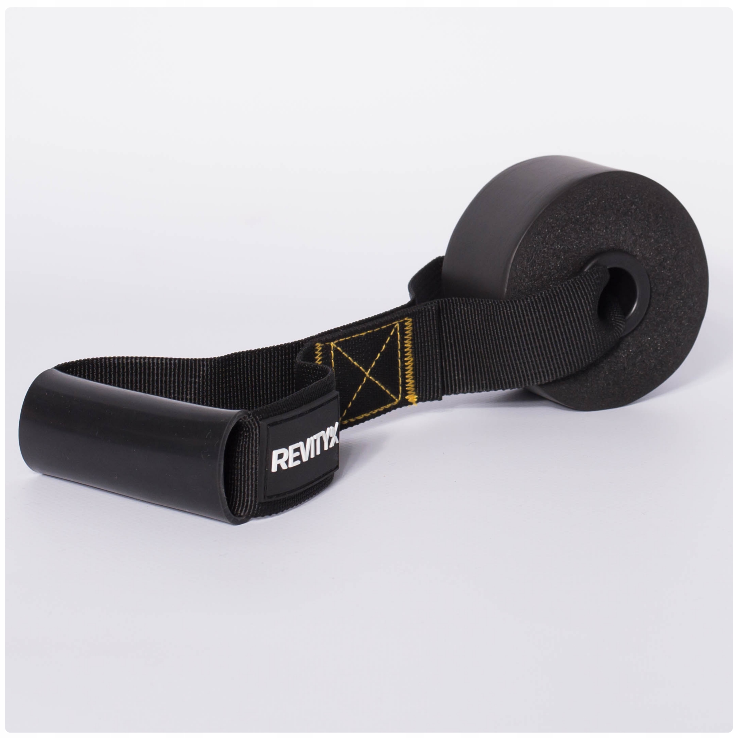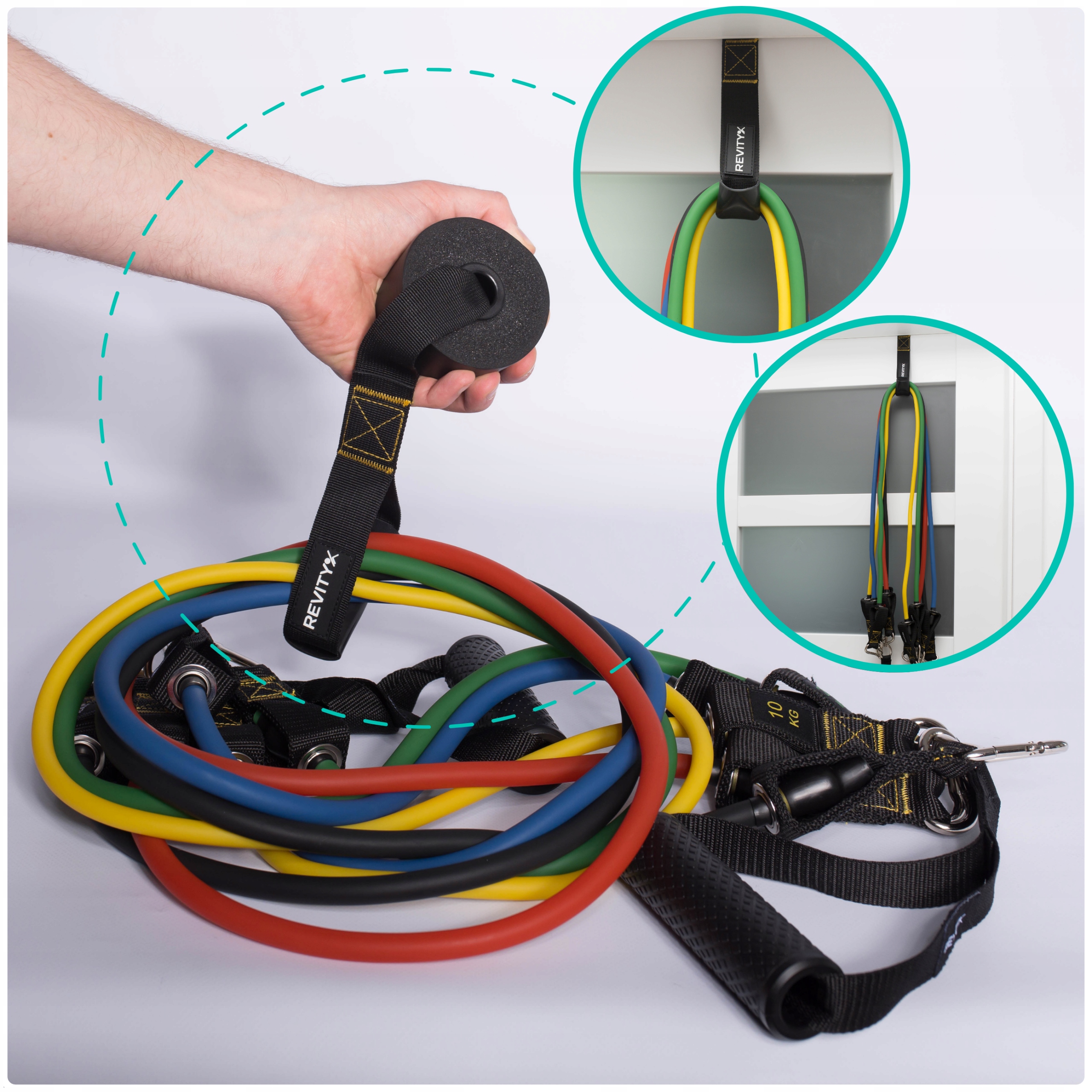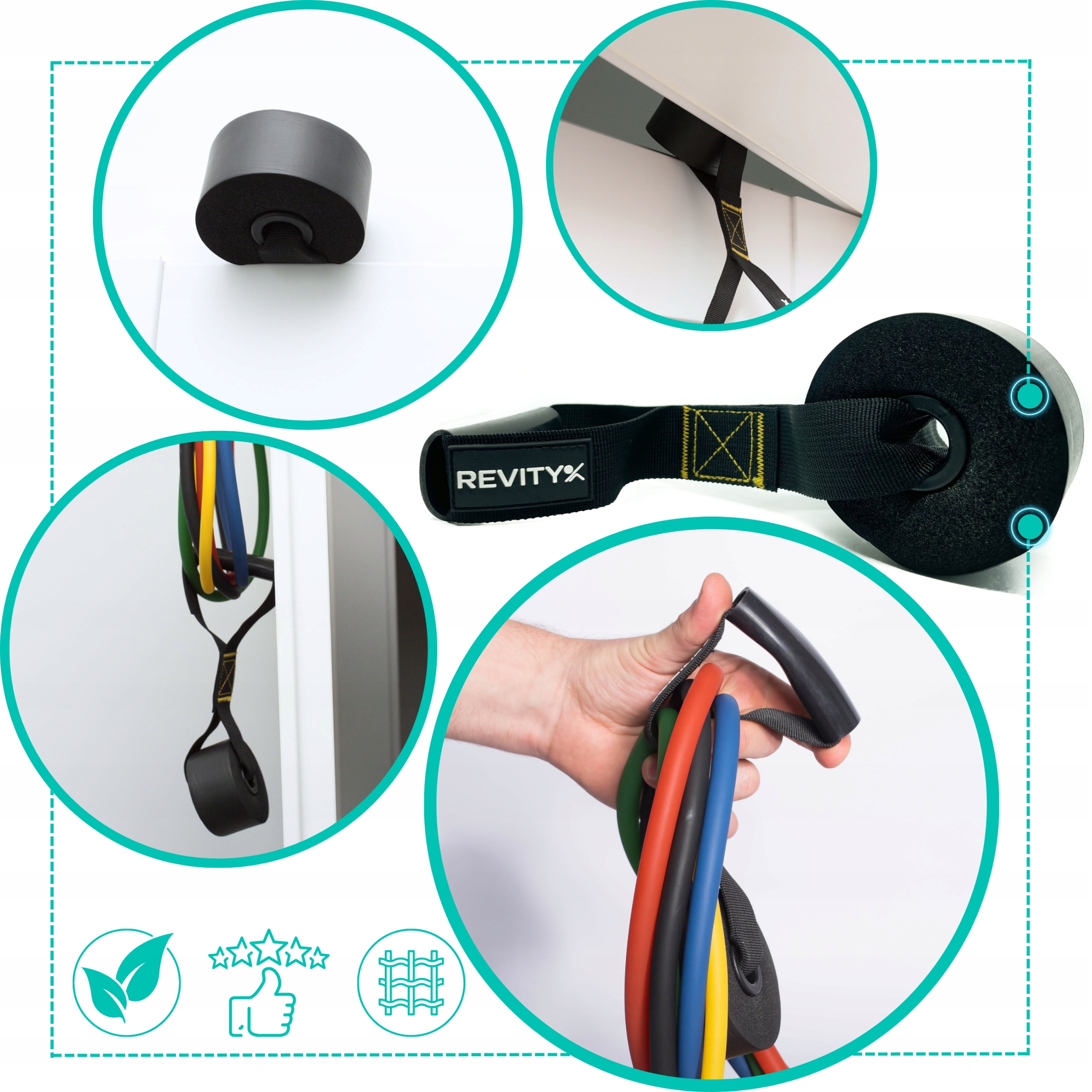 Wzmocniona kotwica drzwiowa Revity to praktyczny zaczep do treningu z gumami oporowymi, ekspanderami i taśmami treningowymi bez wiercenia i montażu na stałe. Duża, miękka „gąbka” po wewnętrznej stronie drzwi chroni ramę przed uszkodzeniami, a trwała taśma z metalowym D-ringiem pozwala szybkie wpięcie karabińczyka lub pętli gumy. Zewnętrzna osłonka zabezpiecza taśmę przed przetarciami w miejscu styku ze skrzydłem drzwi.