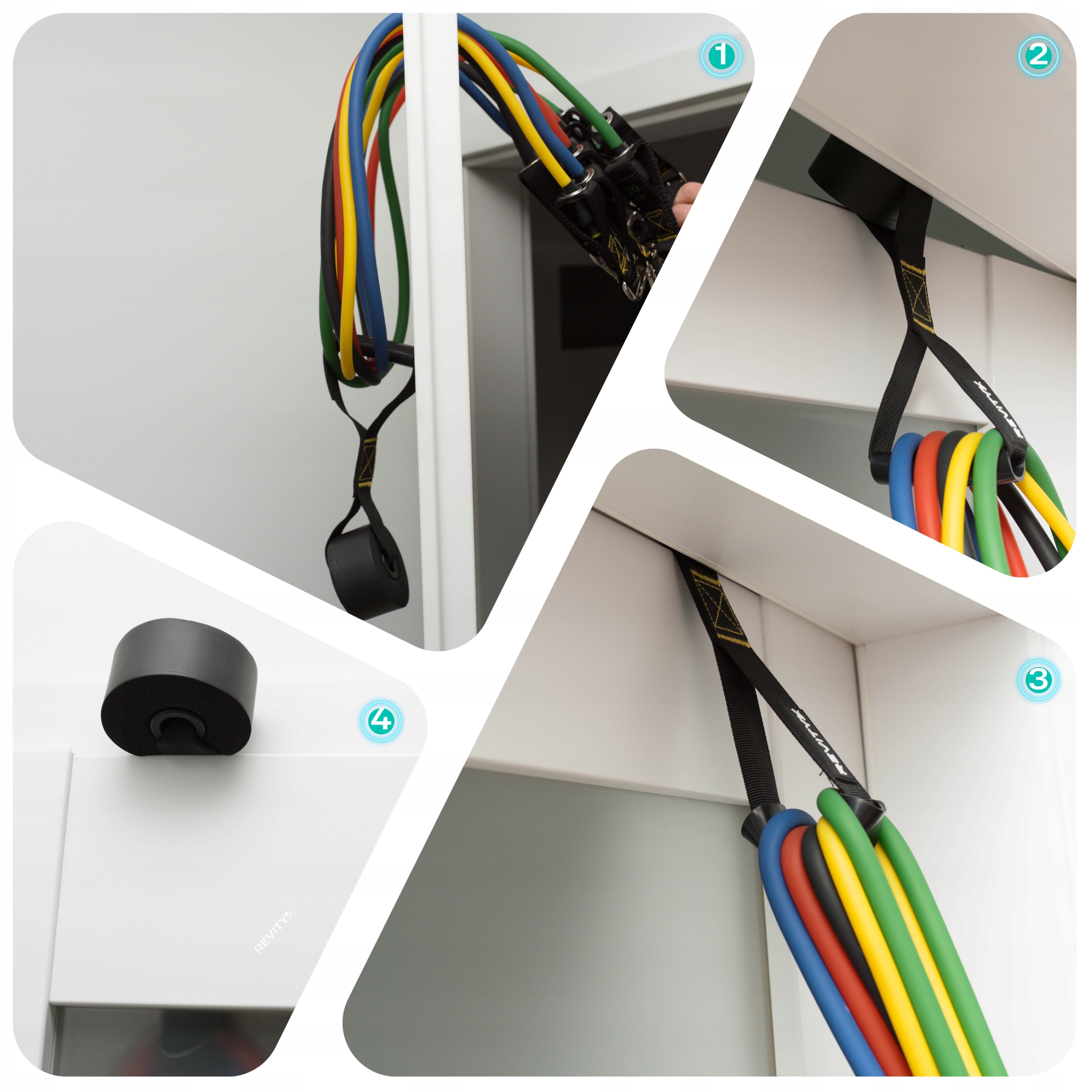 1 - Zakładasz gumy na uchwyt i przekładasz przez drzwi lub zakładasz sam uchwyt na drzwi. Pamiętaj, aby zrobić to po odpowiedniej stronie drzwi (tak, aby drzwi dociskać do zamknięcia)