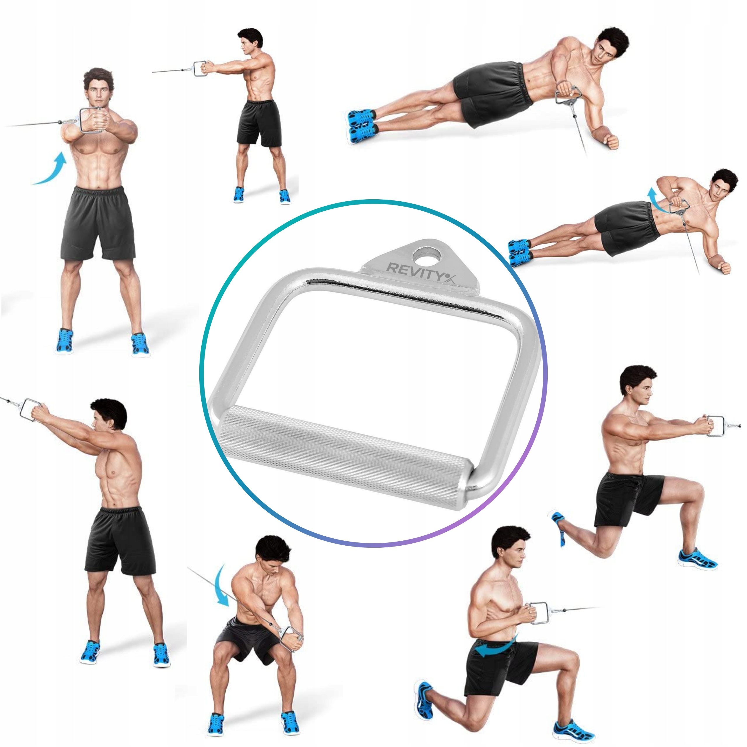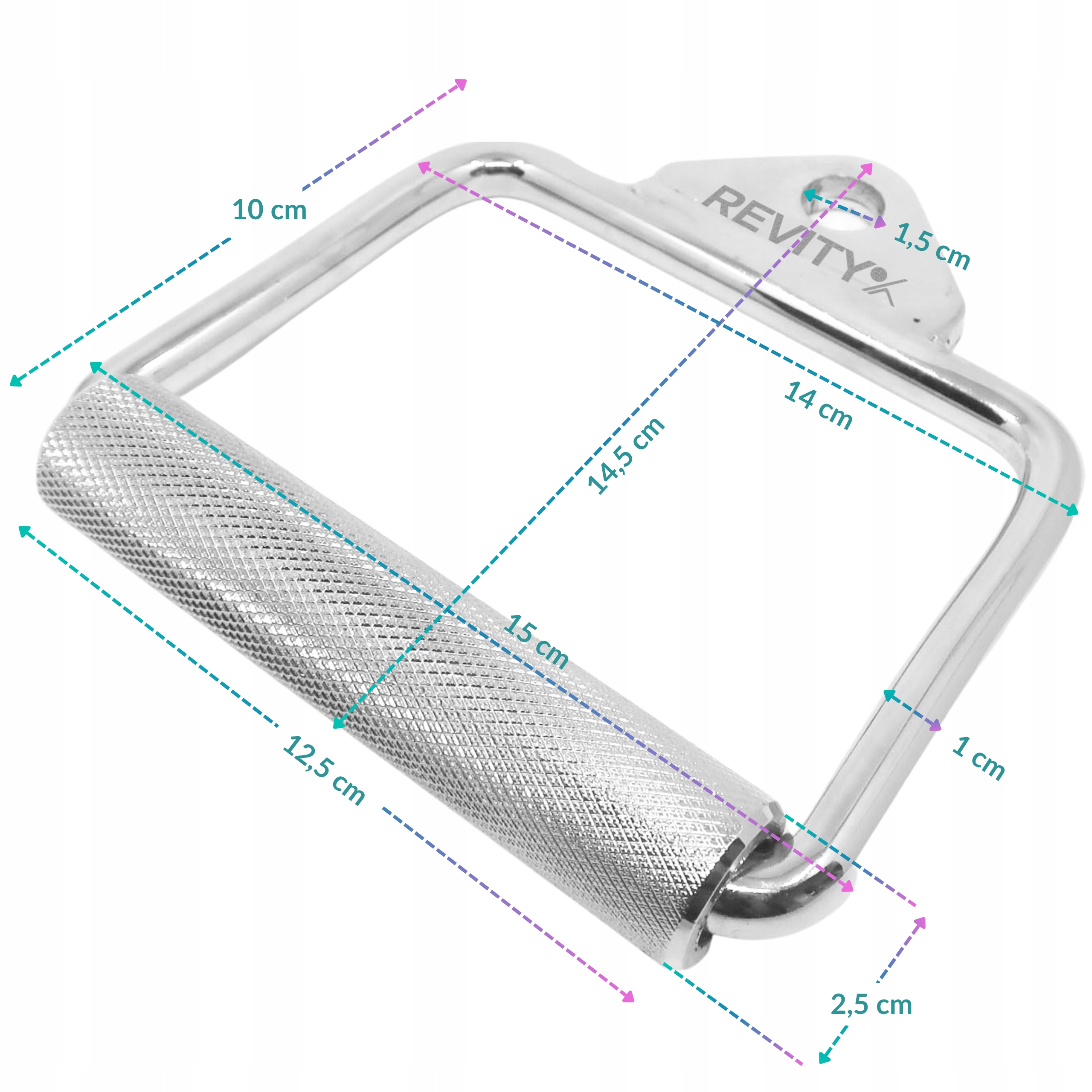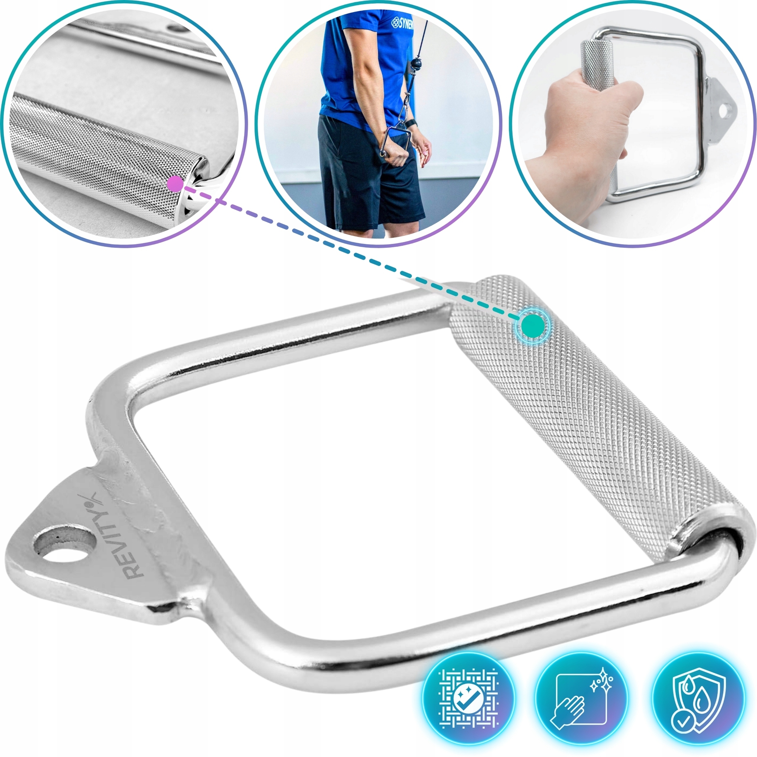 Stalowy uchwyt do wyciągu marki Revity to profesjonalne akcesorium treningowe przeznaczone do użytku z maszynami siłowymi wyposażonymi w system wyciągu górnego lub dolnego. Umożliwia wykonywanie szeregu ćwiczeń wzmacniających górne i środkowe partie ciała. Dzięki swojej konstrukcji zapewnia wygodny, bezpieczny i stabilny chwyt, nawet przy dużych obciążeniach. Obrotowa rączka 360° i radełkowanie zapewnia maksymalny komfort podczas ćwiczeń. Jest to niezbędny element wyposażenia każdej domowej i profesjonalnej siłowni, który pozwala zróżnicować trening i poprawić jego efektywność.