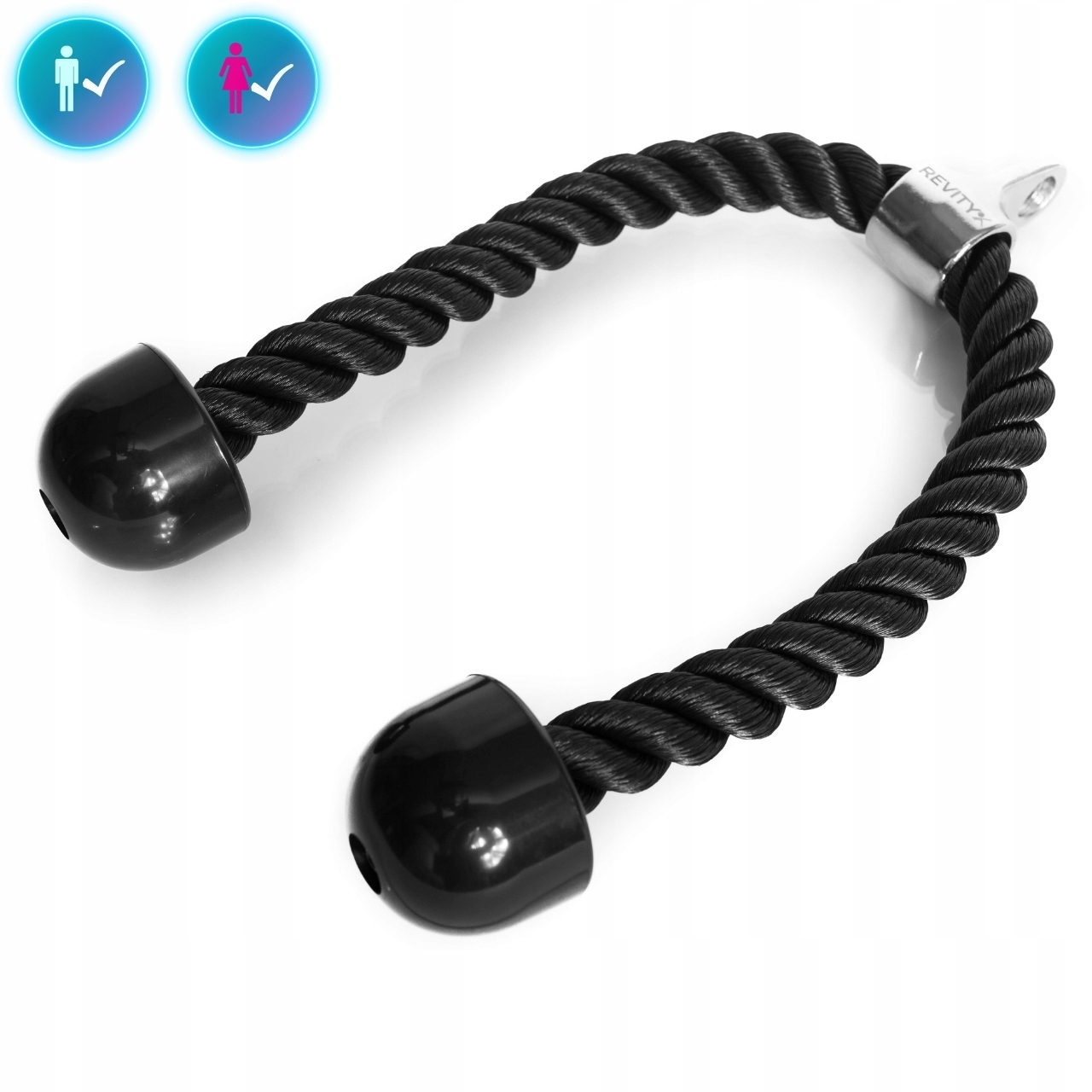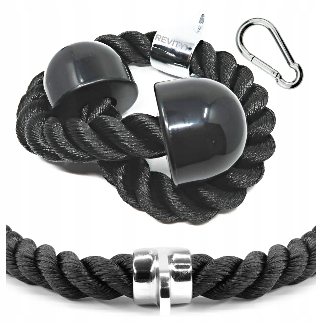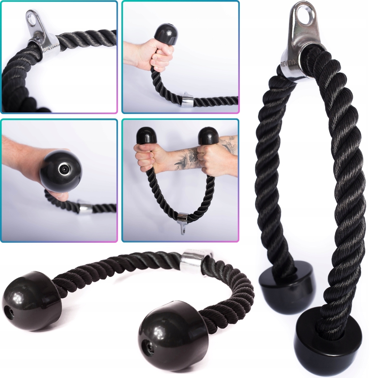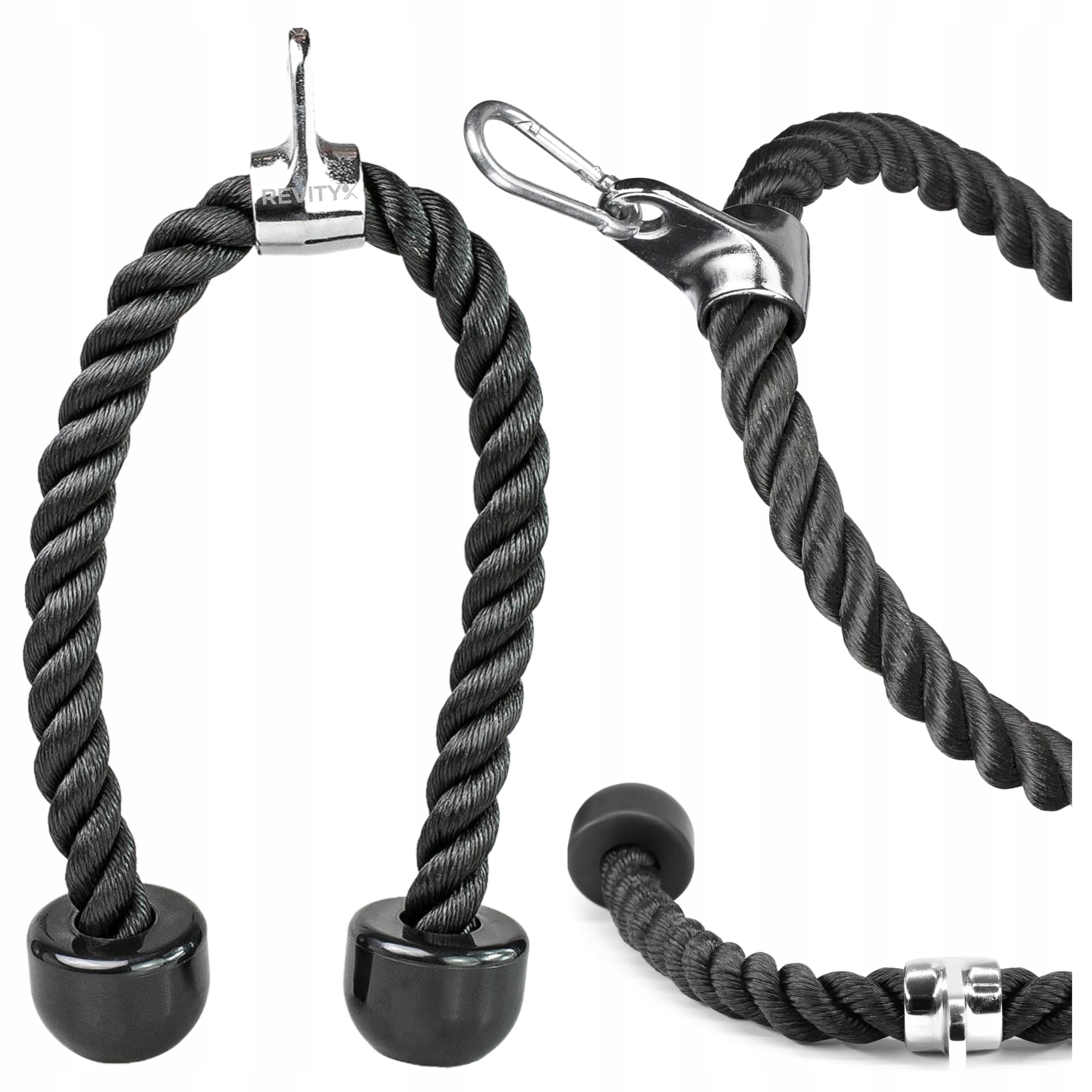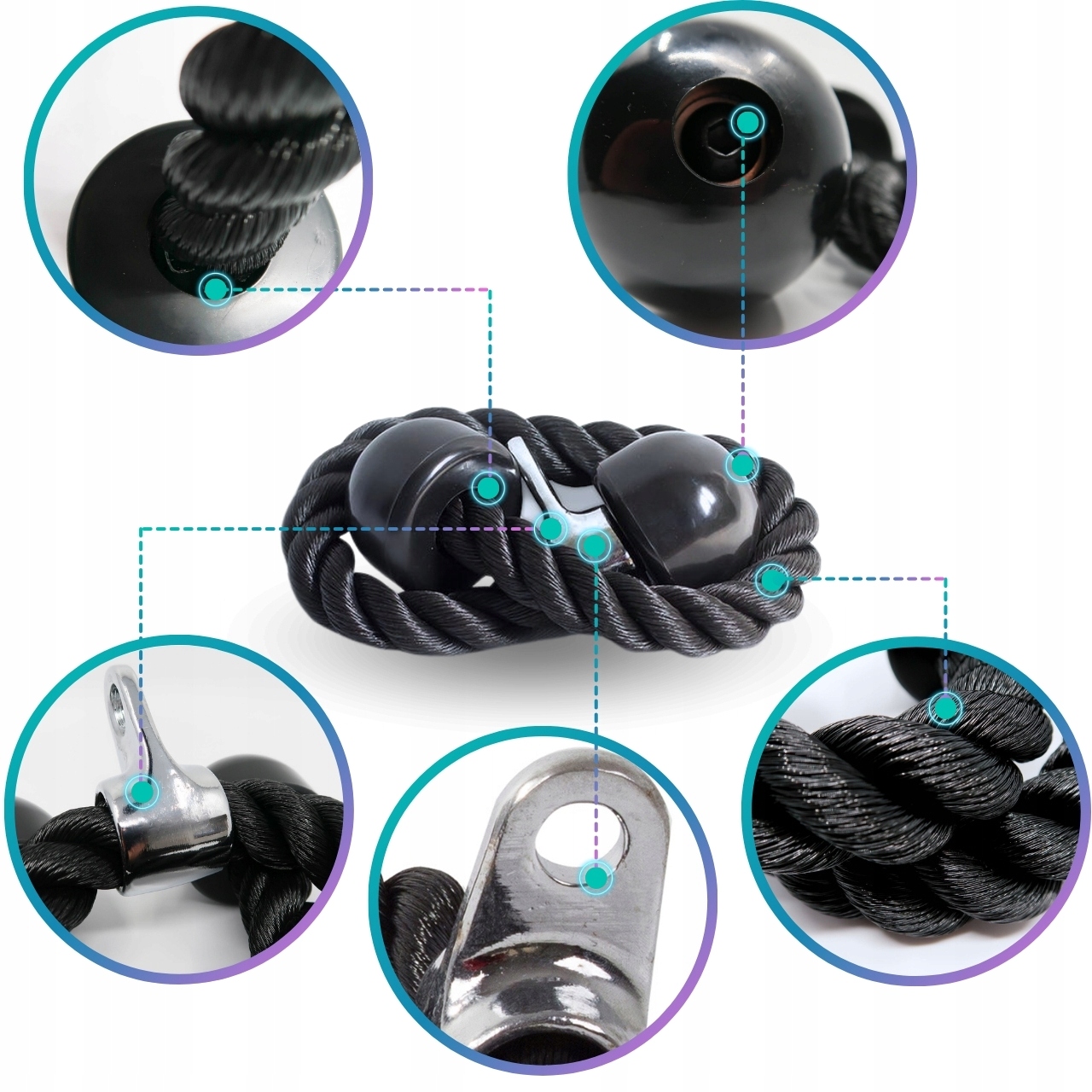 Sznur do wyciągu na triceps z solidnym, plecionym „warkoczem” i gumowymi zakończeniami zapewnia pewny, wygodny chwyt w prostowaniach, face pull i ściąganiach do brzucha. Obrotowe mocowanie z oczkiem oraz karabińczyk w zestawie pozwalają szybko wpiąć uchwyt do linki wyciągu górnego lub dolnego i płynnie prowadzić ruch bez zbędnego skręcania nadgarstków.