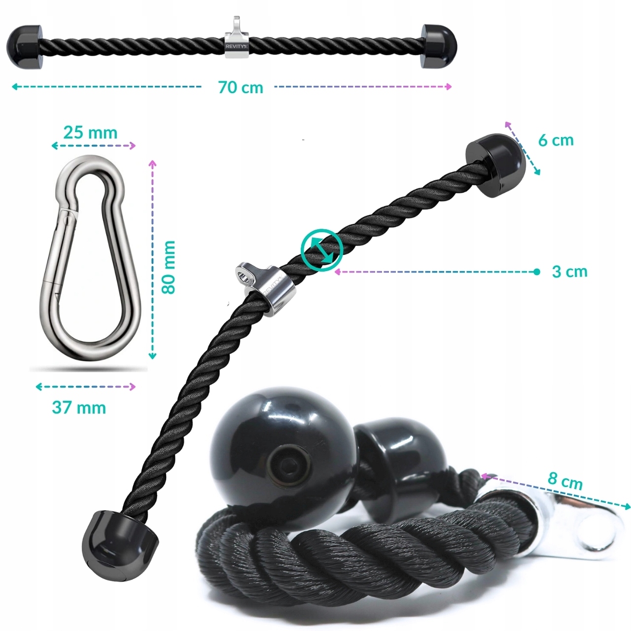 ✅ Długość liny to 70 cm, średnica liny to 3 cm, a średnica ogranicznika to 6 cm, długość stalowego zaczepu to 8 cm